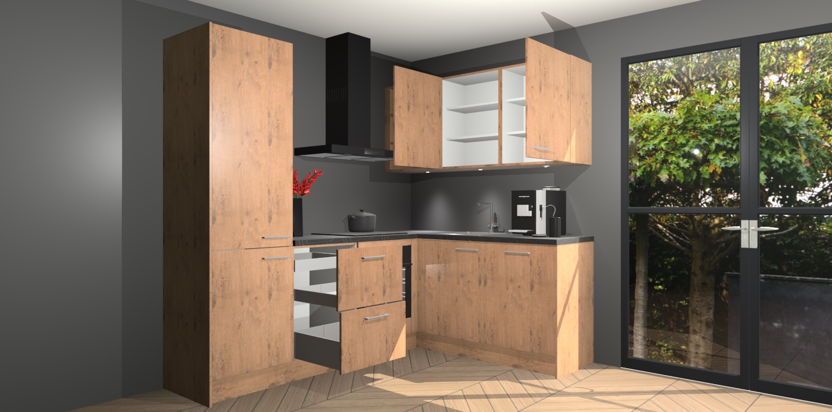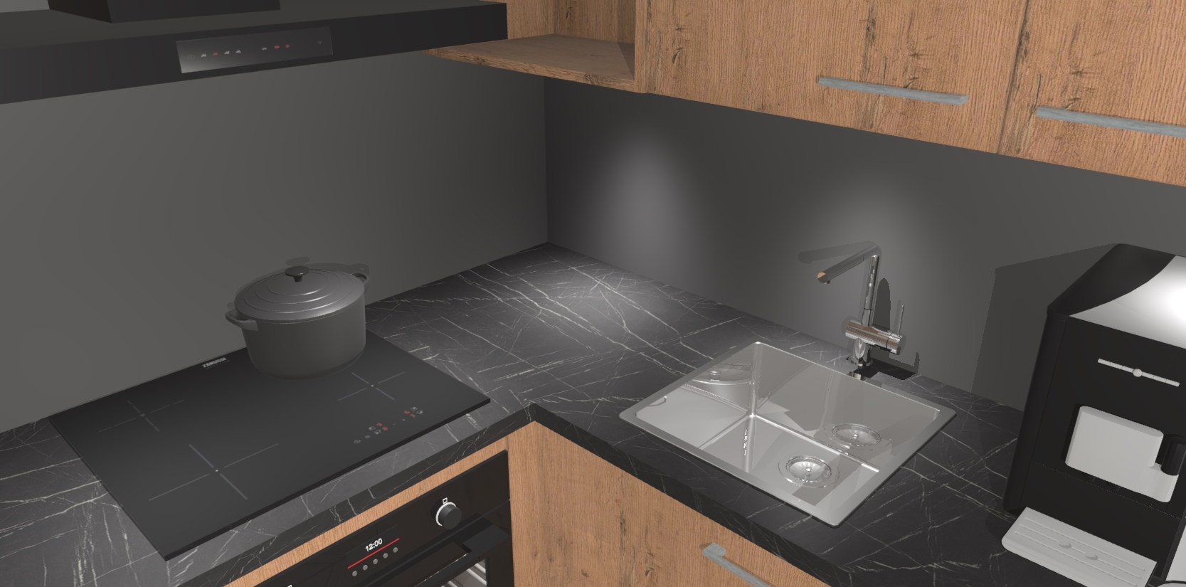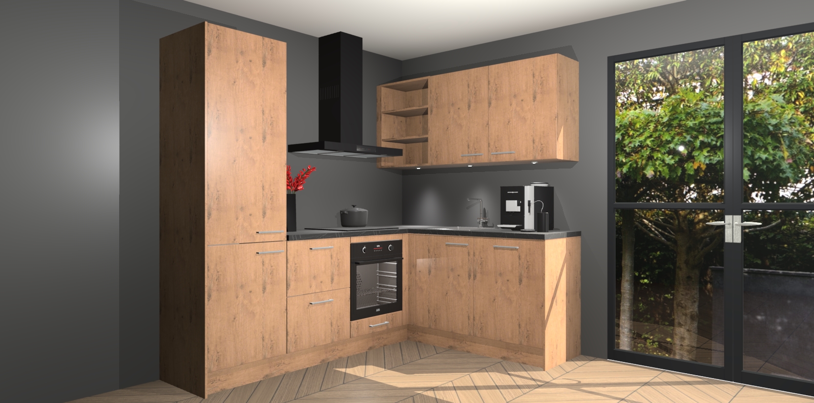 Wauw, dit is de Astoria Eiken keuken Pilsen! U kunt gerust zeggen dat u elegantie combineert met functionaliteit met deze keuken. Met een modern en chique ontwerp is de keuken precies wat u nodig heeft om uw ruimte te verfraaien. De binnenzijde van de kasten is in dezelfde donkere kleur als de buitenzijde voor een uniforme look, compleet met softclose-kasten die stil sluiten.