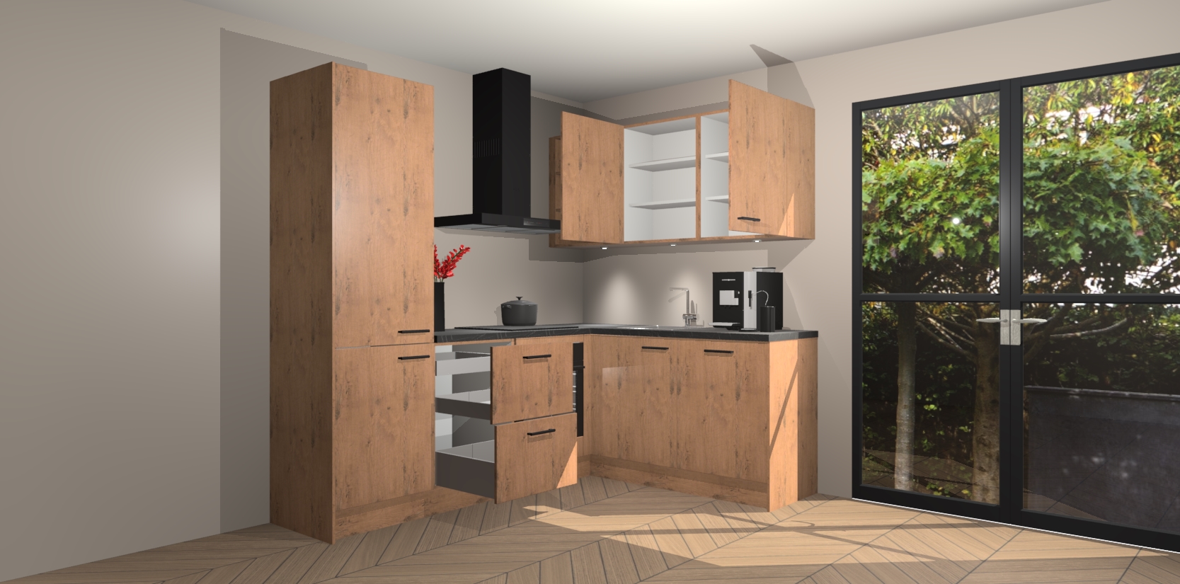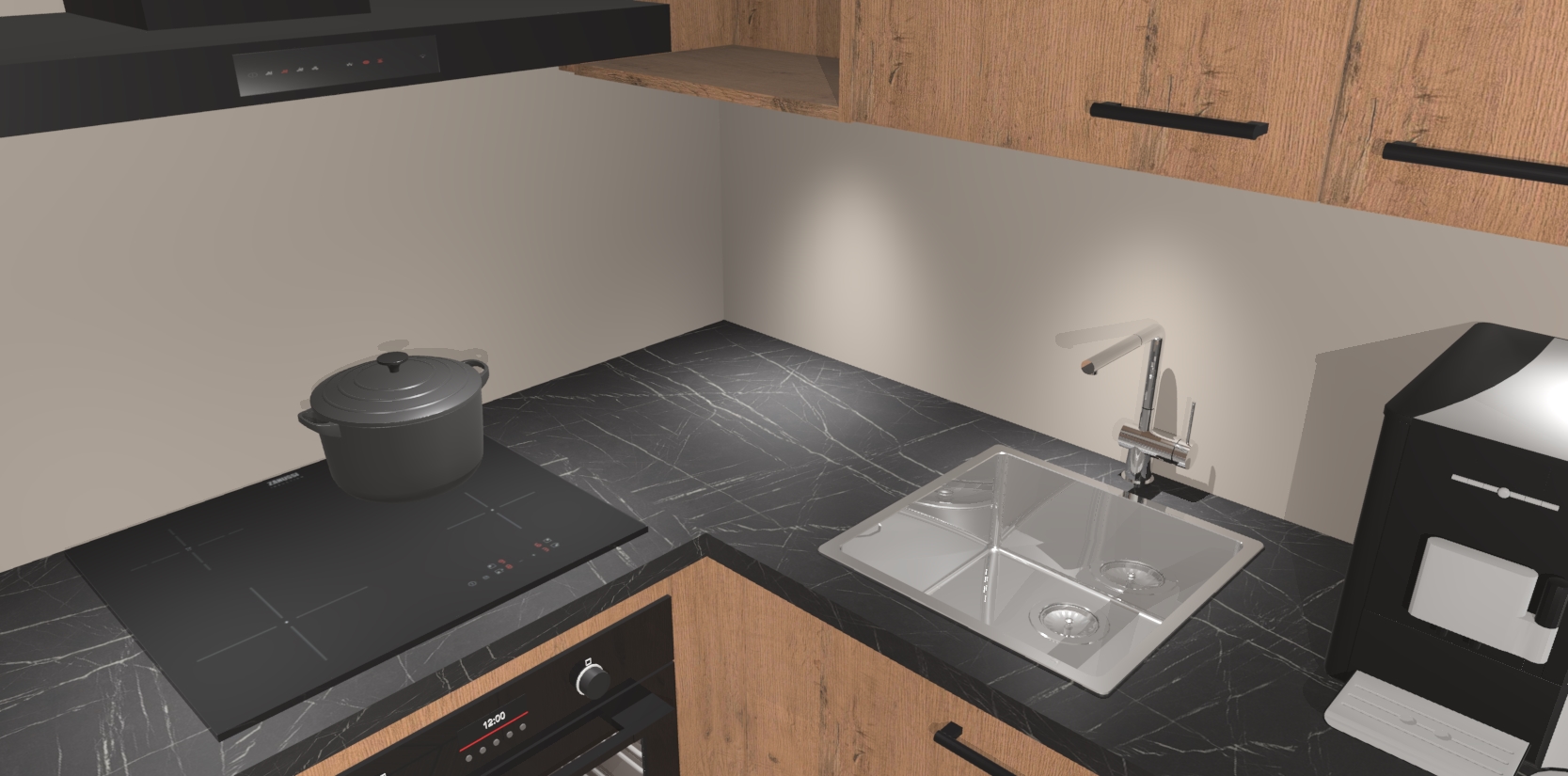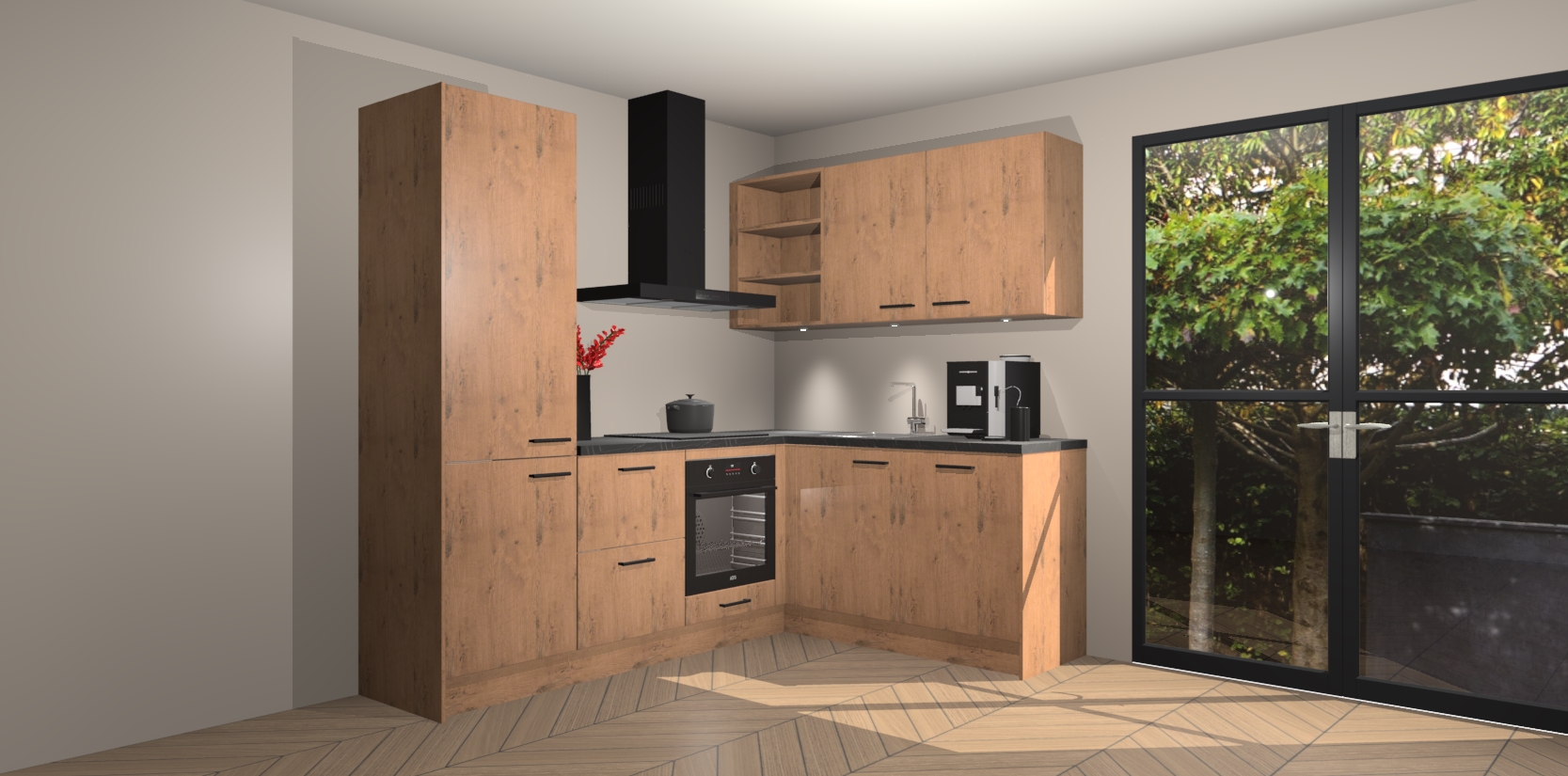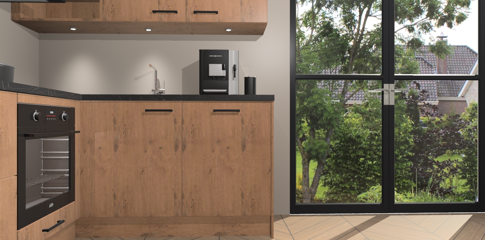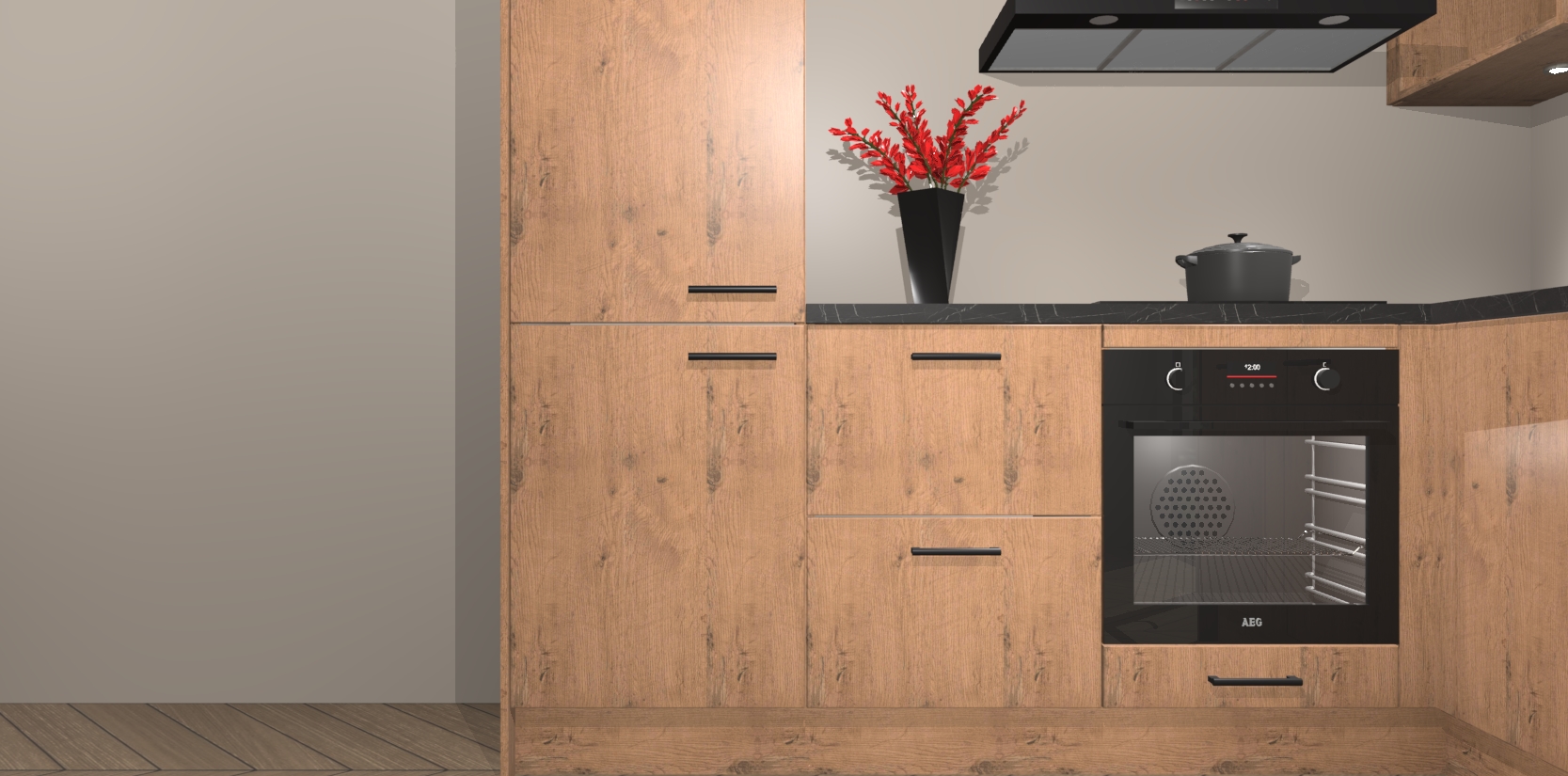 Wauw, dit is de Astoria Eiken keuken Pilsen! U kunt gerust zeggen dat u elegantie combineert met functionaliteit met deze keuken. Met een modern en chique ontwerp is de keuken precies wat u nodig heeft om uw ruimte te verfraaien. De binnenzijde van de kasten is in dezelfde donkere kleur als de buitenzijde voor een uniforme look, compleet met softclose-kasten die stil sluiten.