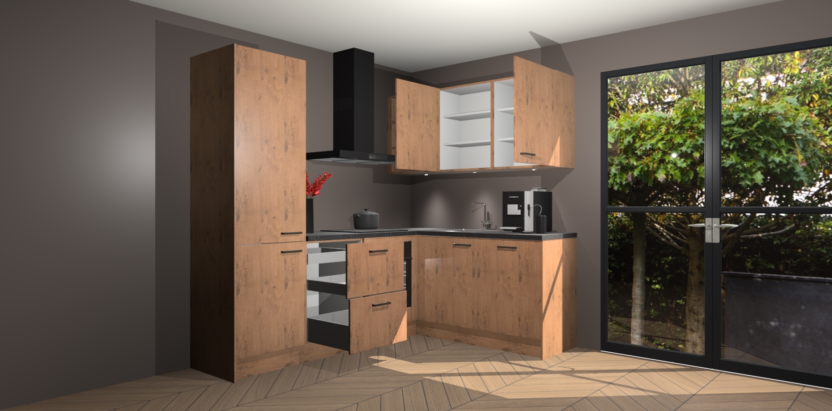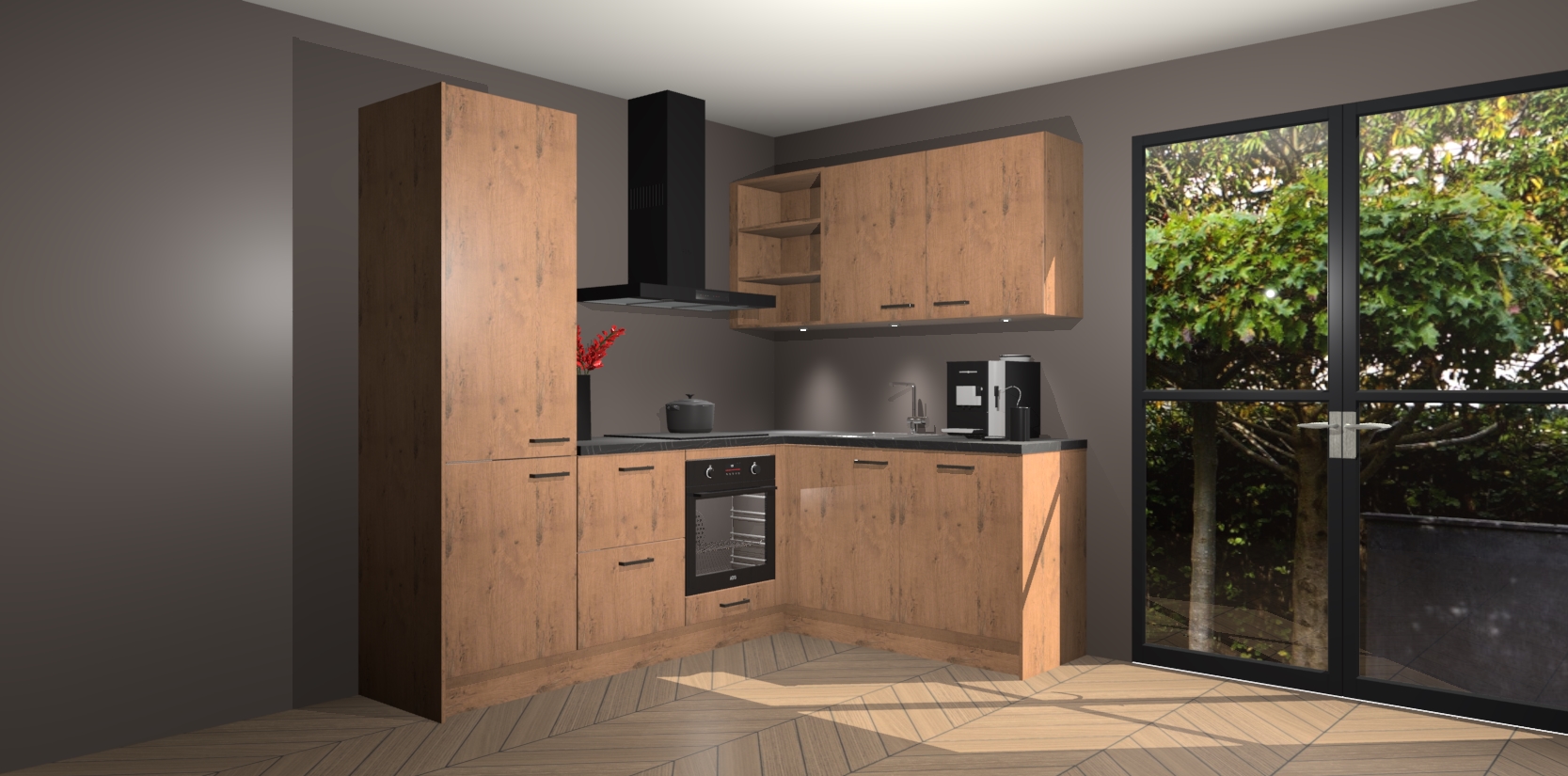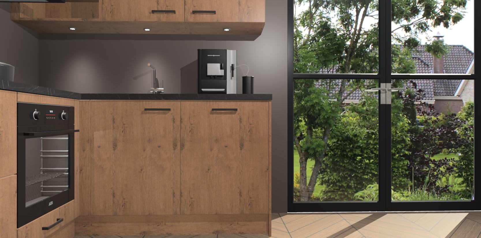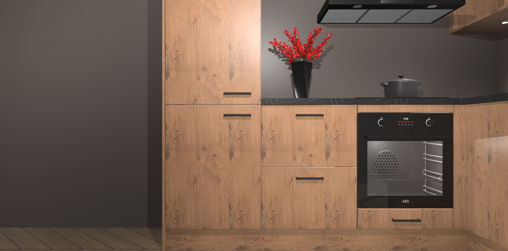 Wauw, dit is de Astoria Eiken keuken Pilsen! U kunt gerust zeggen dat u elegantie combineert met functionaliteit met deze keuken. Met een modern en chique ontwerp is de keuken precies wat u nodig heeft om uw ruimte te verfraaien. De binnenzijde van de kasten is in dezelfde donkere kleur als de buitenzijde voor een uniforme look, compleet met softclose-kasten die stil sluiten.