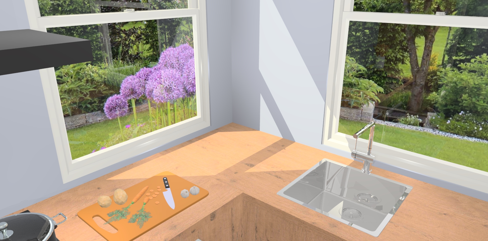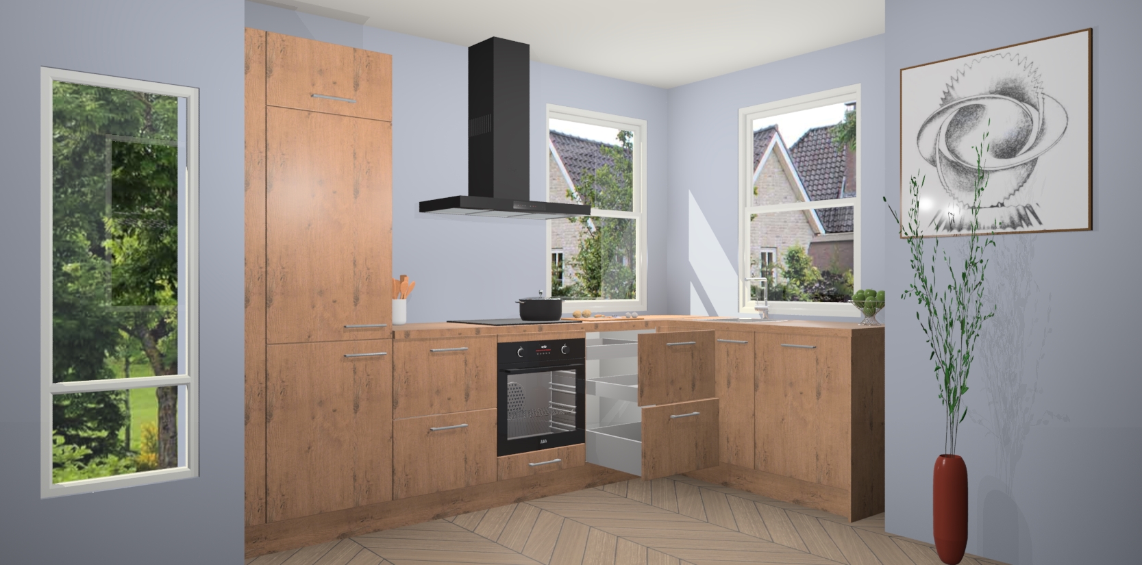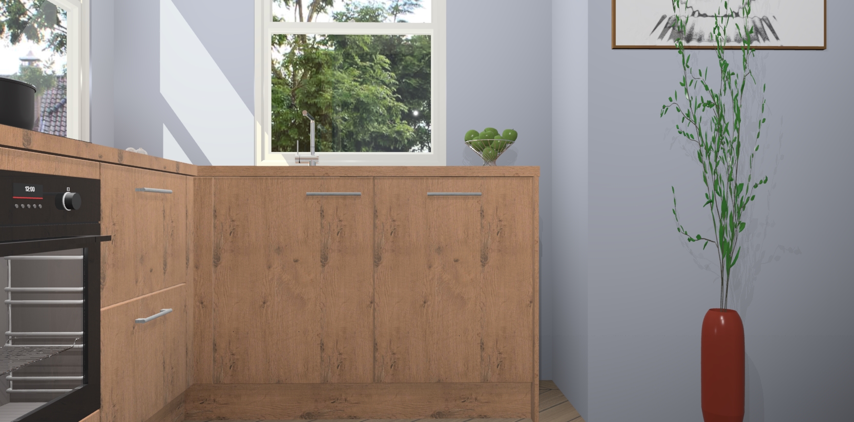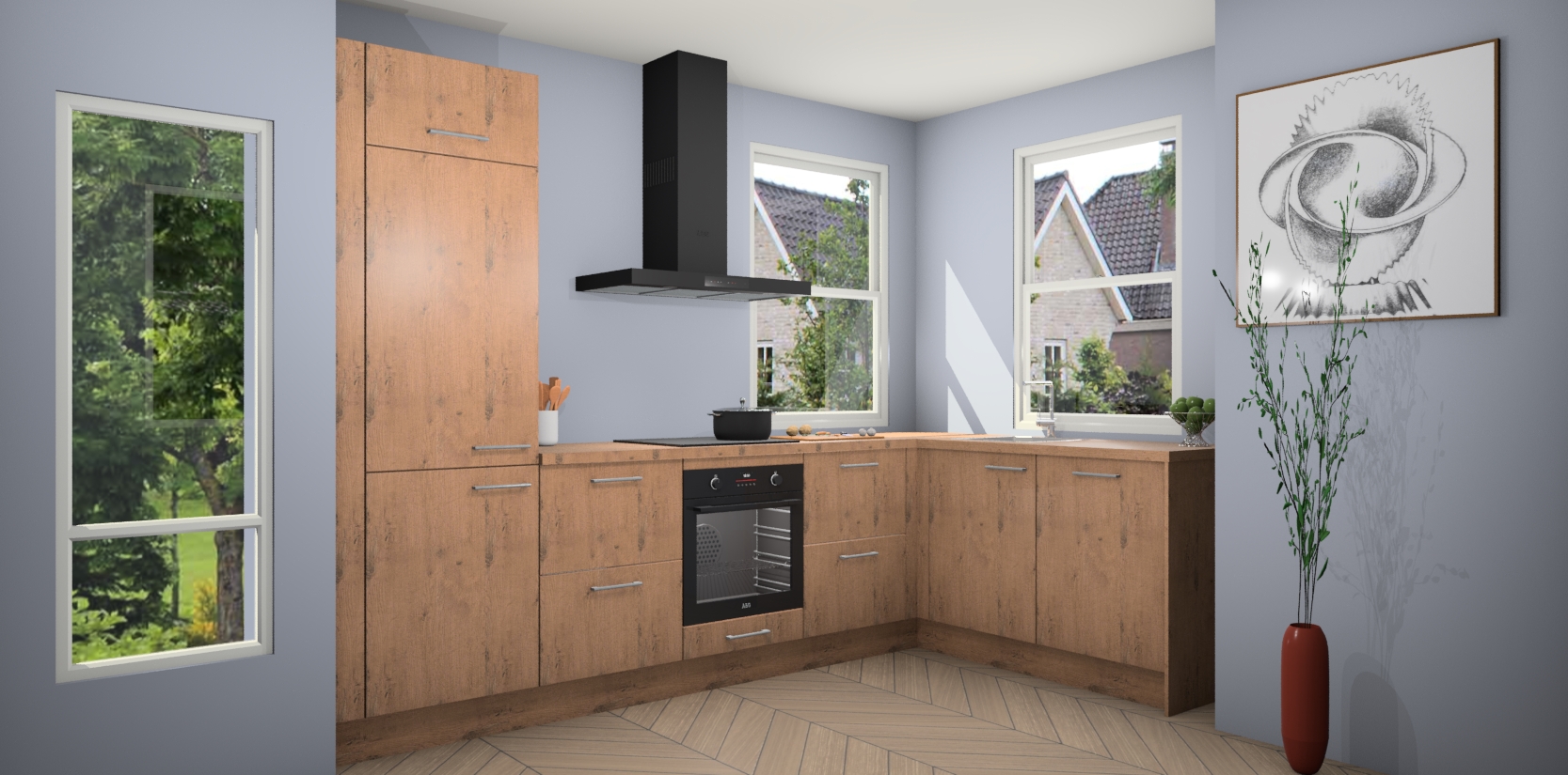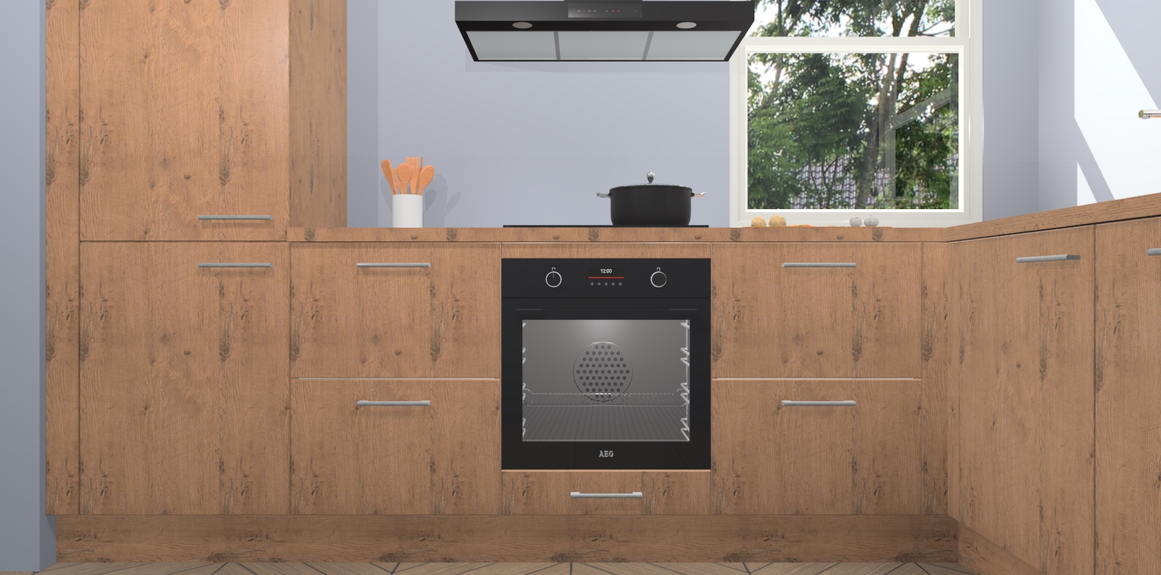 Wat maakt deze keuken zo bijzonder? Ten eerste geeft het houten werkblad uw ruimte een onmiskenbaar klassieke uitstraling. De natuurlijke afwerking roept warmte en elegantie op die nooit uit de mode zullen raken. Bovendien is het gemakkelijk schoon te houden en te onderhouden, zodat je er jarenlang plezier van kunt hebben. Als u op zoek bent naar extra gemak in uw keuken, dan heeft u bij het plaatsen van een bestelling bij ons ook de optie om uw toestellen te upgraden naar AEG-modellen - zo haalt u moderne innovatie van topmerken in apparatentechnologie rechtstreeks in huis.