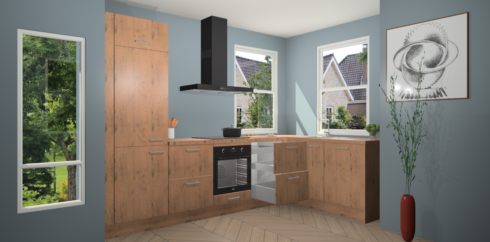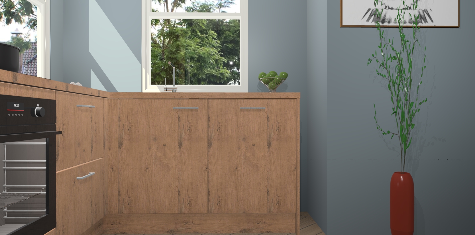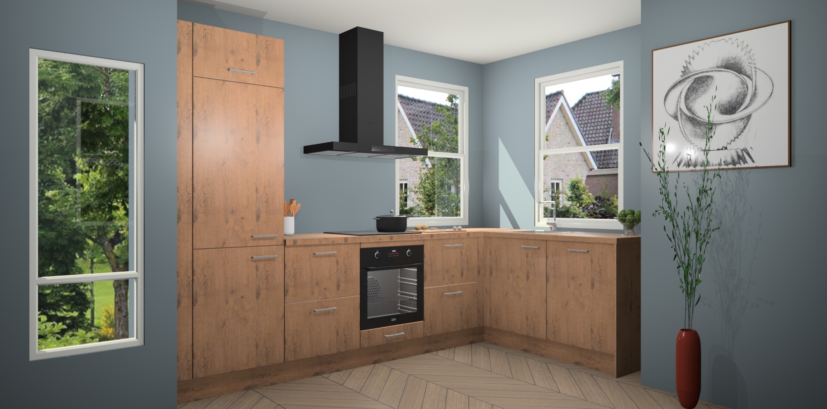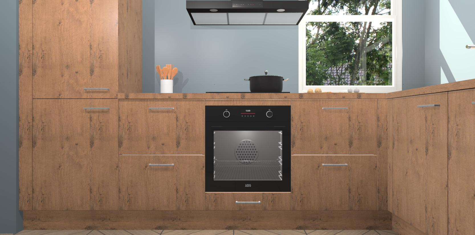 Wat maakt deze keuken zo bijzonder? Ten eerste geeft het houten werkblad uw ruimte een onmiskenbaar klassieke uitstraling. De natuurlijke afwerking roept warmte en elegantie op die nooit uit de mode zullen raken. Bovendien is het gemakkelijk schoon te houden en te onderhouden, zodat je er jarenlang plezier van kunt hebben. Als u op zoek bent naar extra gemak in uw keuken, dan heeft u bij het plaatsen van een bestelling bij ons ook de optie om uw toestellen te upgraden naar AEG-modellen - zo haalt u moderne innovatie van topmerken in apparatentechnologie rechtstreeks in huis.