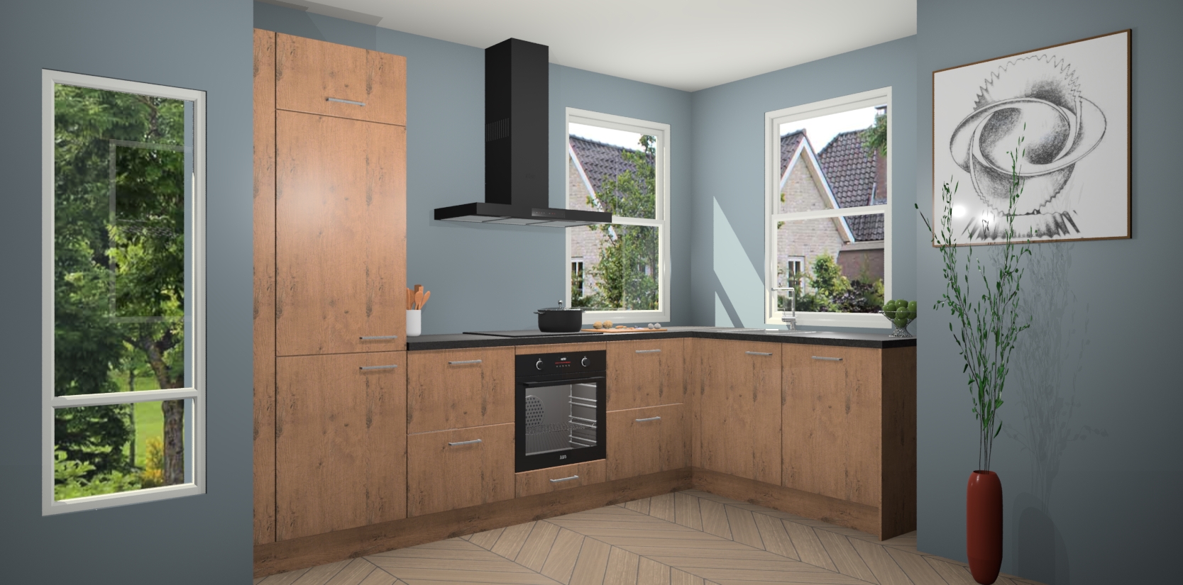 Wat maakt deze keuken zo bijzonder? Ten eerste geeft het houten werkblad uw ruimte een onmiskenbaar klassieke uitstraling. De natuurlijke afwerking roept warmte en elegantie op die nooit uit de mode zullen raken. Bovendien is het gemakkelijk schoon te houden en te onderhouden, zodat je er jarenlang plezier van kunt hebben. Als u op zoek bent naar extra gemak in uw keuken, dan heeft u bij het plaatsen van een bestelling bij ons ook de optie om uw toestellen te upgraden naar AEG-modellen - zo haalt u moderne innovatie van topmerken in apparatentechnologie rechtstreeks in huis.