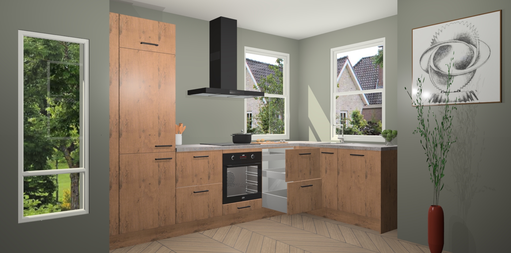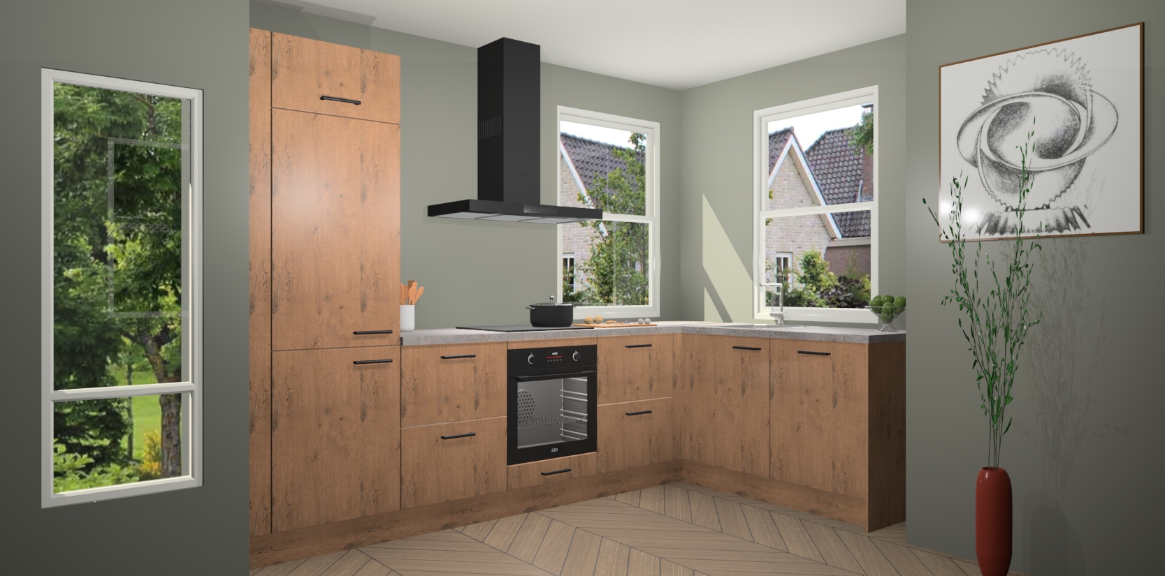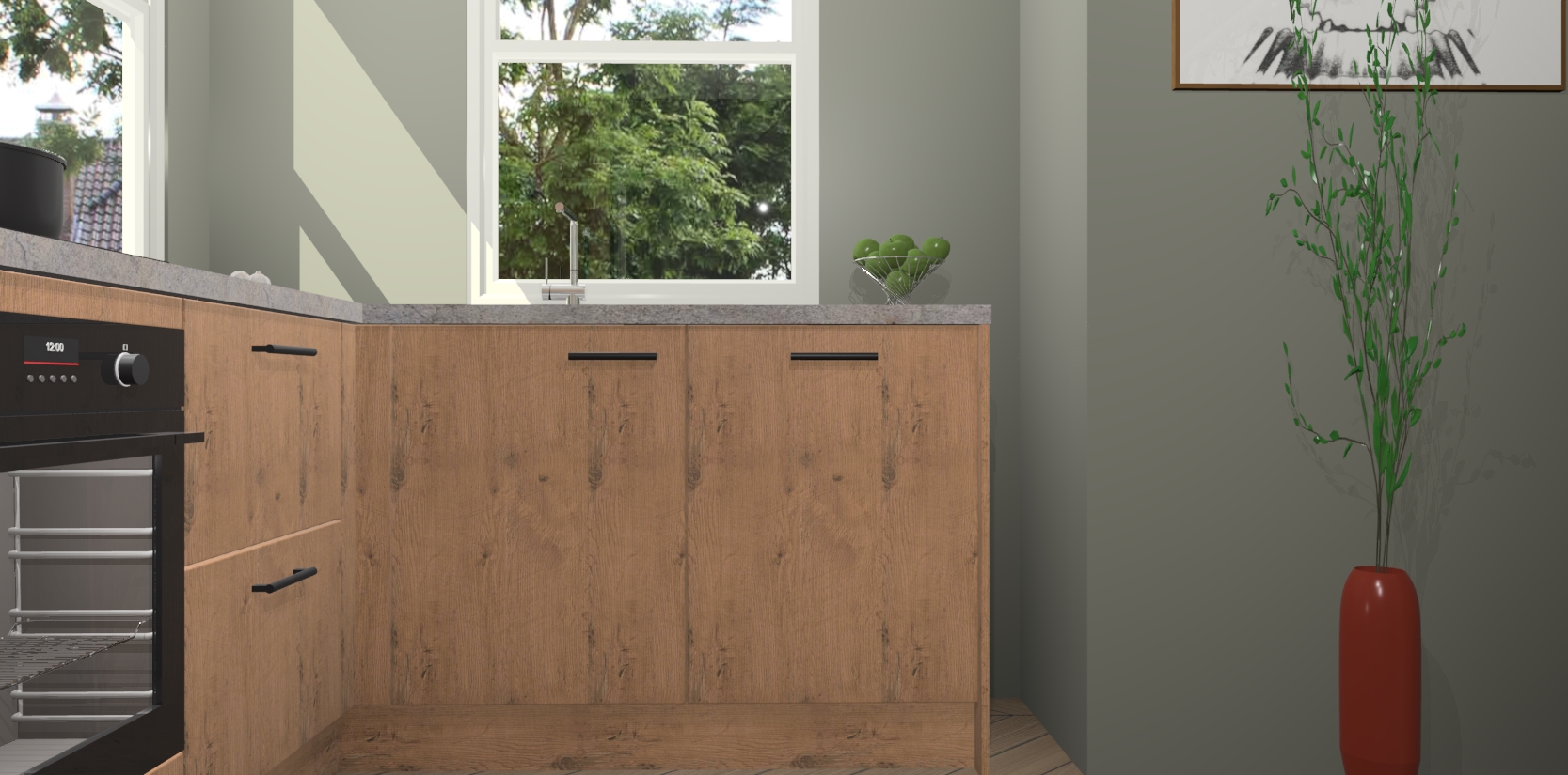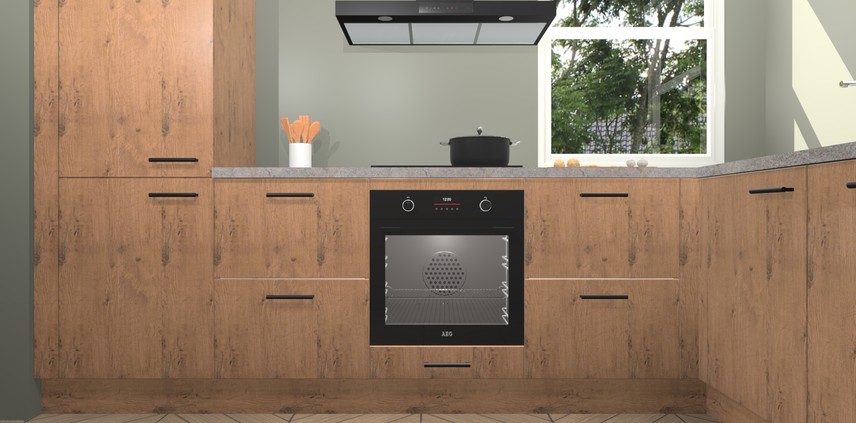 Wat maakt deze keuken zo bijzonder? Ten eerste geeft het houten werkblad uw ruimte een onmiskenbaar klassieke uitstraling. De natuurlijke afwerking roept warmte en elegantie op die nooit uit de mode zullen raken. Bovendien is het gemakkelijk schoon te houden en te onderhouden, zodat je er jarenlang plezier van kunt hebben. Als u op zoek bent naar extra gemak in uw keuken, dan heeft u bij het plaatsen van een bestelling bij ons ook de optie om uw toestellen te upgraden naar AEG-modellen - zo haalt u moderne innovatie van topmerken in apparatentechnologie rechtstreeks in huis.