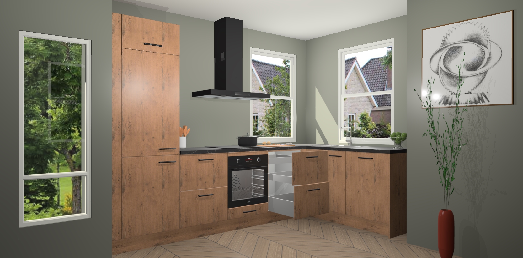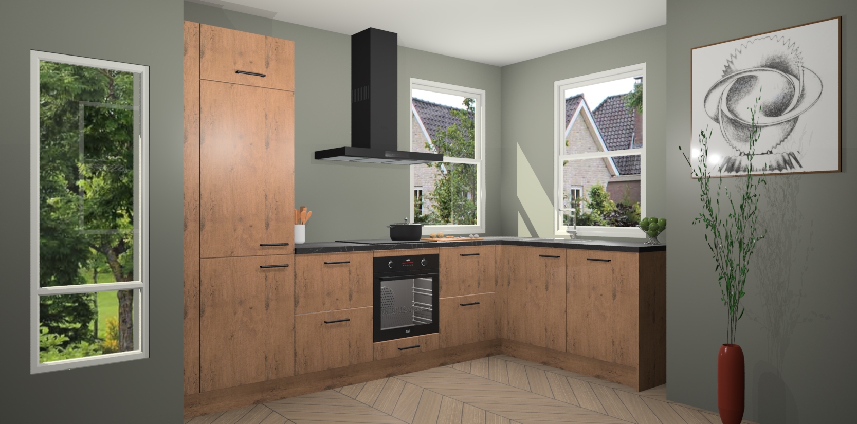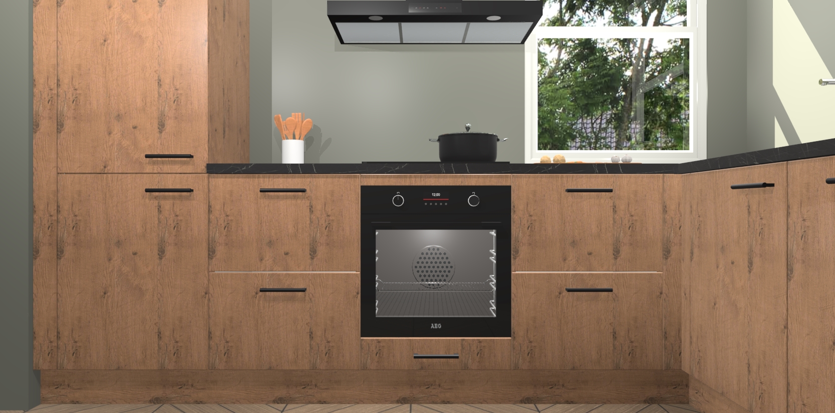 Wat maakt deze keuken zo bijzonder? Ten eerste geeft het houten werkblad uw ruimte een onmiskenbaar klassieke uitstraling. De natuurlijke afwerking roept warmte en elegantie op die nooit uit de mode zullen raken. Bovendien is het gemakkelijk schoon te houden en te onderhouden, zodat je er jarenlang plezier van kunt hebben. Als u op zoek bent naar extra gemak in uw keuken, dan heeft u bij het plaatsen van een bestelling bij ons ook de optie om uw toestellen te upgraden naar AEG-modellen - zo haalt u moderne innovatie van topmerken in apparatentechnologie rechtstreeks in huis.