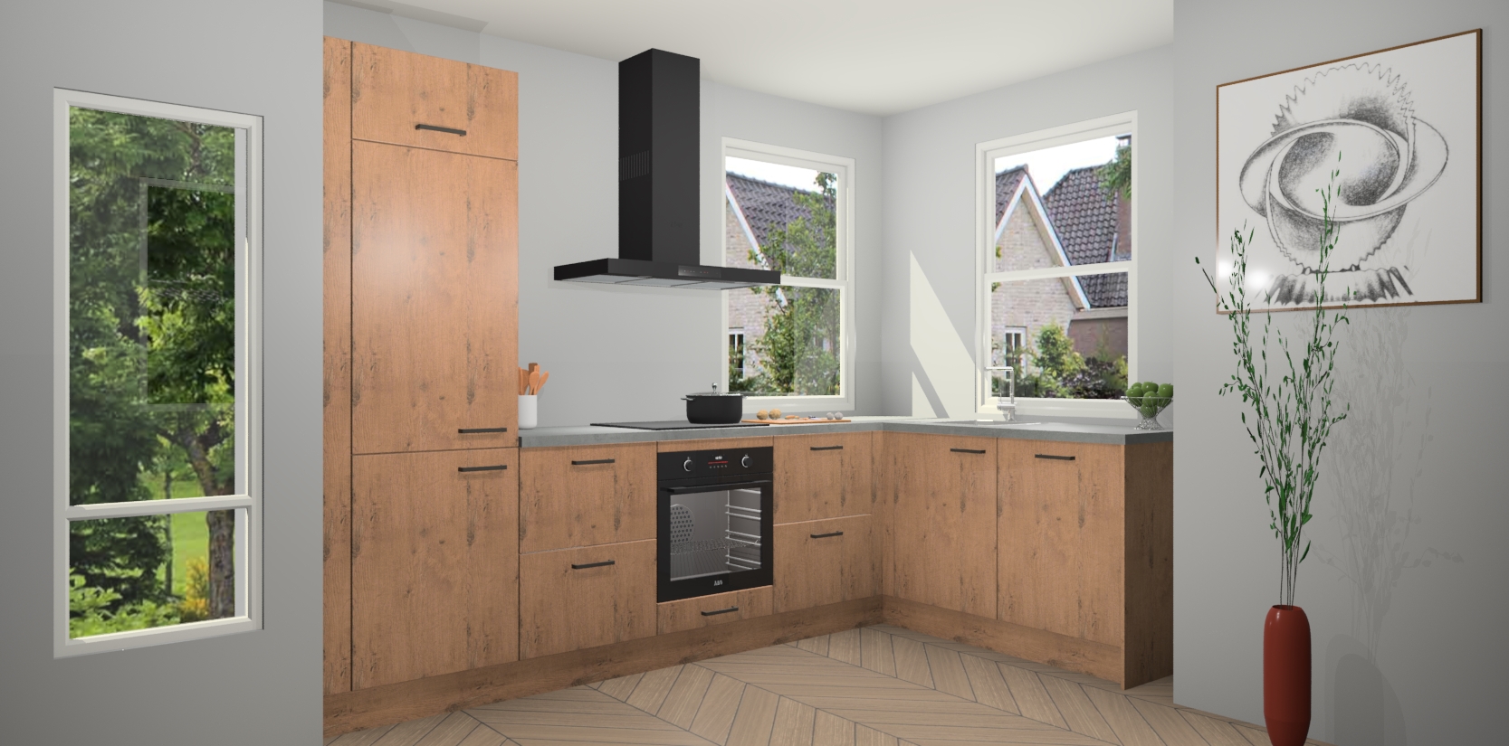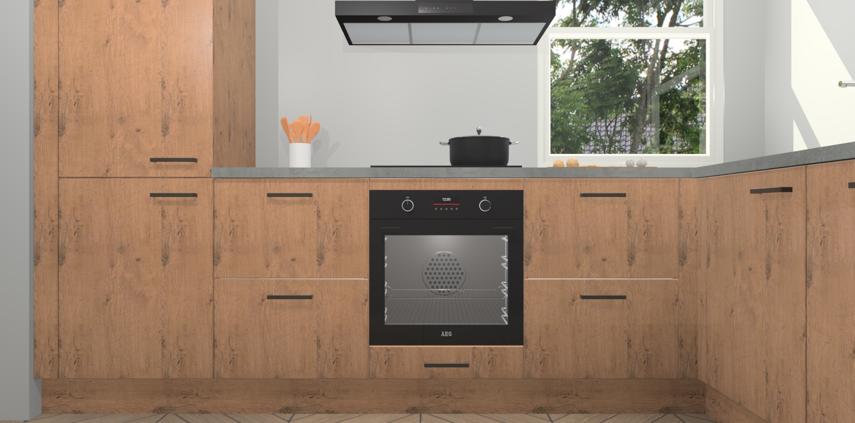 Wat maakt deze keuken zo bijzonder? Ten eerste geeft het houten werkblad uw ruimte een onmiskenbaar klassieke uitstraling. De natuurlijke afwerking roept warmte en elegantie op die nooit uit de mode zullen raken. Bovendien is het gemakkelijk schoon te houden en te onderhouden, zodat je er jarenlang plezier van kunt hebben. Als u op zoek bent naar extra gemak in uw keuken, dan heeft u bij het plaatsen van een bestelling bij ons ook de optie om uw toestellen te upgraden naar AEG-modellen - zo haalt u moderne innovatie van topmerken in apparatentechnologie rechtstreeks in huis.