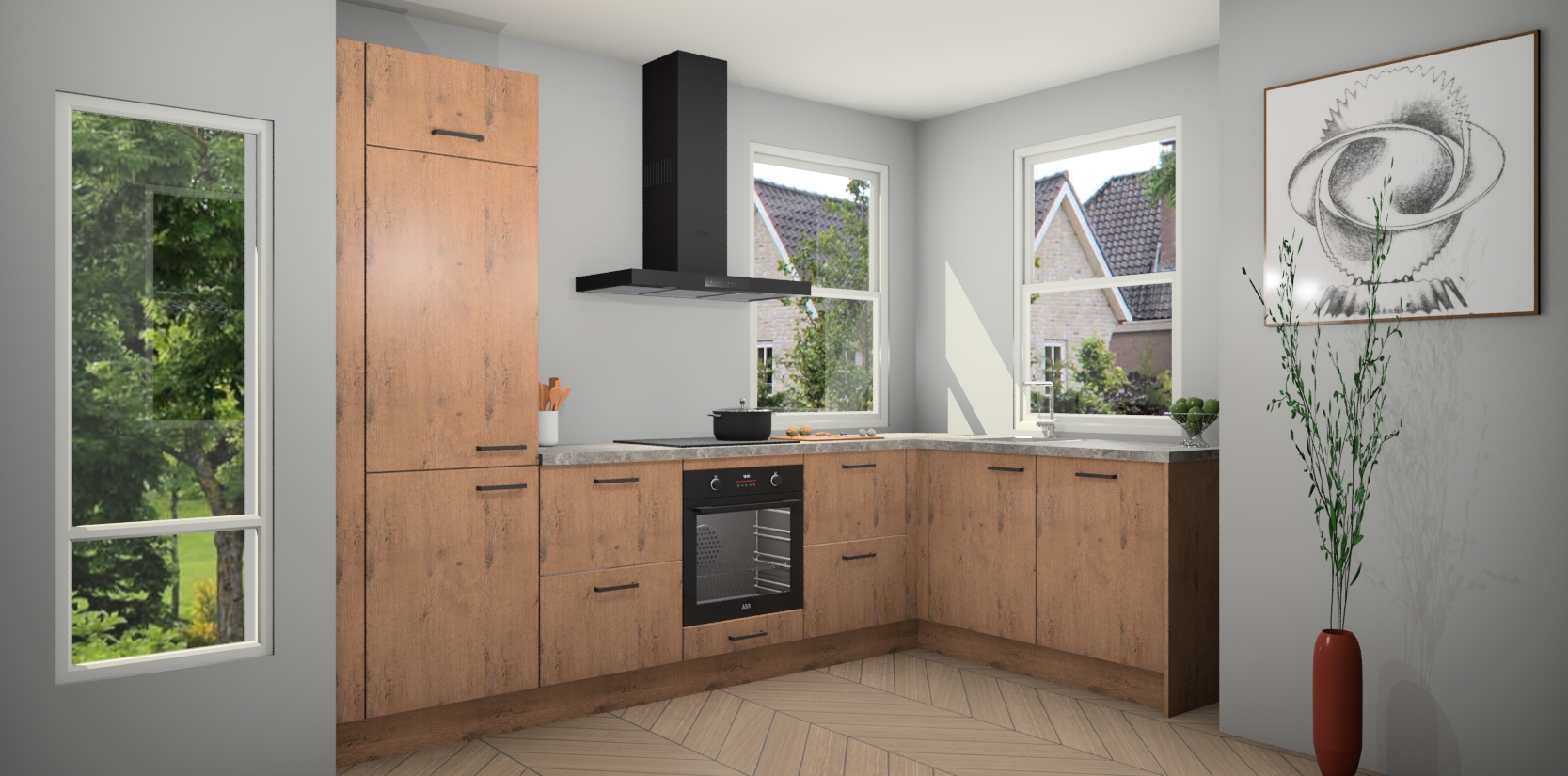Wat maakt deze keuken zo bijzonder? Ten eerste geeft het houten werkblad uw ruimte een onmiskenbaar klassieke uitstraling. De natuurlijke afwerking roept warmte en elegantie op die nooit uit de mode zullen raken. Bovendien is het gemakkelijk schoon te houden en te onderhouden, zodat je er jarenlang plezier van kunt hebben. Als u op zoek bent naar extra gemak in uw keuken, dan heeft u bij het plaatsen van een bestelling bij ons ook de optie om uw toestellen te upgraden naar AEG-modellen - zo haalt u moderne innovatie van topmerken in apparatentechnologie rechtstreeks in huis.