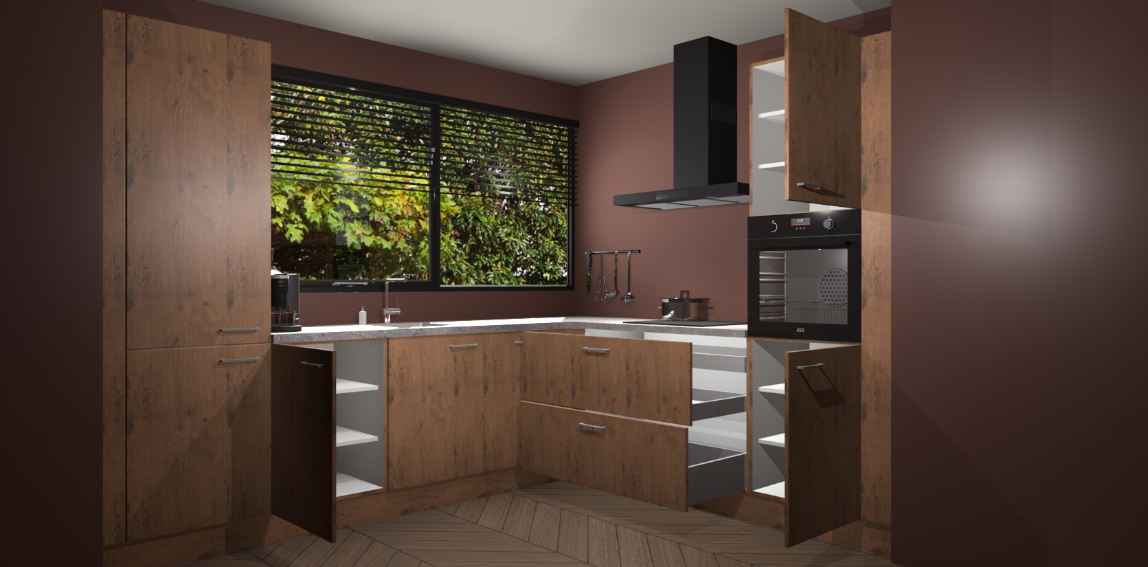Met een modern, tijdloos design en ruime opslagruimte, zult u zich in no-time thuis voelen in uw nieuwe keuken. Uw leven wordt eenvoudiger met de soft-close deuren die voor het ultieme stille comfort zorgen - geen geluid dat u stoort terwijl u kookt. Ook is de keuken voorzien van 5 ingebouwde apparaten: een oven, inductie kookplaat, afzuigkap, vaatwasser en koelkast. Deze kunnen gemakkelijk na bestelling worden bijgewerkt naar AEG - waardoor uw luxe ervaring compleet is.