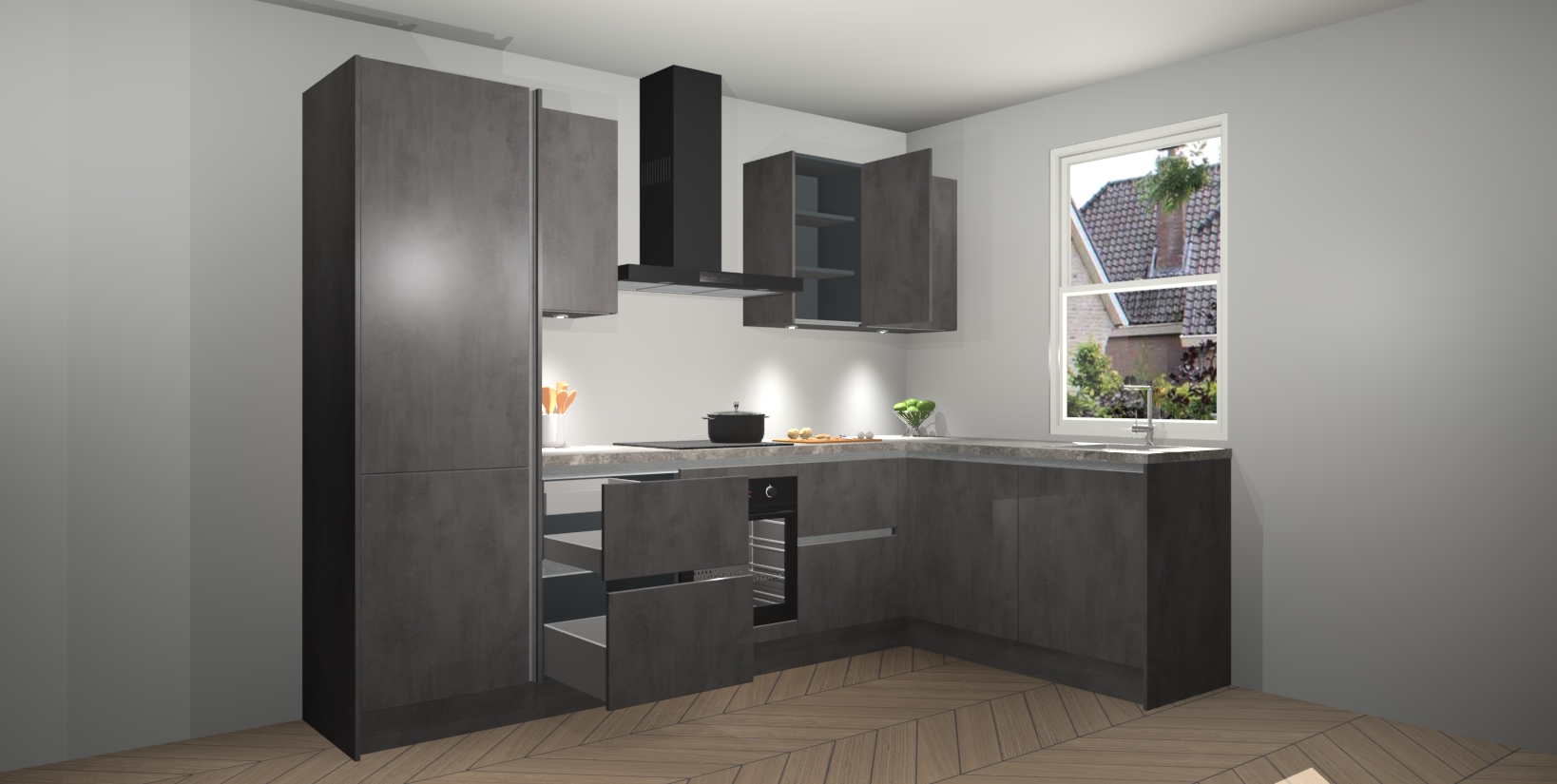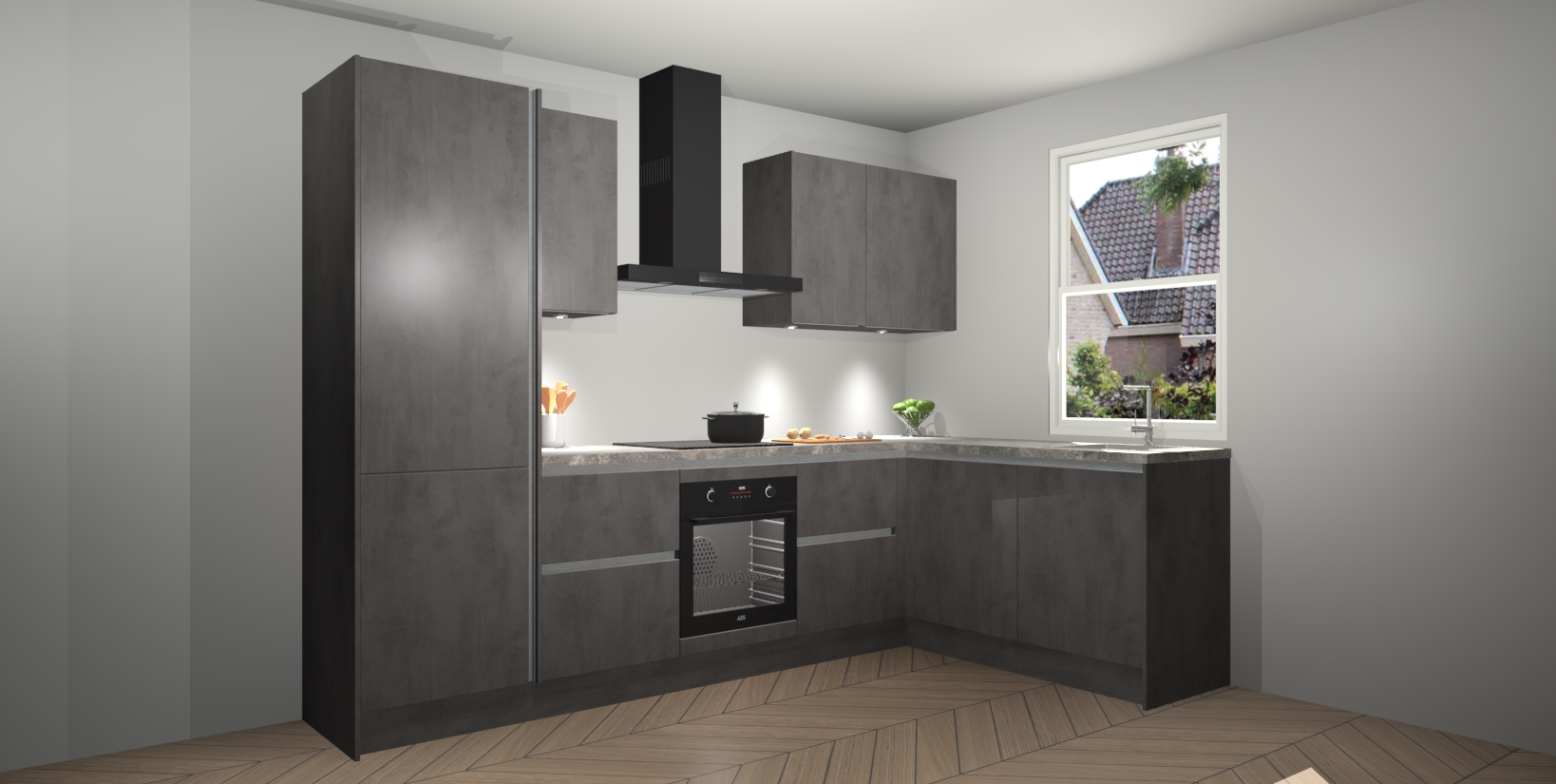 Maak kennis met de trendsettende en luxe Beton Antraciet greeploze keuken Bazel! Deze uitzonderlijke keuken van Duitse kwaliteit is stijlvol, modern en perfect om elk huis mee op te fleuren. De binnenkant van de kasten worden meegenomen in een bijpassende kleur om een samenhangende eigentijdse esthetiek te voltooien. U zult dol zijn op hoe uw pas gerenoveerde keuken eruitziet met de Beton Antraciet editie!