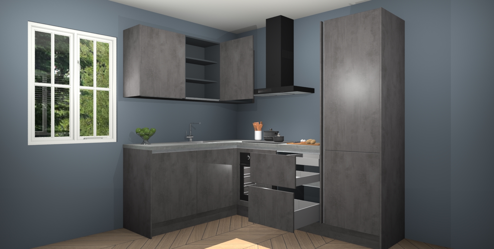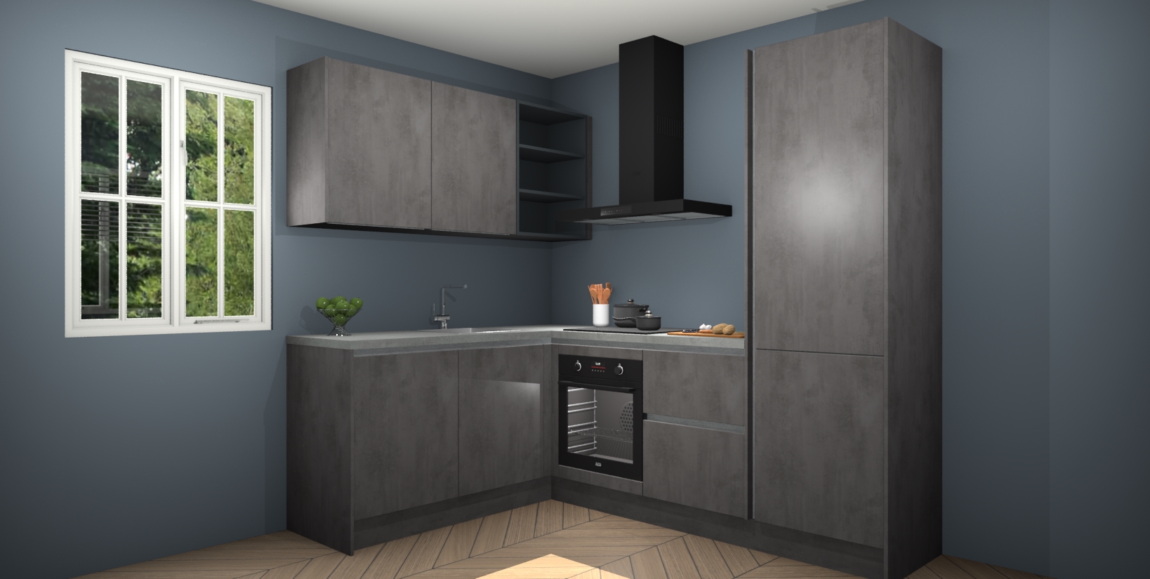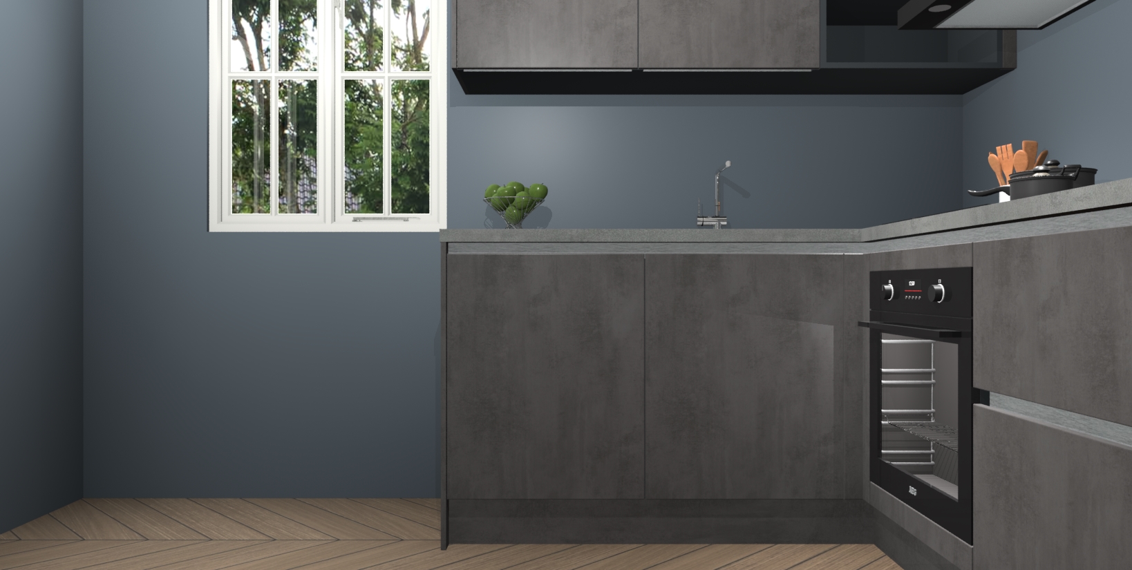 Maak kennis met de Beton Antraciet greeploze keuken Boekarest, een moderne hoekkeuken waar al uw vrienden en familie jaloers op zullen zijn! Het verbluffende mooie ontwerp past in elk interieur en is een ideale keuze voor wie op zoek is naar een klassieke, maar verfijnde look.