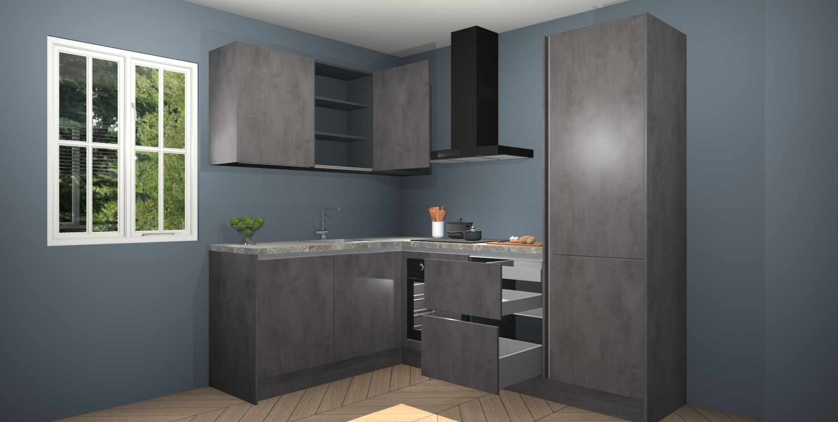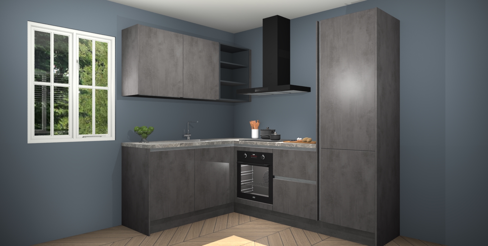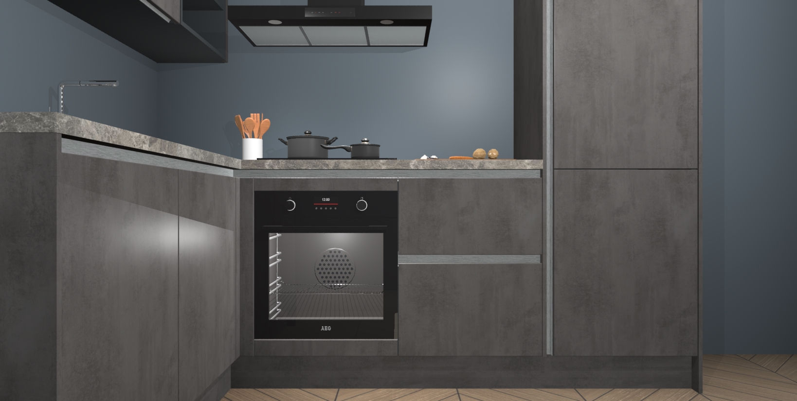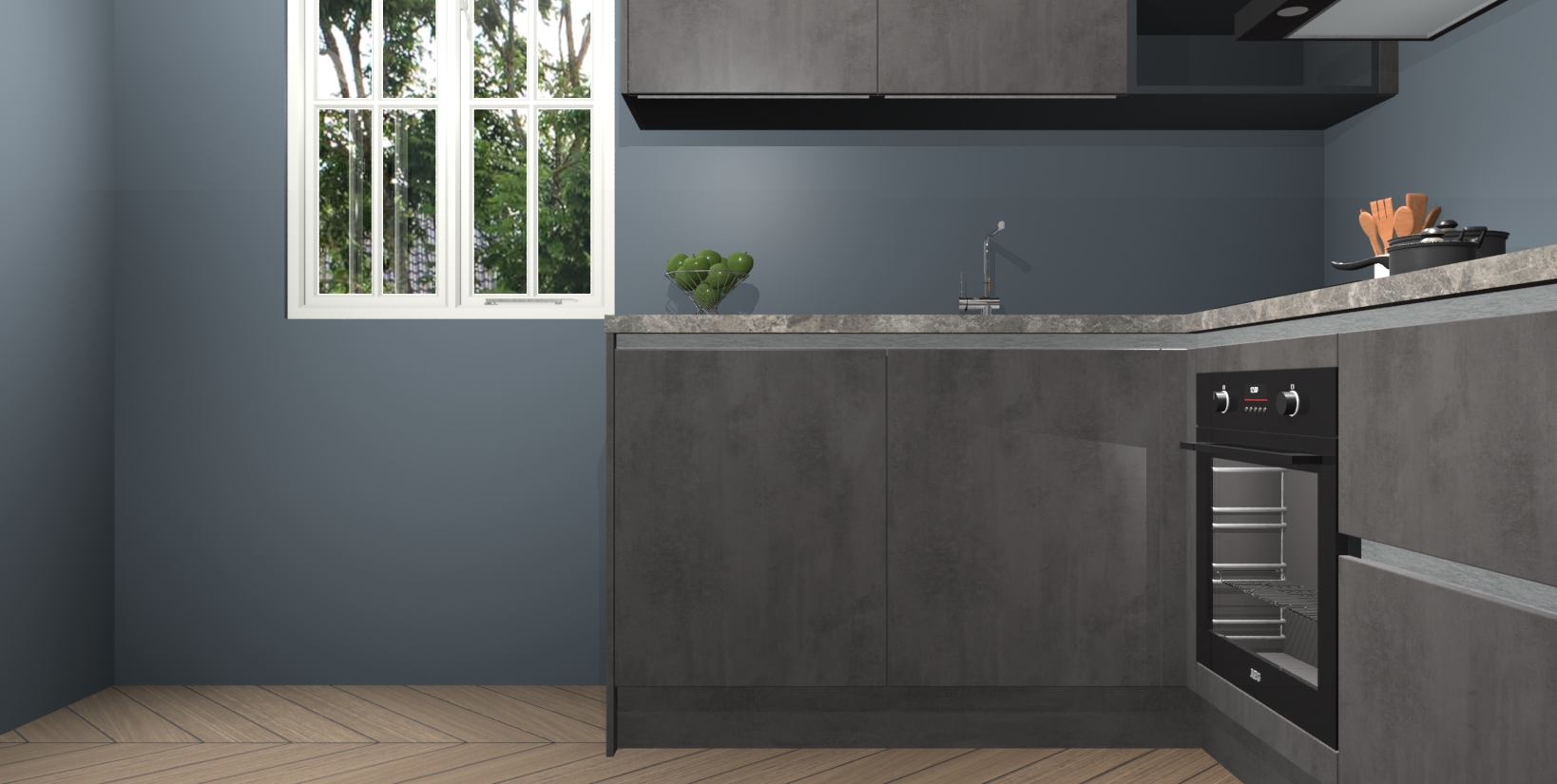 Maak kennis met de Beton Antraciet greeploze keuken Boekarest, een moderne hoekkeuken waar al uw vrienden en familie jaloers op zullen zijn! Het verbluffende mooie ontwerp past in elk interieur en is een ideale keuze voor wie op zoek is naar een klassieke, maar verfijnde look.