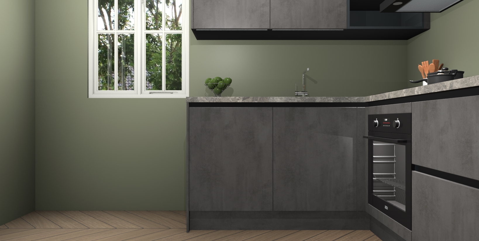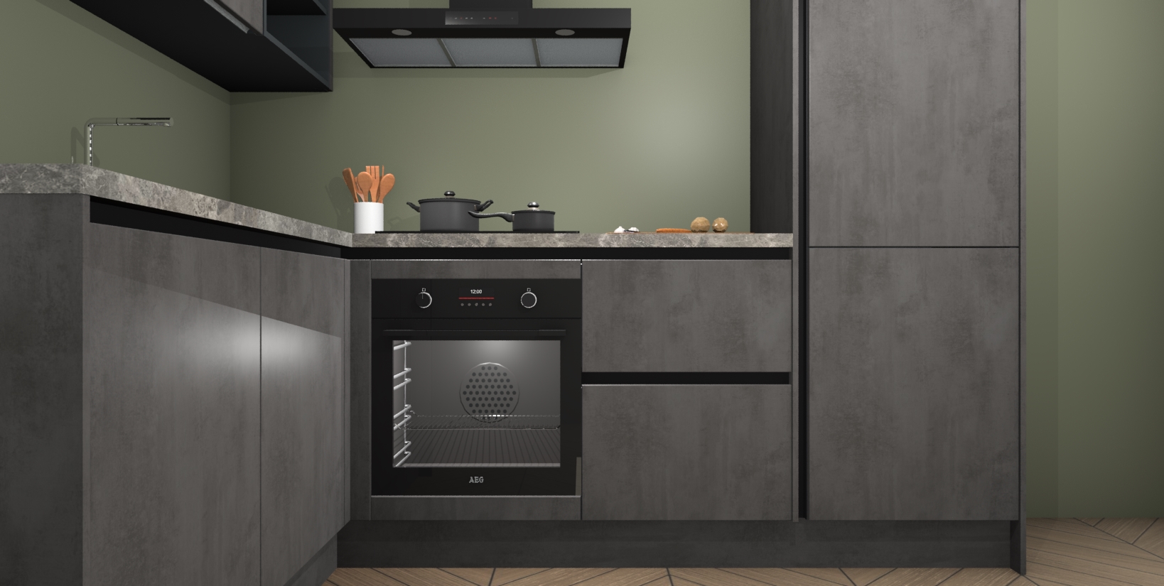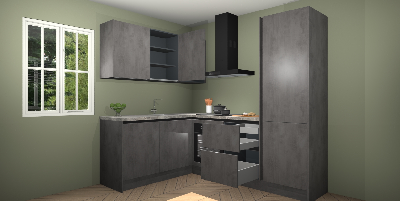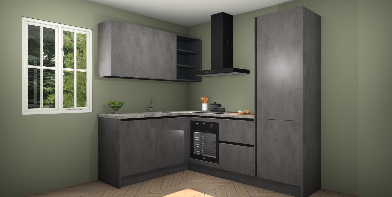 Maak kennis met de Beton Antraciet greeploze keuken Boekarest, een moderne hoekkeuken waar al uw vrienden en familie jaloers op zullen zijn! Het verbluffende mooie ontwerp past in elk interieur en is een ideale keuze voor wie op zoek is naar een klassieke, maar verfijnde look.