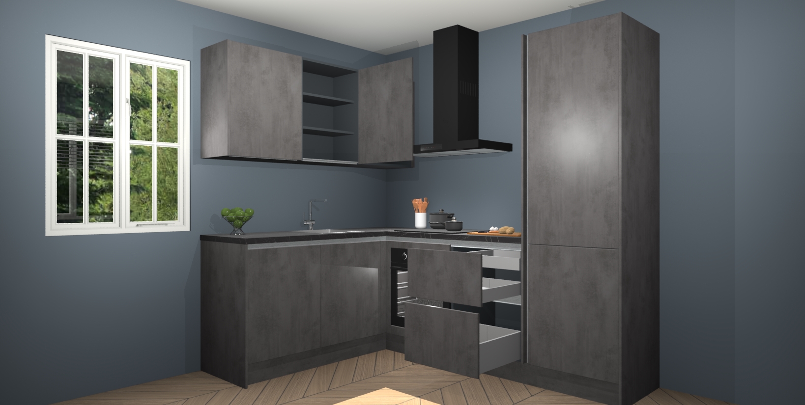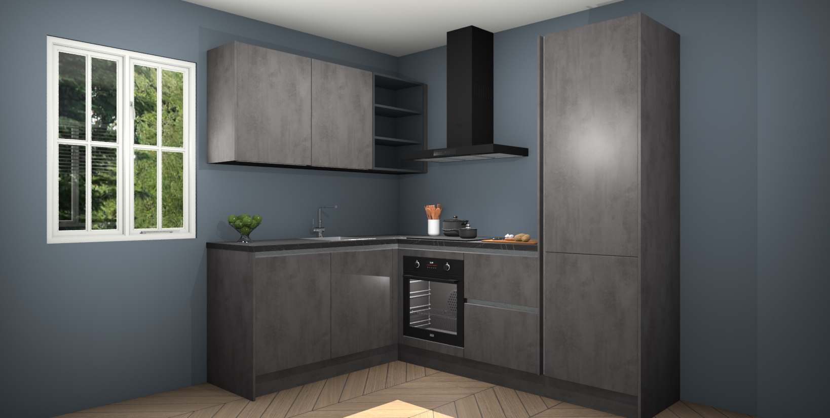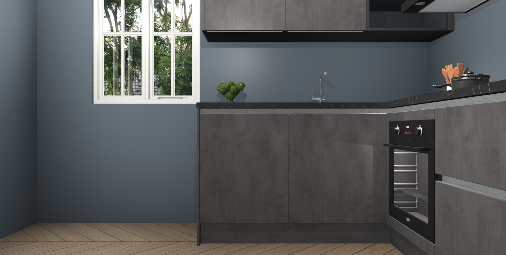 Maak kennis met de Beton Antraciet greeploze keuken Boekarest, een moderne hoekkeuken waar al uw vrienden en familie jaloers op zullen zijn! Het verbluffende mooie ontwerp past in elk interieur en is een ideale keuze voor wie op zoek is naar een klassieke, maar verfijnde look.