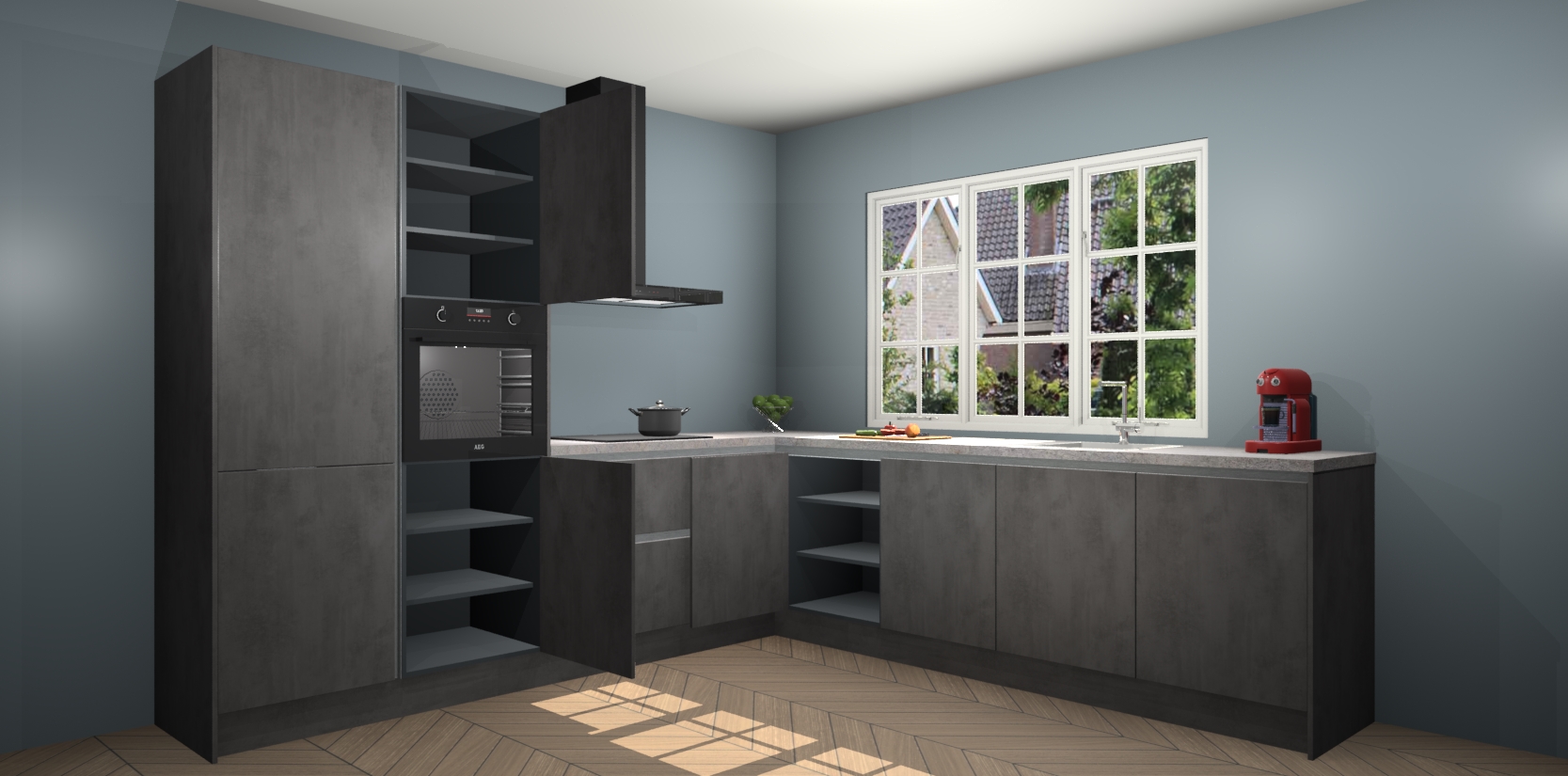 Welkom in de nieuwe wereld van een moderne keuken: de Beton Antraciet greeploze keuken Casablanca! Met dit innovatieve keukendesign haalt u de natuur naar binnen. Neem plaats aan uw hout-look keuken en voel u verbonden met de prachtige Beton Antraciet kleur. Zeer gebruiksvriendelijk, ervaring door prettige materialen en kleur die perfect aansluiten bij uw sfeerkeuze in huis.