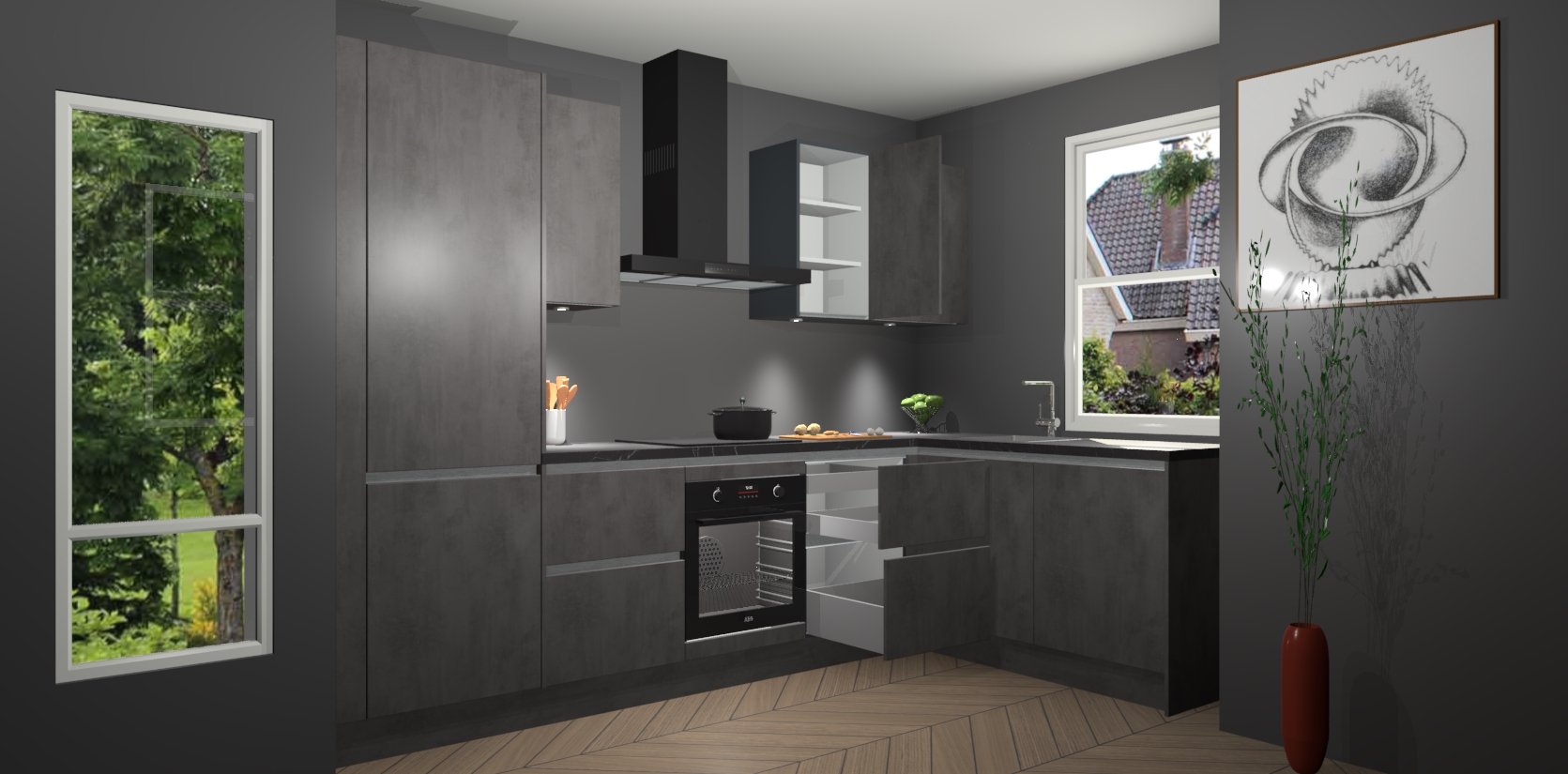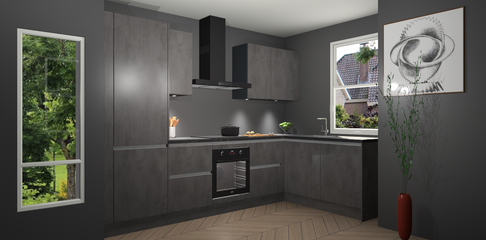 De Beton Antraciet greeploze keuken Geneve is precies wat u nodig heeft als u op zoek bent naar modern design, versmolten met tijdloze schoonheid. De strakke afwerking voegt klasse toe terwijl het toch een uitnodigende sfeer behoudt; zeker om zowel gasten als uzelf te inspireren om in stijl te gaan koken! En nog beter, het zal uw budget niet breken - dus waarom wachten? Met de Beton Antraciet greeploze keuken Geneve bent u verzekerd van kwaliteit zonder in te leveren op de prijs!