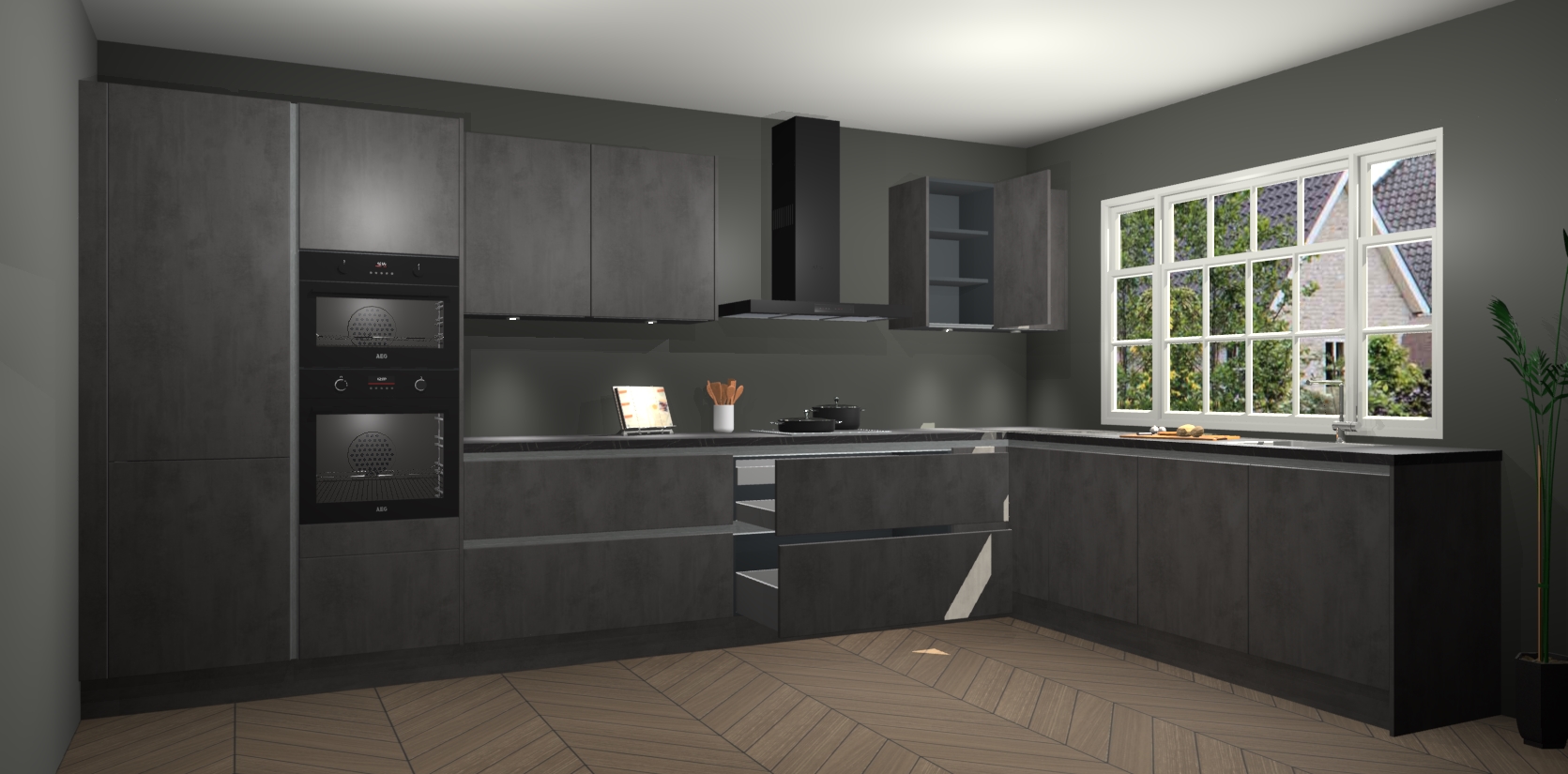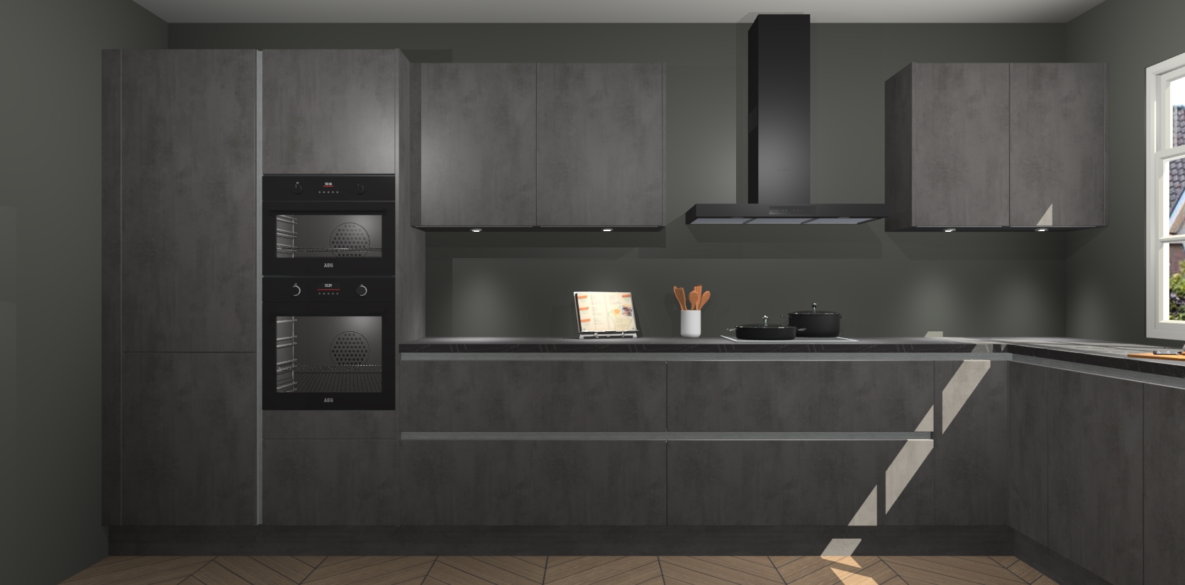 Heeft u nog apparatuur nodig? Geen probleem: de beton antraciet greeploze keuken Graz bevat vijf ingebouwde apparaten - een oven, inductiekookplaat, afzuigkap, vaatwasser en koelkast - die gemakkelijk kunnen worden bijgewerkt naar AEG na bestelling. En als dat nog niet genoeg is; onze kasten worden pre-geassembleerd geleverd en zijn verkrijgbaar tegen een vastgeroeste lage prijs! U hoeft nooit meer te zoeken naar goede kwaliteit en service want onze producten hebben echt Duitse kwaliteit.