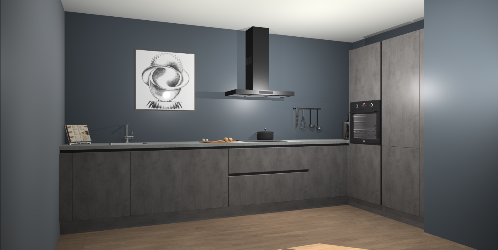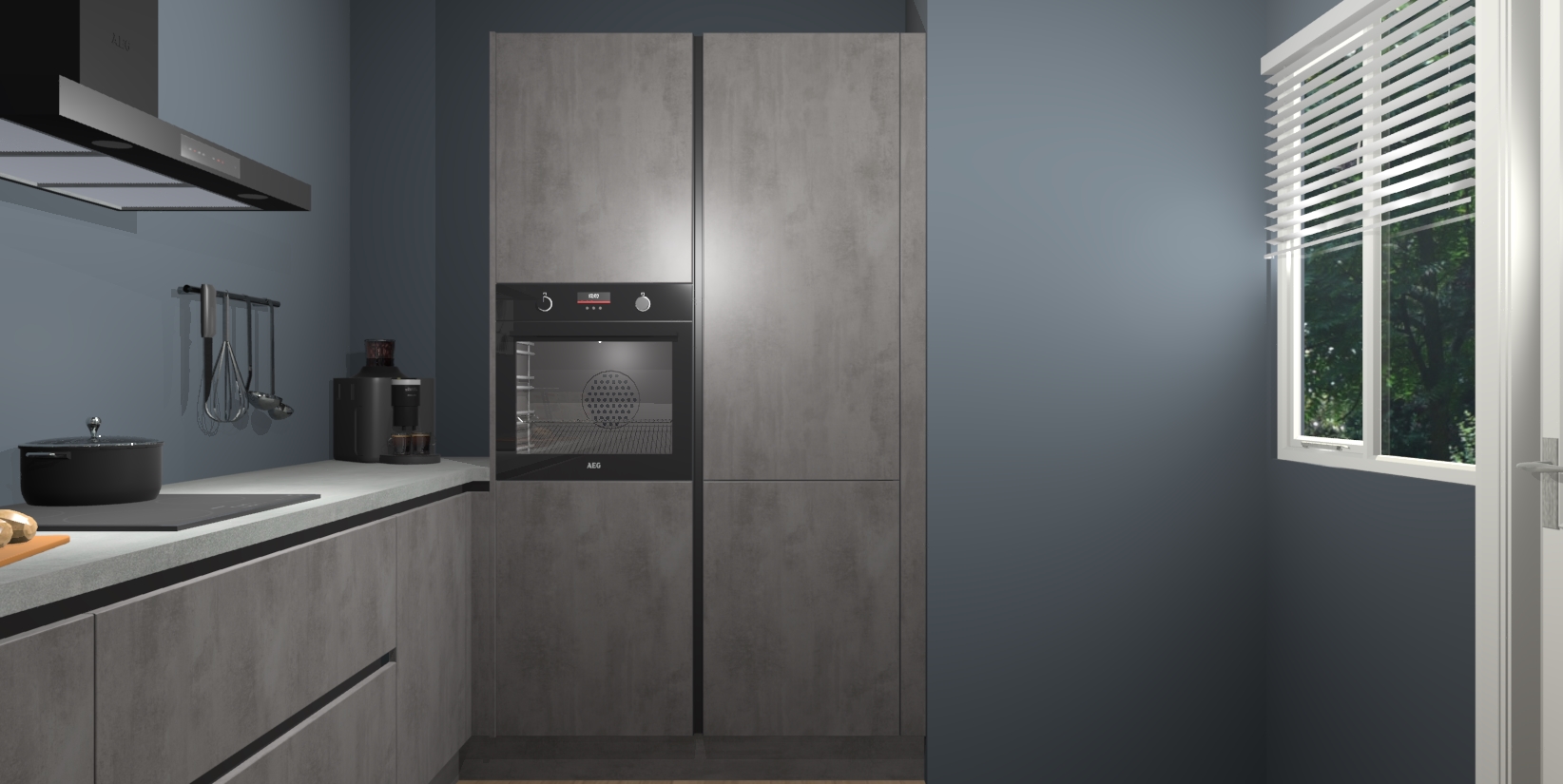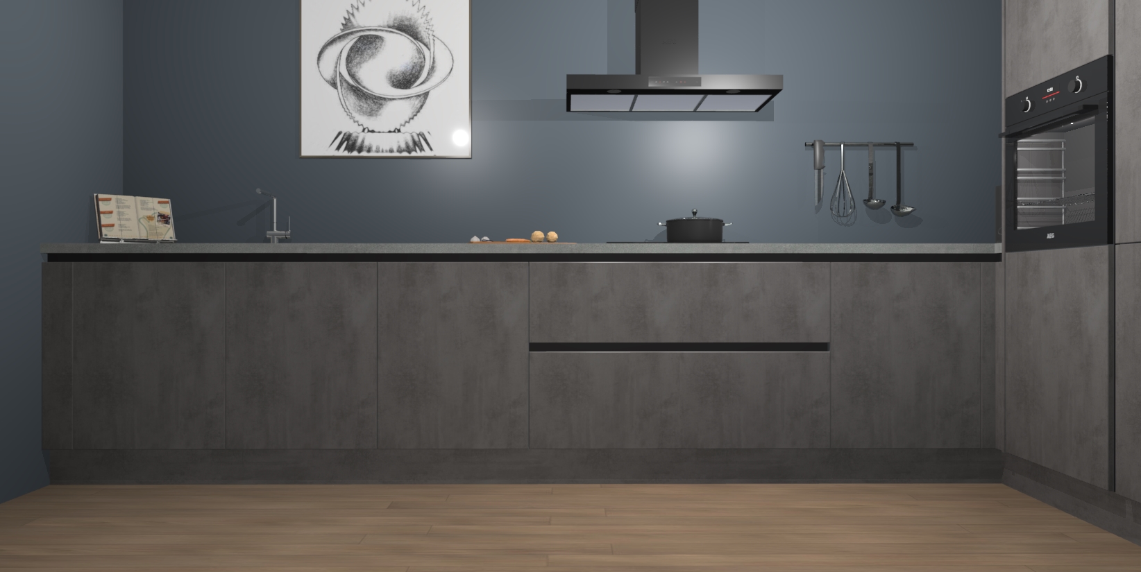 Welkom bij de Beton Antraciet greeploze keuken Khao Lak. Deze prachtige keuken zal de komende jaren het middelpunt van de belangstelling in uw huis zijn. Uitgerust met vijf inbouwapparaten komt u nooit kookgereedschap tekort. Bovendien geeft de warme houtlook elke ruimte een uitnodigende en tijdloze uitstraling.