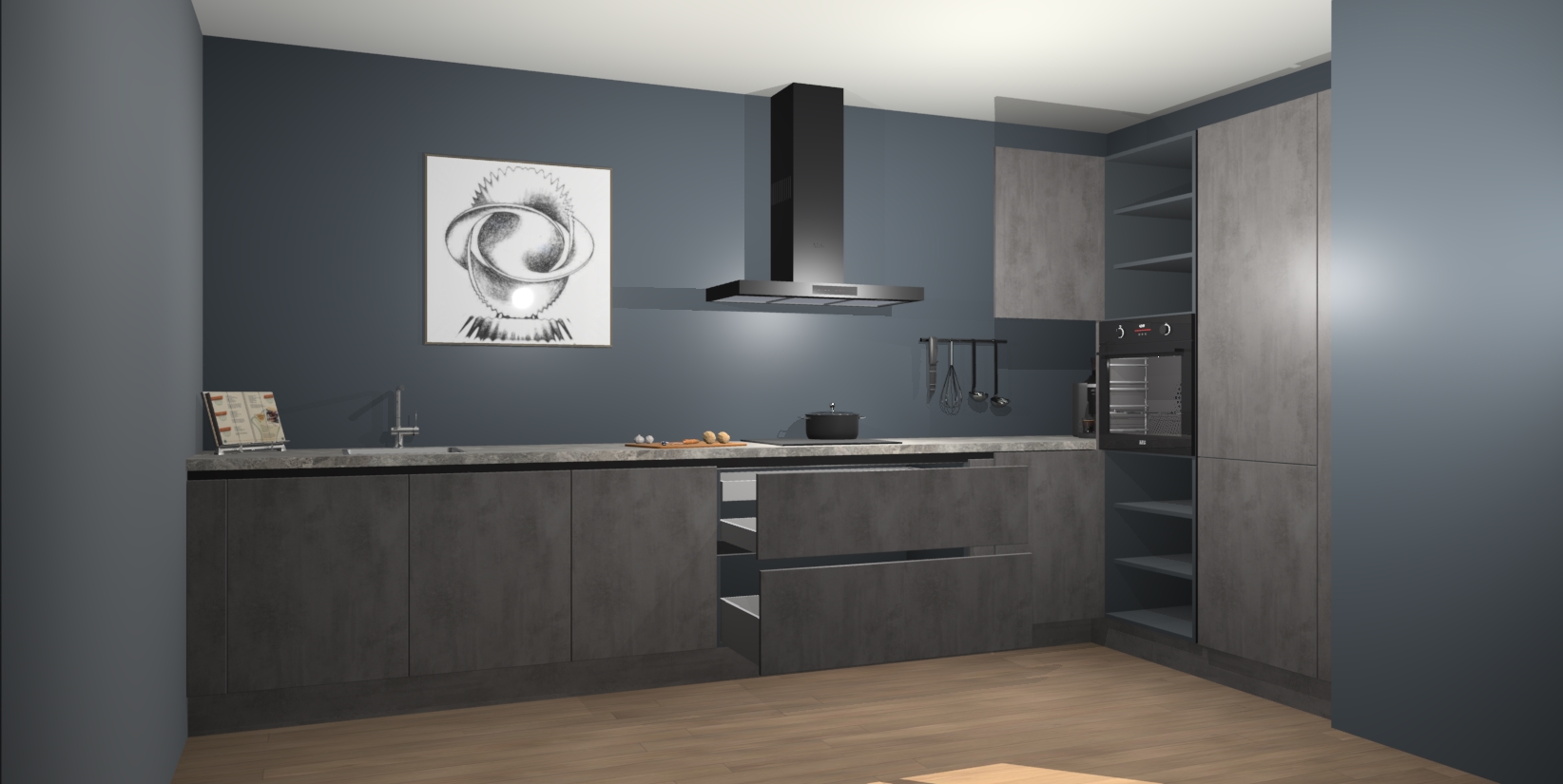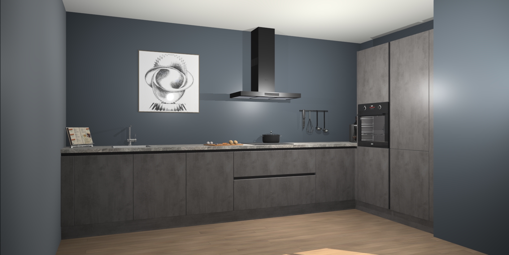 Welkom bij de Beton Antraciet greeploze keuken Khao Lak. Deze prachtige keuken zal de komende jaren het middelpunt van de belangstelling in uw huis zijn. Uitgerust met vijf inbouwapparaten komt u nooit kookgereedschap tekort. Bovendien geeft de warme houtlook elke ruimte een uitnodigende en tijdloze uitstraling.