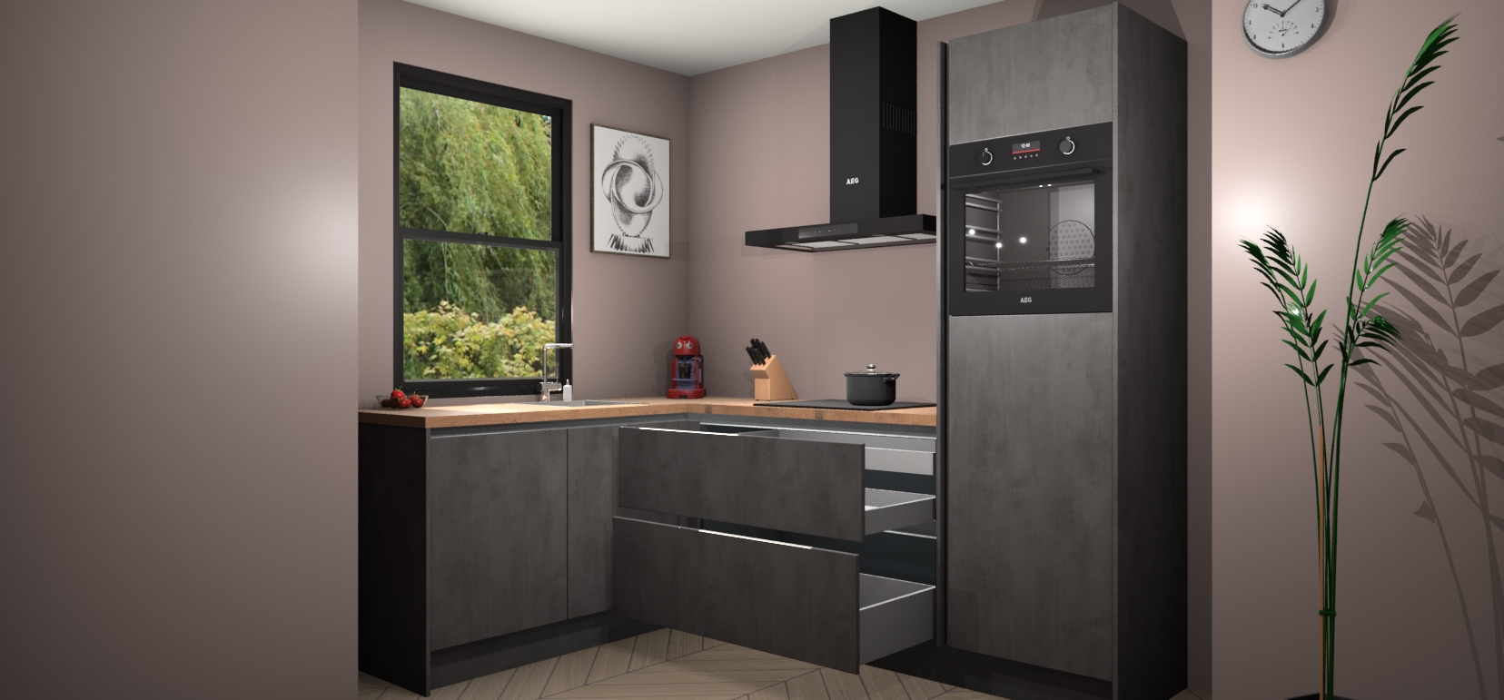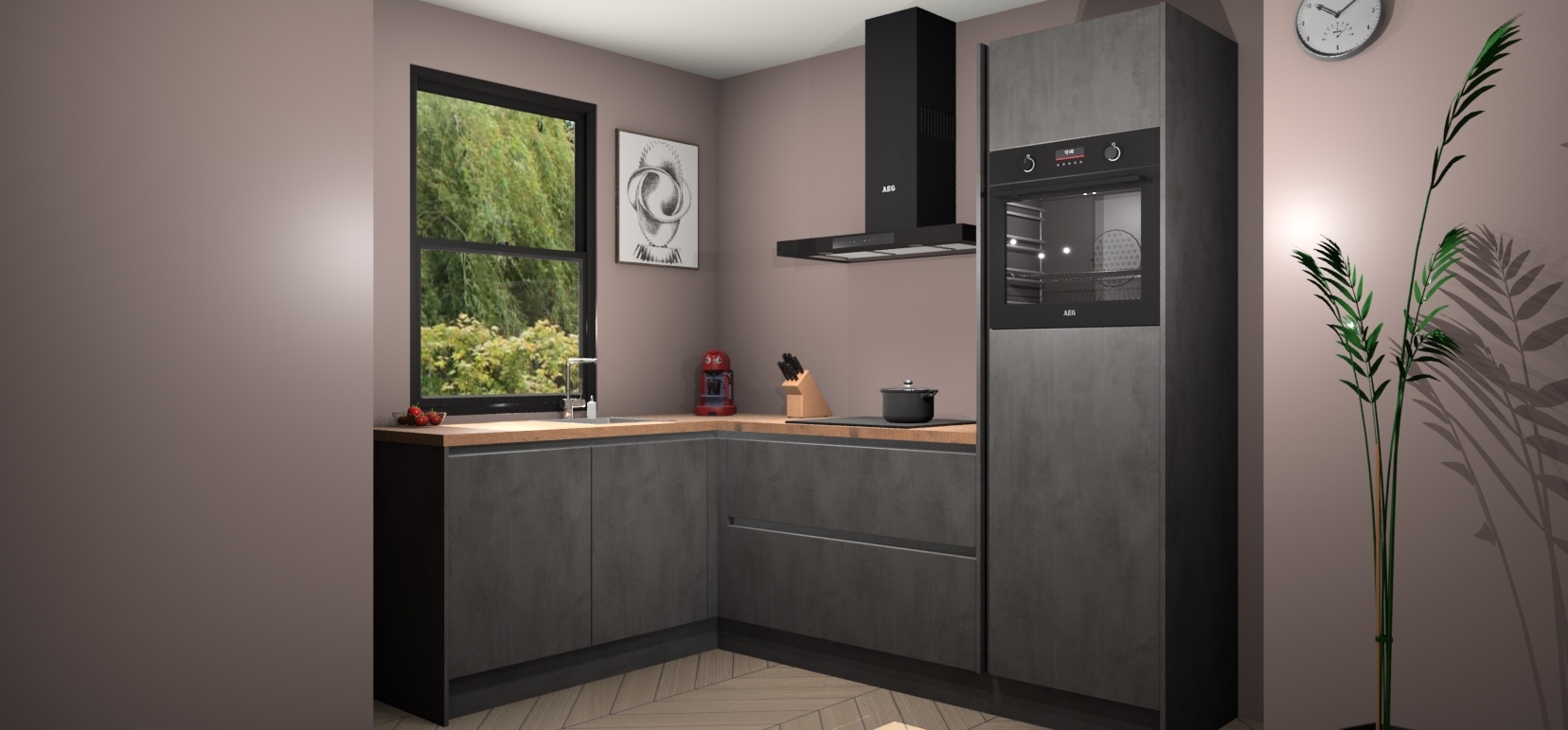 Deze prachtige hoekkeuken heeft alle benodigdheden om uw droomkook- en eetruimte compleet te maken. De Beton Antraciet kasten bieden een echo van raffinement, terwijl de 5 inbouwapparaten genoeg opties bieden voor het bereiden van heerlijke maaltijden. De oven, inductiekookplaat, afzuigkap, vaatwasser en koelkast zorgen ervoor dat u tijd in de keuken zo efficiënt mogelijk verloopt, terwijl ze ook dat extra vleugje luxe bieden.