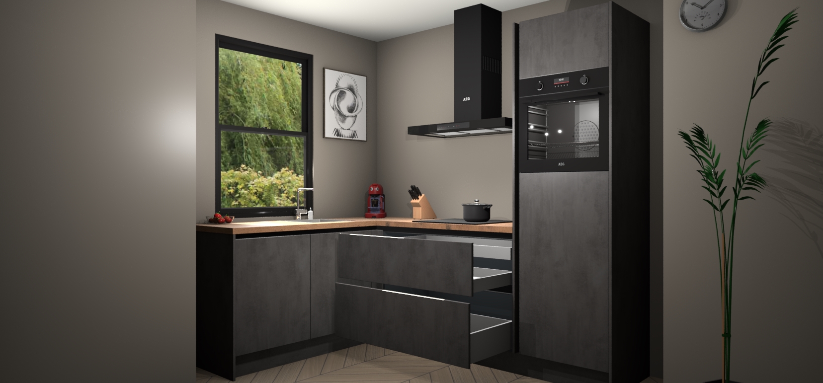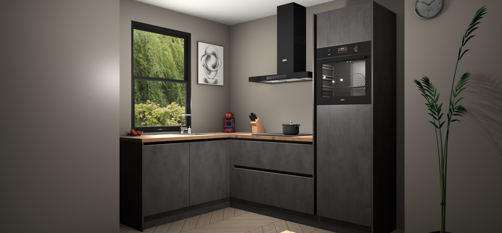 Deze prachtige hoekkeuken heeft alle benodigdheden om uw droomkook- en eetruimte compleet te maken. De Beton Antraciet kasten bieden een echo van raffinement, terwijl de 5 inbouwapparaten genoeg opties bieden voor het bereiden van heerlijke maaltijden. De oven, inductiekookplaat, afzuigkap, vaatwasser en koelkast zorgen ervoor dat u tijd in de keuken zo efficiënt mogelijk verloopt, terwijl ze ook dat extra vleugje luxe bieden.