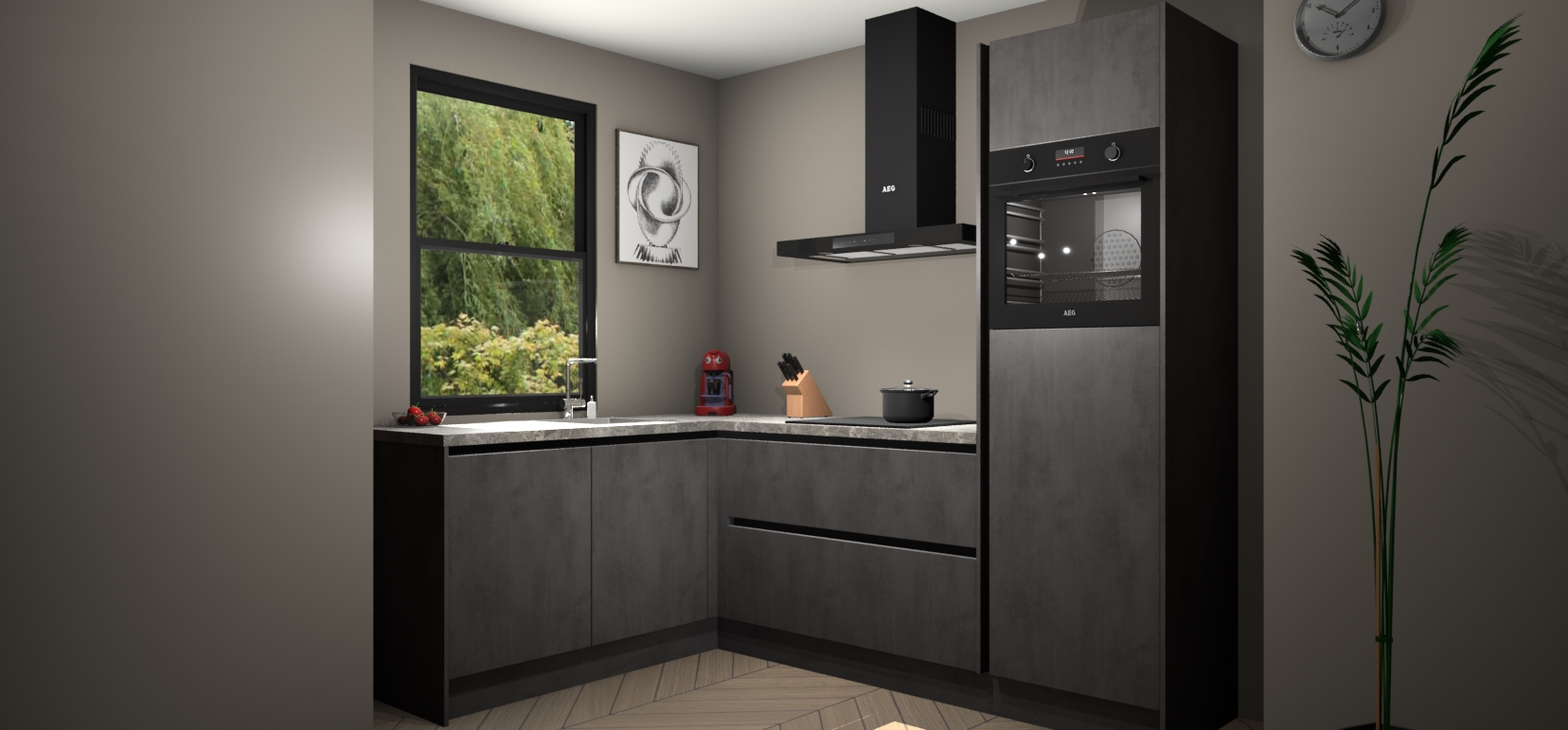 Deze prachtige hoekkeuken heeft alle benodigdheden om uw droomkook- en eetruimte compleet te maken. De Beton Antraciet kasten bieden een echo van raffinement, terwijl de 5 inbouwapparaten genoeg opties bieden voor het bereiden van heerlijke maaltijden. De oven, inductiekookplaat, afzuigkap, vaatwasser en koelkast zorgen ervoor dat u tijd in de keuken zo efficiënt mogelijk verloopt, terwijl ze ook dat extra vleugje luxe bieden.