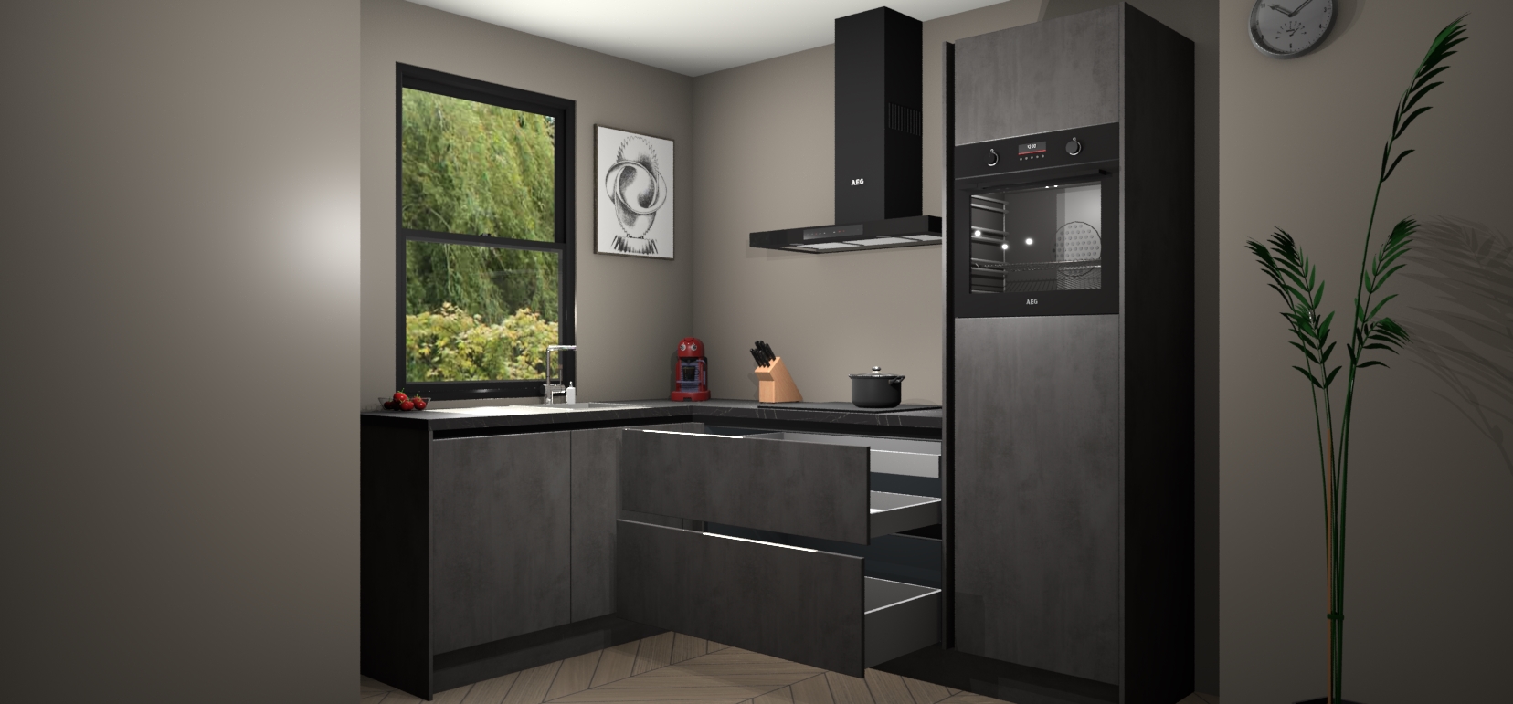 Deze prachtige hoekkeuken heeft alle benodigdheden om uw droomkook- en eetruimte compleet te maken. De Beton Antraciet kasten bieden een echo van raffinement, terwijl de 5 inbouwapparaten genoeg opties bieden voor het bereiden van heerlijke maaltijden. De oven, inductiekookplaat, afzuigkap, vaatwasser en koelkast zorgen ervoor dat u tijd in de keuken zo efficiënt mogelijk verloopt, terwijl ze ook dat extra vleugje luxe bieden.