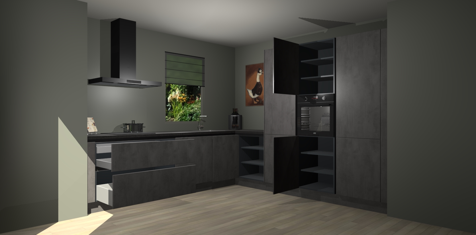 Welkom bij de Beton Antraciet greeploze keuken Laos. Deze prachtige keuken zal de komende jaren het middelpunt van de belangstelling in uw huis zijn. Uitgerust met vijf inbouwapparaten komt u nooit kookgereedschap tekort. Bovendien geeft de warme houtlook elke ruimte een uitnodigende en tijdloze uitstraling.