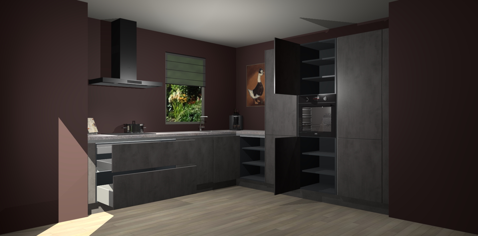 Welkom bij de Beton Antraciet greeploze keuken Laos. Deze prachtige keuken zal de komende jaren het middelpunt van de belangstelling in uw huis zijn. Uitgerust met vijf inbouwapparaten komt u nooit kookgereedschap tekort. Bovendien geeft de warme houtlook elke ruimte een uitnodigende en tijdloze uitstraling.