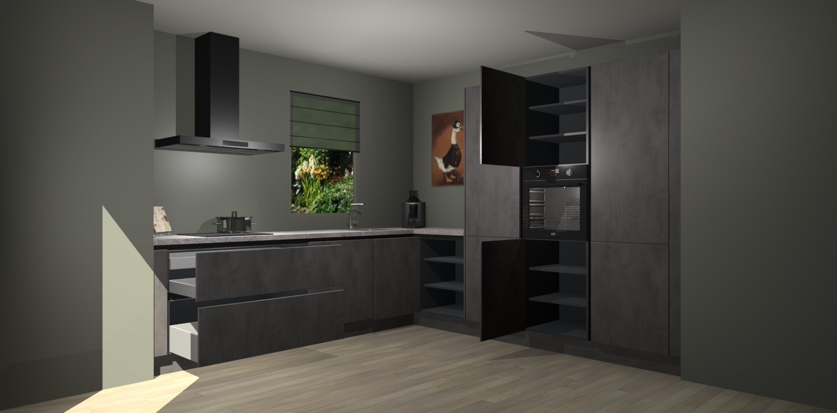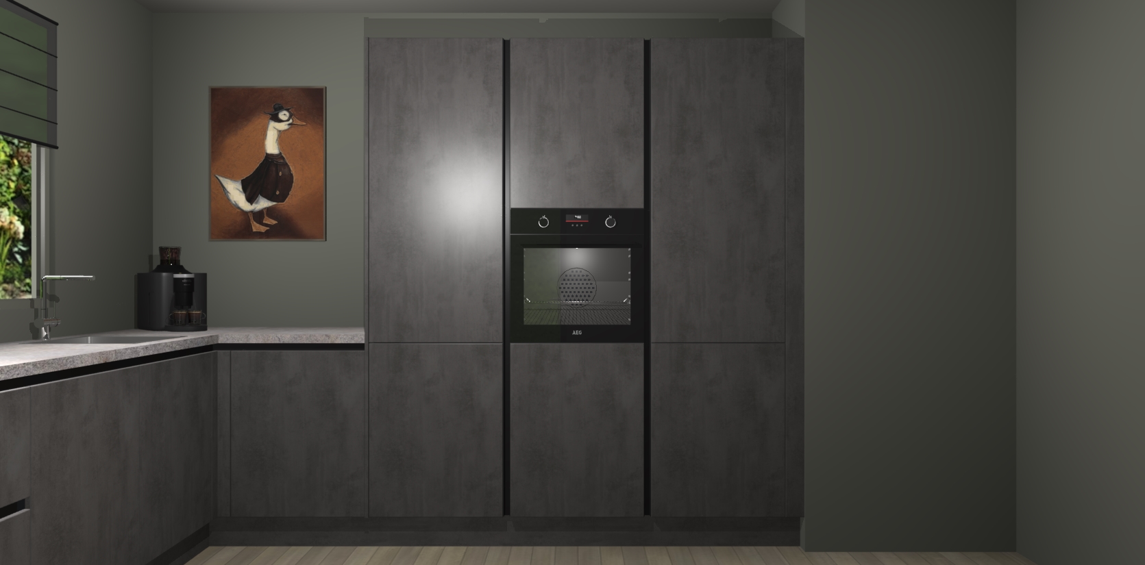 Welkom bij de Beton Antraciet greeploze keuken Laos. Deze prachtige keuken zal de komende jaren het middelpunt van de belangstelling in uw huis zijn. Uitgerust met vijf inbouwapparaten komt u nooit kookgereedschap tekort. Bovendien geeft de warme houtlook elke ruimte een uitnodigende en tijdloze uitstraling.