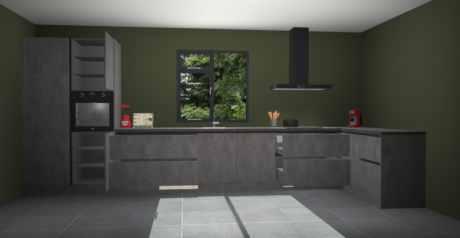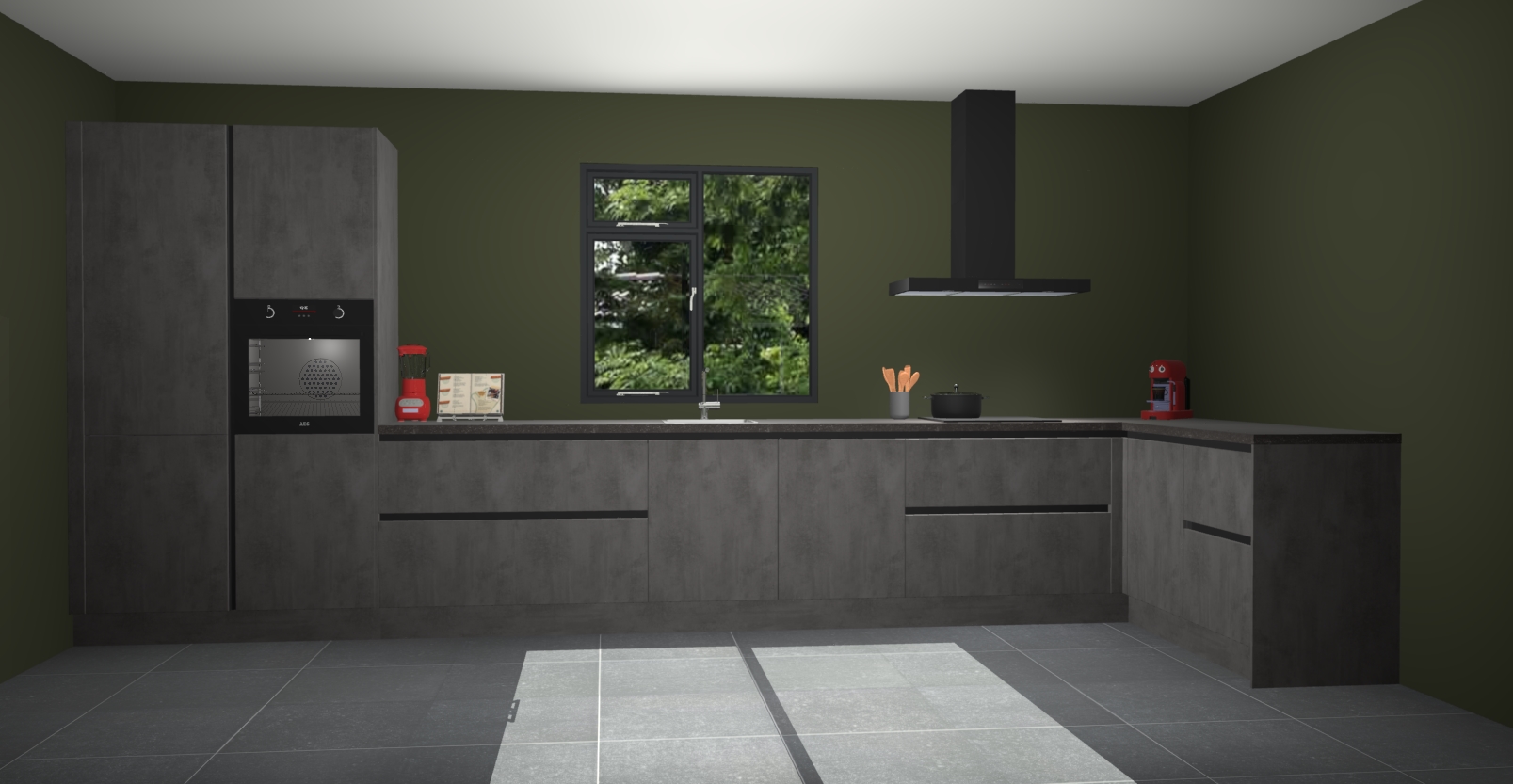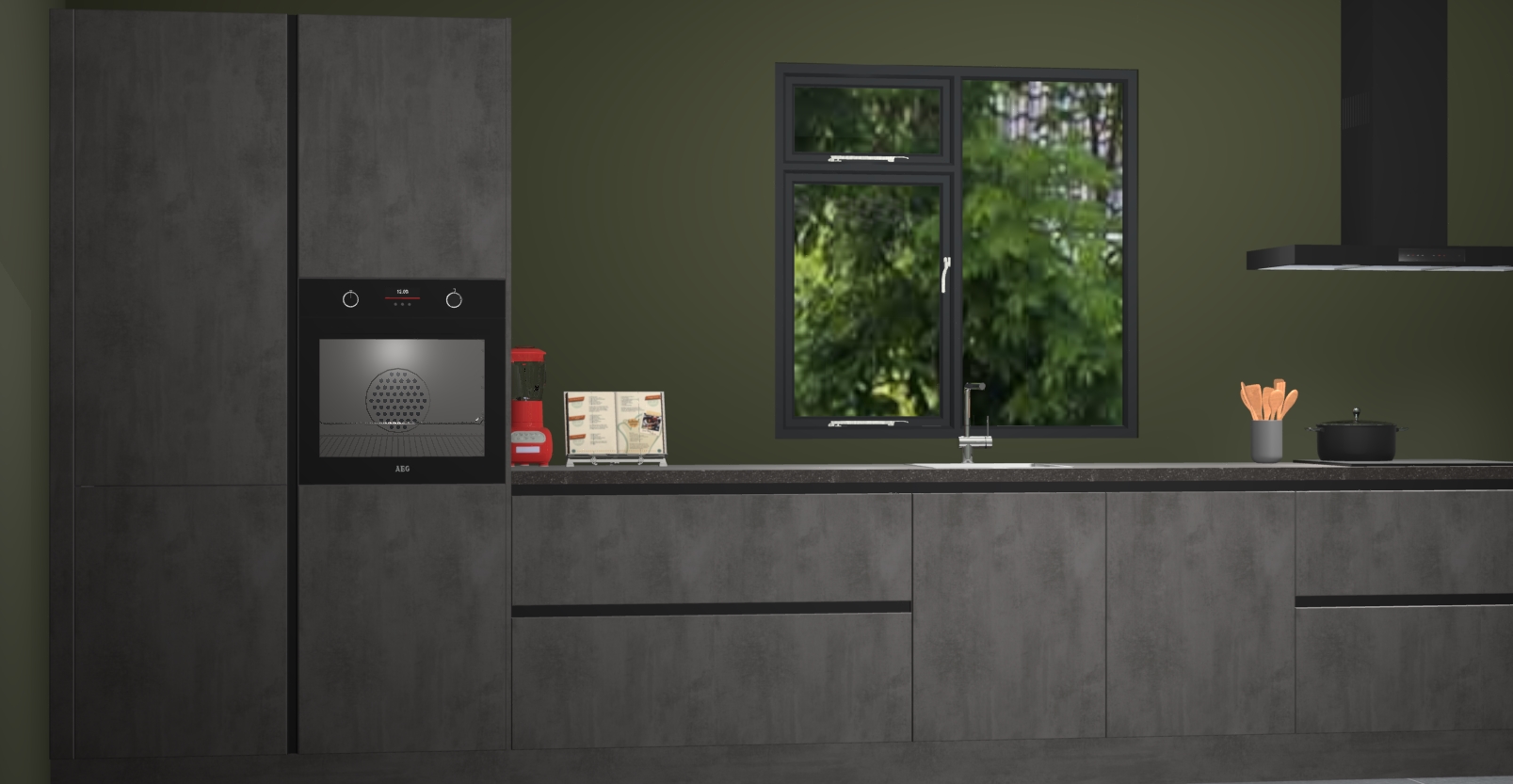 De Beton antraciet keuken Lille wordt geleverd met vijf inbouwapparaten - een oven, inductiekookplaat, afzuigkap, vaatwasser en koelkast. Maar dat is nog niet alles! Na bestelling kunnen deze apparaten eenvoudig worden geüpgraded naar premium AEG-apparatuur. Bovendien is er zelfs de optie om de oven te vervangen door een combimagnetron of uw inductiekookplaat te vervangen door een kookplaat met geïntegreerde afzuiging.