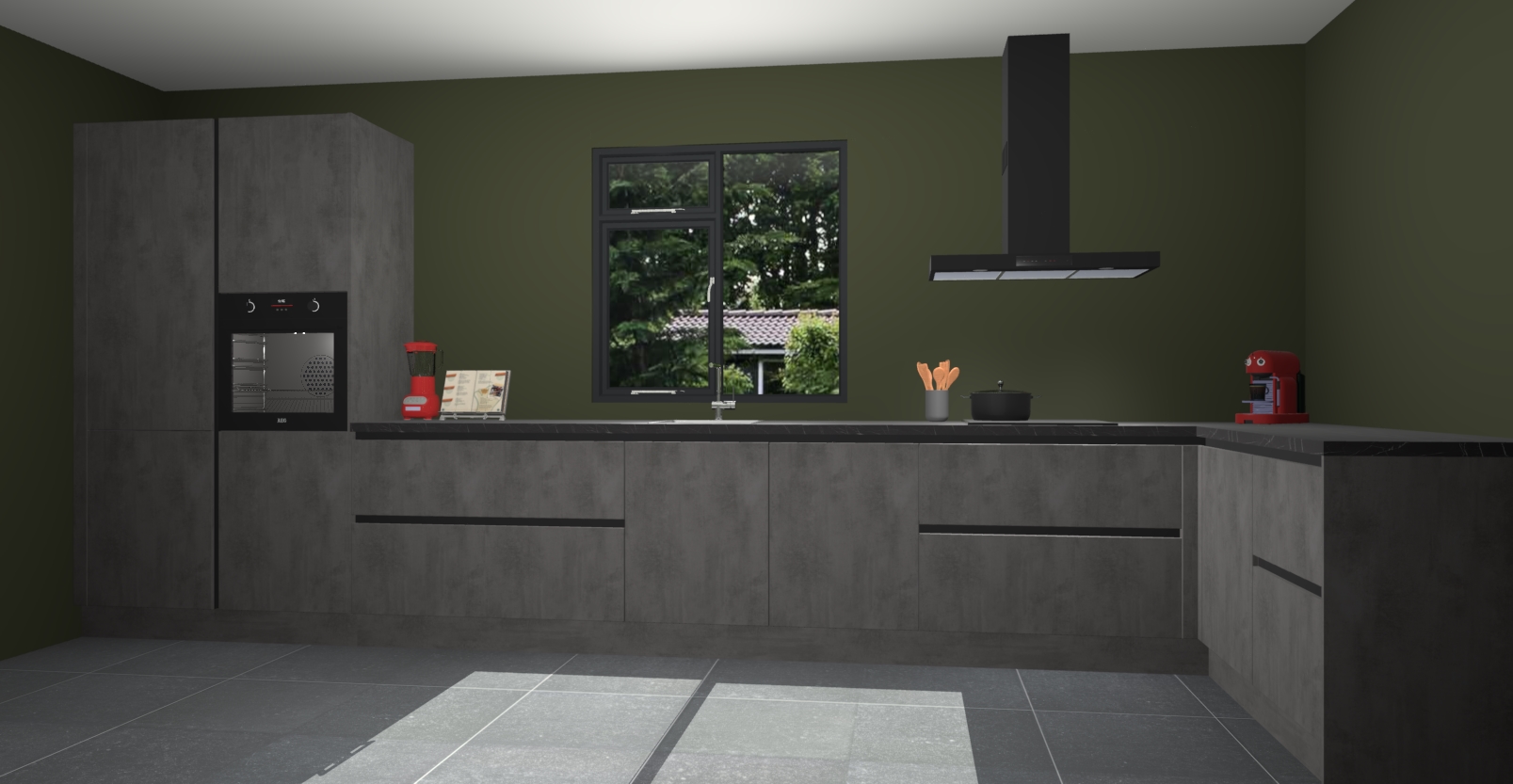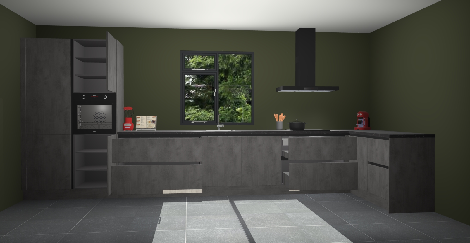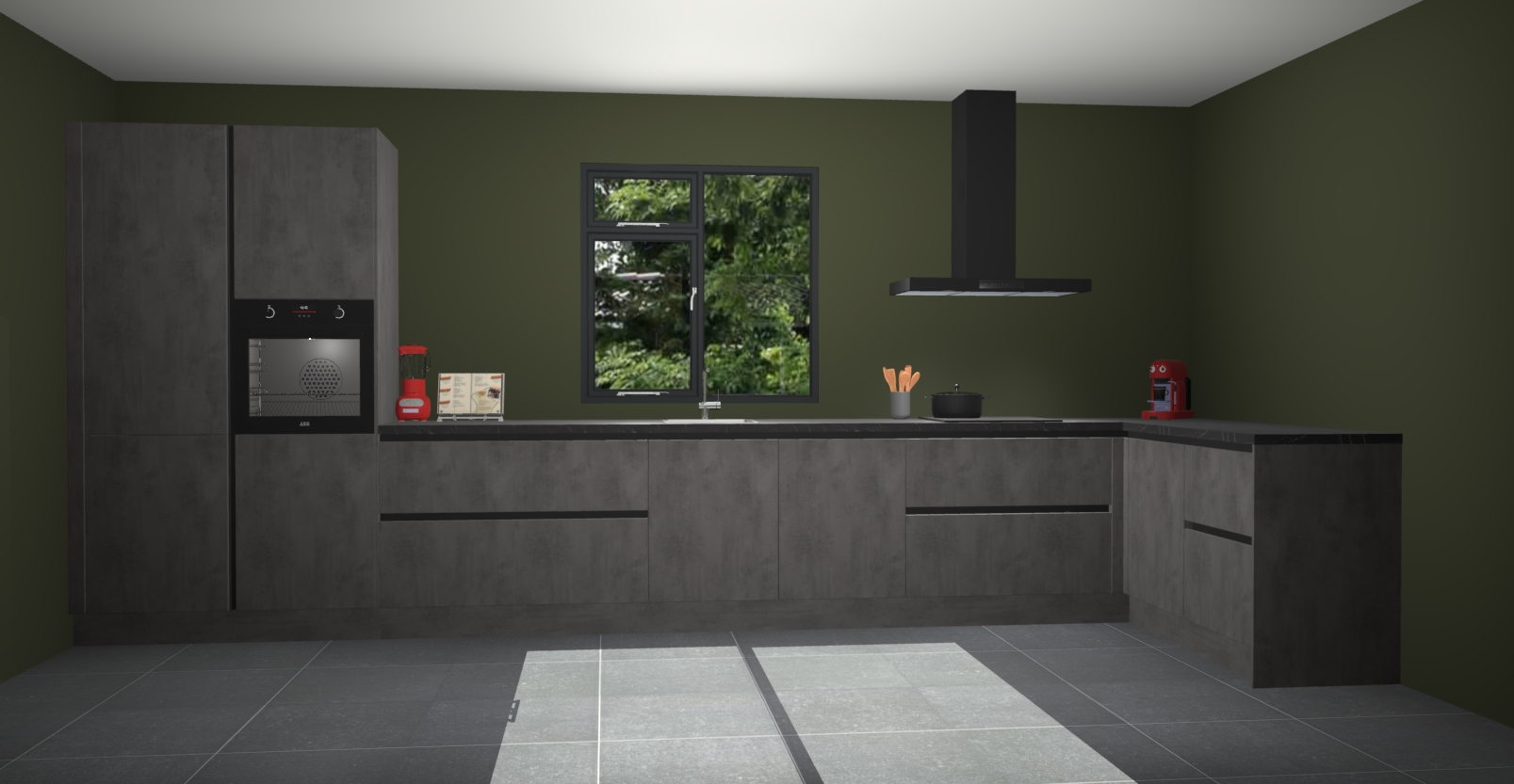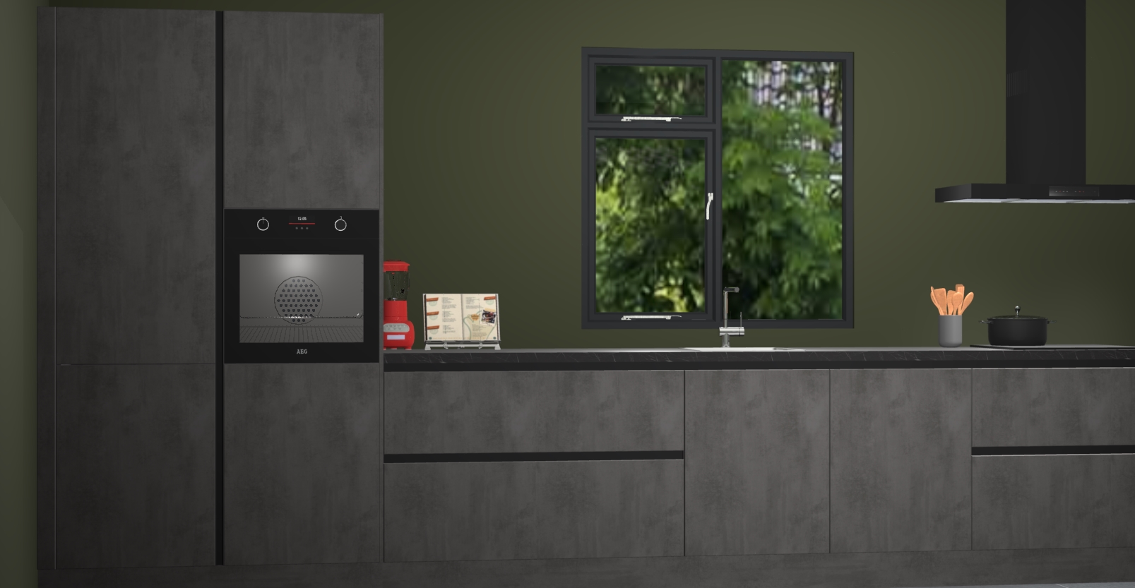 De Beton antraciet keuken Lille wordt geleverd met vijf inbouwapparaten - een oven, inductiekookplaat, afzuigkap, vaatwasser en koelkast. Maar dat is nog niet alles! Na bestelling kunnen deze apparaten eenvoudig worden geüpgraded naar premium AEG-apparatuur. Bovendien is er zelfs de optie om de oven te vervangen door een combimagnetron of uw inductiekookplaat te vervangen door een kookplaat met geïntegreerde afzuiging.