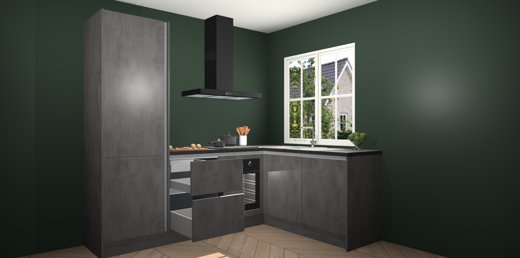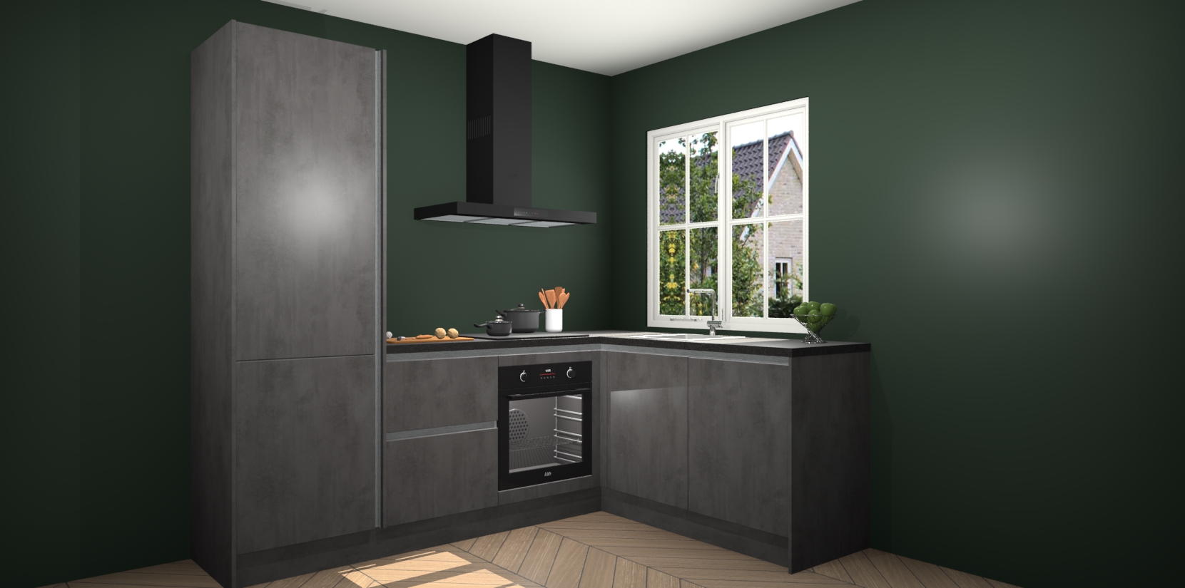 De Beton Antraciet greeploze keuken Linz is de perfecte keuze voor uw nieuwe moderne en tijdloze keuken. Ga voor moderne en tijdloze elegantie in uw keuken. De prachtige hoekkeuken biedt een verfrissende kijk op de manier waarop we ons vertrouwde keukenontwerp kunnen aanpassen in een nieuwe stijl. Één blik om alles te zien: zo mooi dat het bijna magisch lijkt.