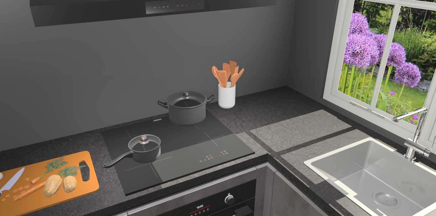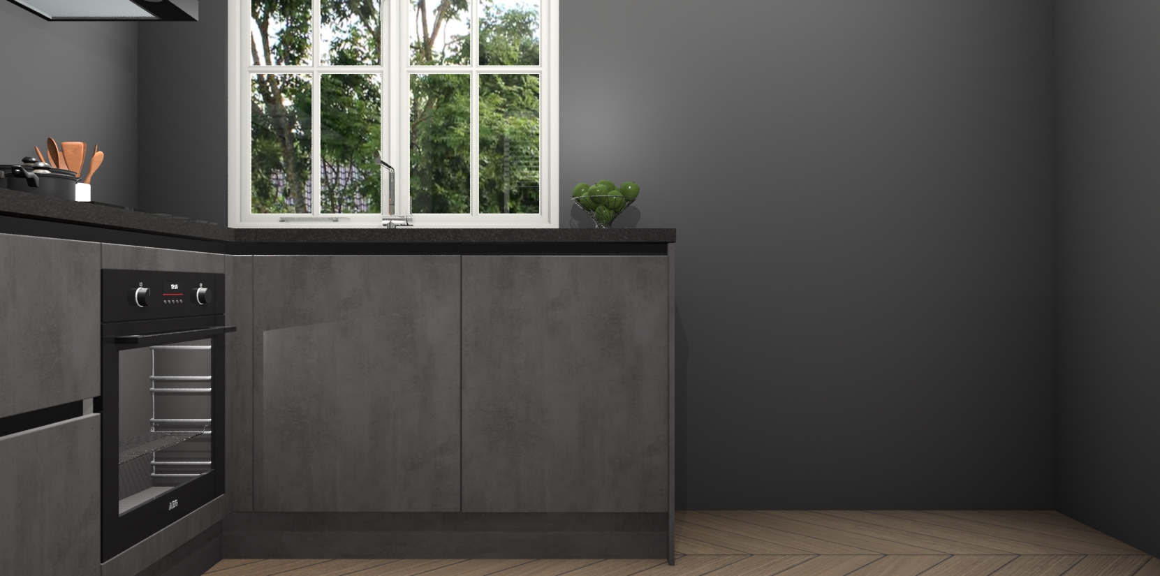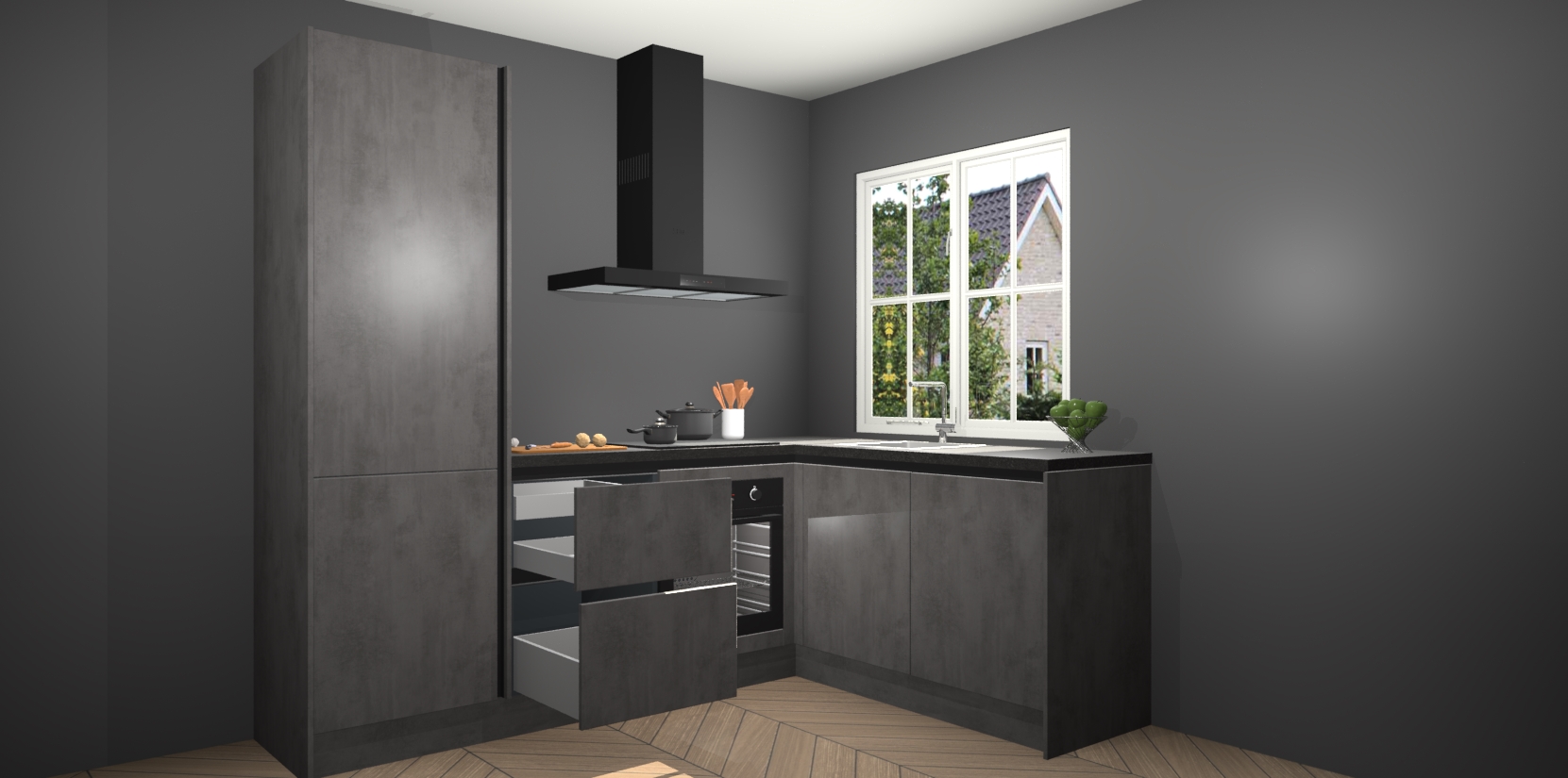De Beton Antraciet greeploze keuken Linz is de perfecte keuze voor uw nieuwe moderne en tijdloze keuken. Ga voor moderne en tijdloze elegantie in uw keuken. De prachtige hoekkeuken biedt een verfrissende kijk op de manier waarop we ons vertrouwde keukenontwerp kunnen aanpassen in een nieuwe stijl.  Één blik om alles te zien: zo mooi dat het bijna magisch lijkt.