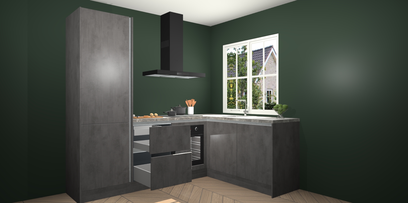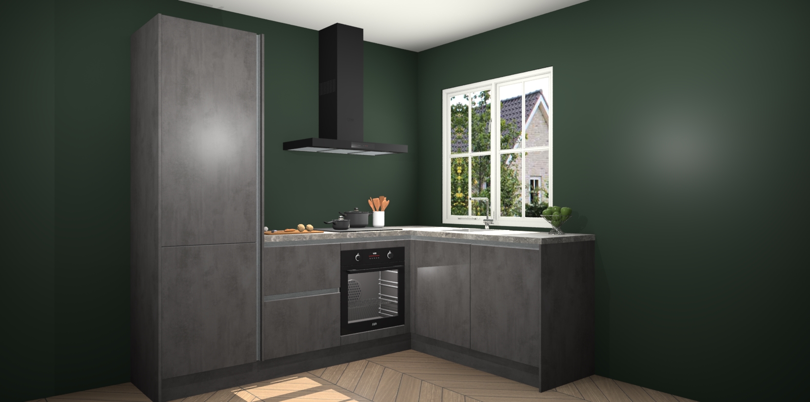 De Beton Antraciet greeploze keuken Linz is de perfecte keuze voor uw nieuwe moderne en tijdloze keuken. Ga voor moderne en tijdloze elegantie in uw keuken. De prachtige hoekkeuken biedt een verfrissende kijk op de manier waarop we ons vertrouwde keukenontwerp kunnen aanpassen in een nieuwe stijl. Één blik om alles te zien: zo mooi dat het bijna magisch lijkt.