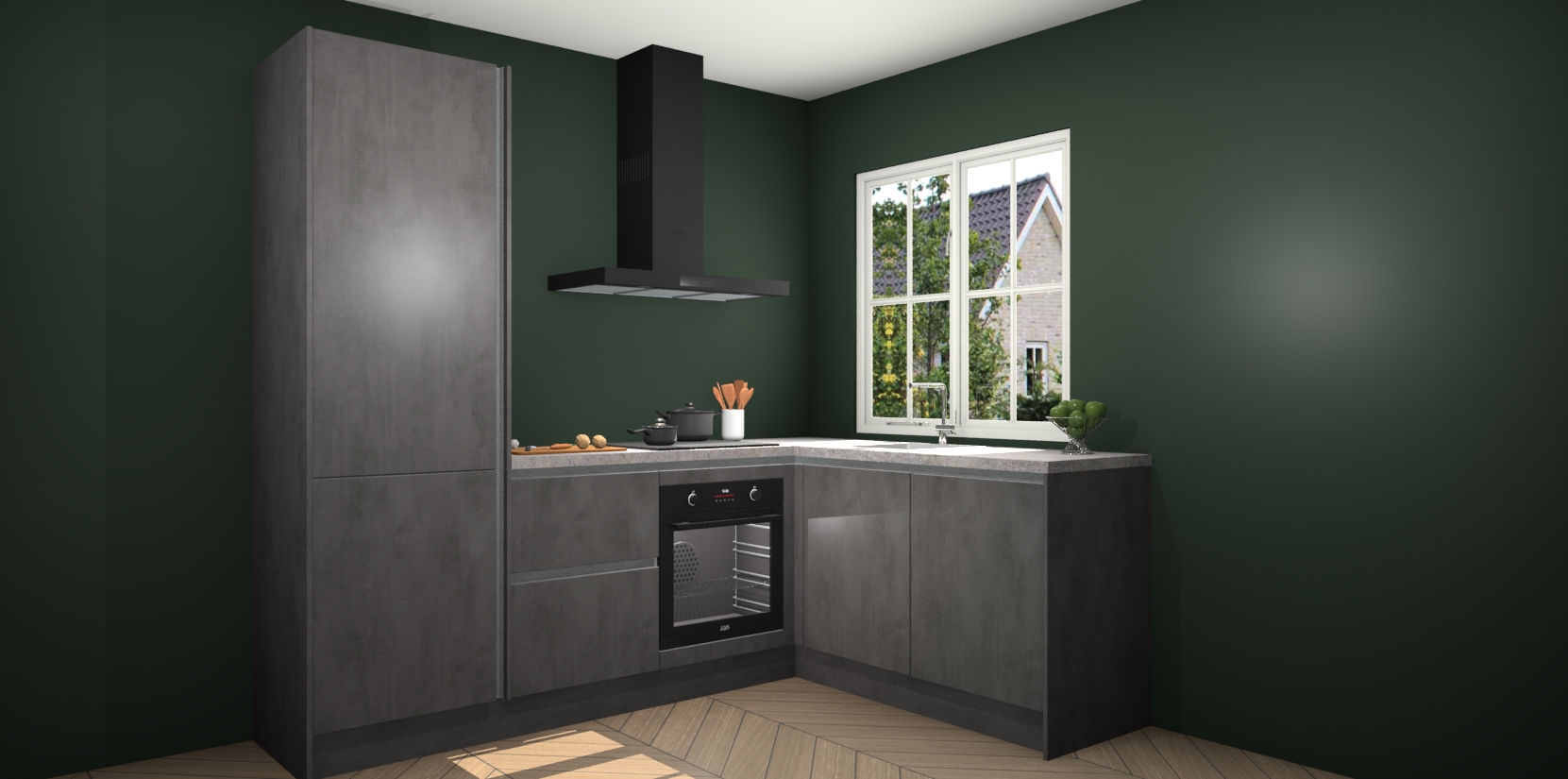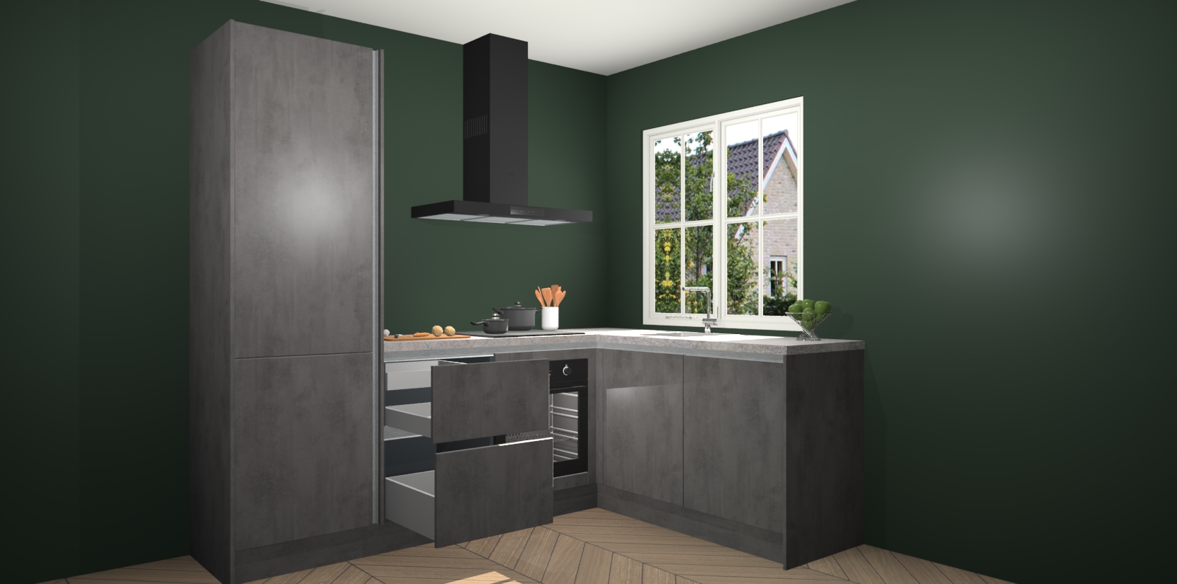 De Beton Antraciet greeploze keuken Linz is de perfecte keuze voor uw nieuwe moderne en tijdloze keuken. Ga voor moderne en tijdloze elegantie in uw keuken. De prachtige hoekkeuken biedt een verfrissende kijk op de manier waarop we ons vertrouwde keukenontwerp kunnen aanpassen in een nieuwe stijl. Één blik om alles te zien: zo mooi dat het bijna magisch lijkt.