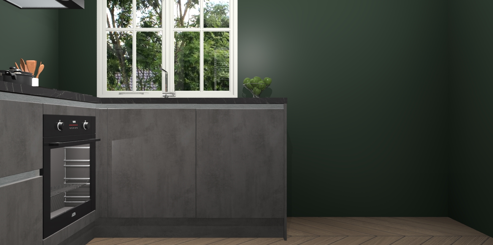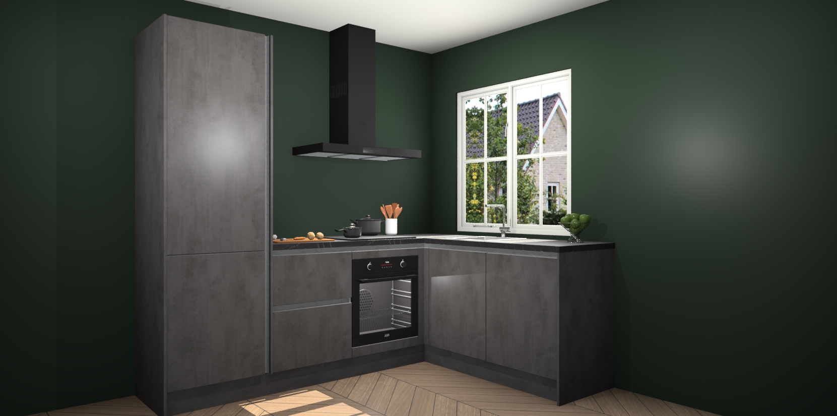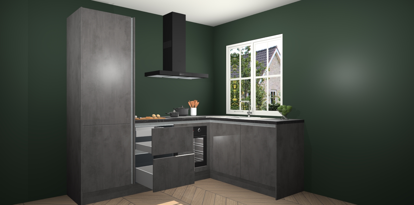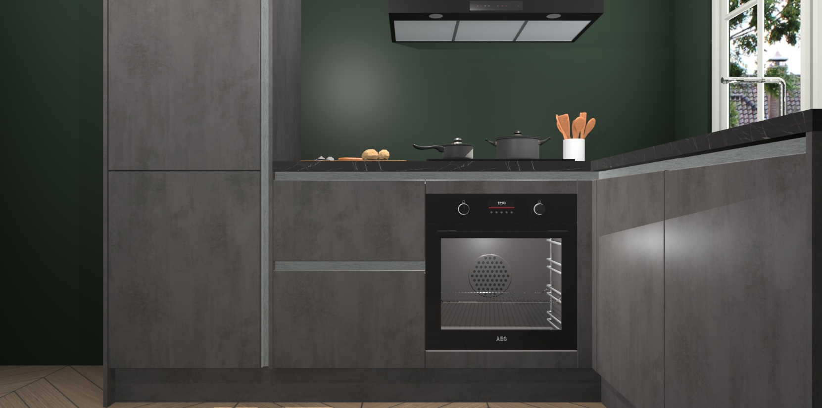 De Beton Antraciet greeploze keuken Linz is de perfecte keuze voor uw nieuwe moderne en tijdloze keuken. Ga voor moderne en tijdloze elegantie in uw keuken. De prachtige hoekkeuken biedt een verfrissende kijk op de manier waarop we ons vertrouwde keukenontwerp kunnen aanpassen in een nieuwe stijl.  Één blik om alles te zien: zo mooi dat het bijna magisch lijkt.