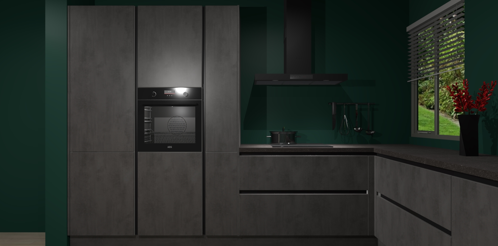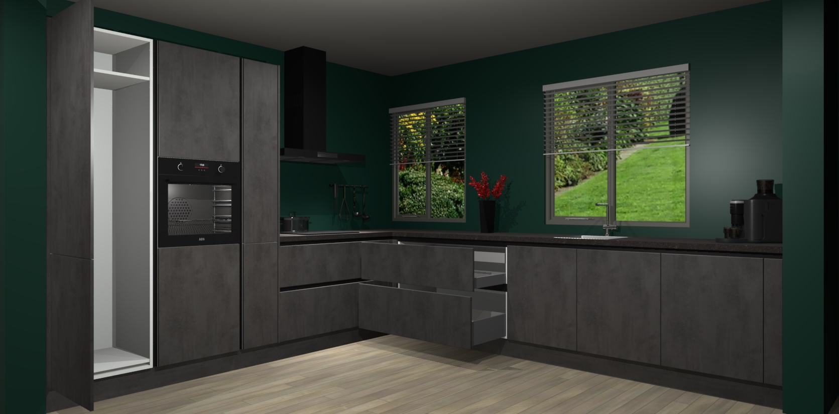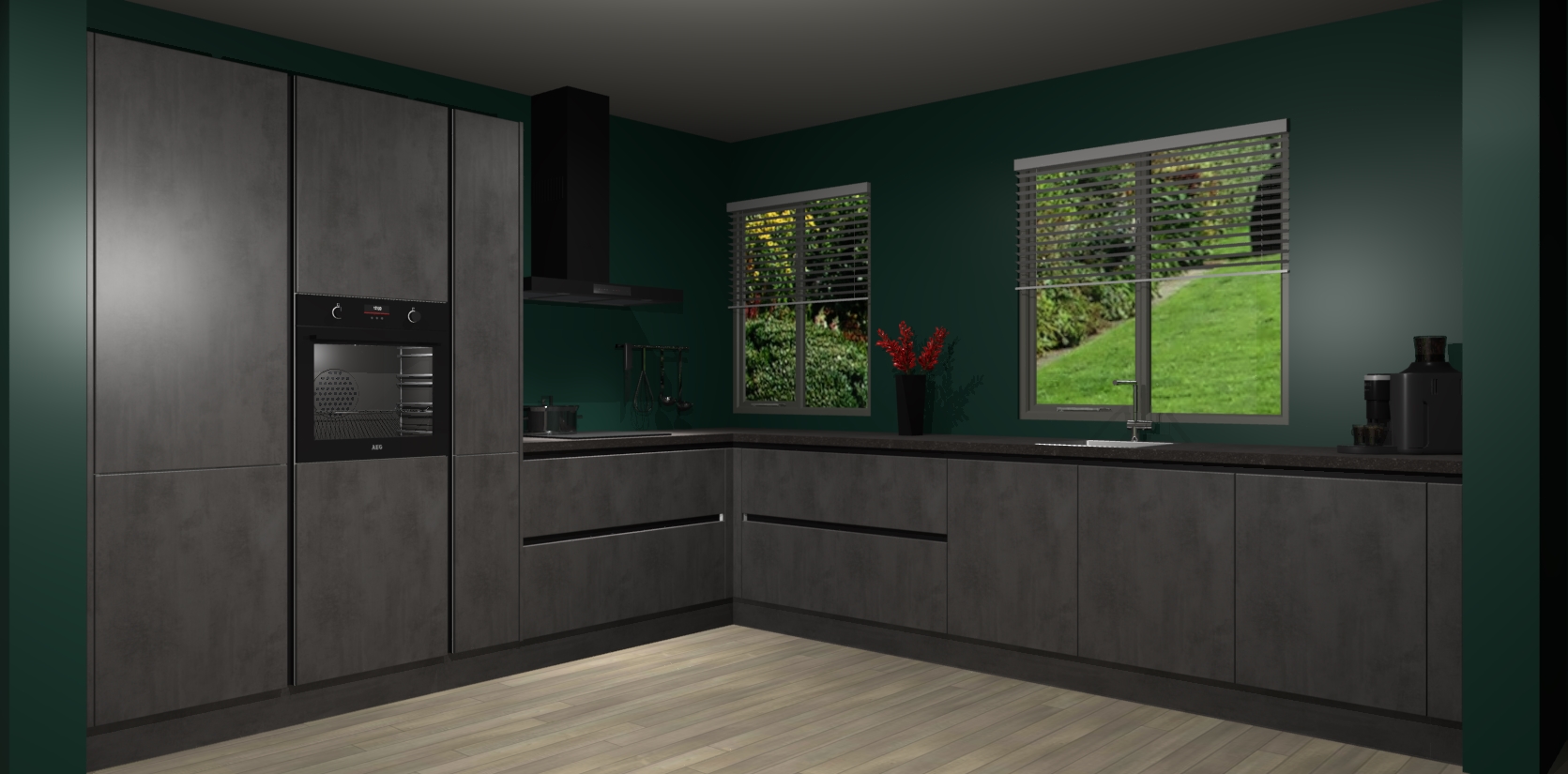 Welkom bij de Beton Antraciet keuken Palermo. Deze prachtige keuken zal de komende jaren het middelpunt van de belangstelling in uw huis zijn. Uitgerust met vijf inbouwapparaten komt u nooit kookgereedschap tekort. Bovendien geeft de warme houtlook elke ruimte een uitnodigende en tijdloze uitstraling.