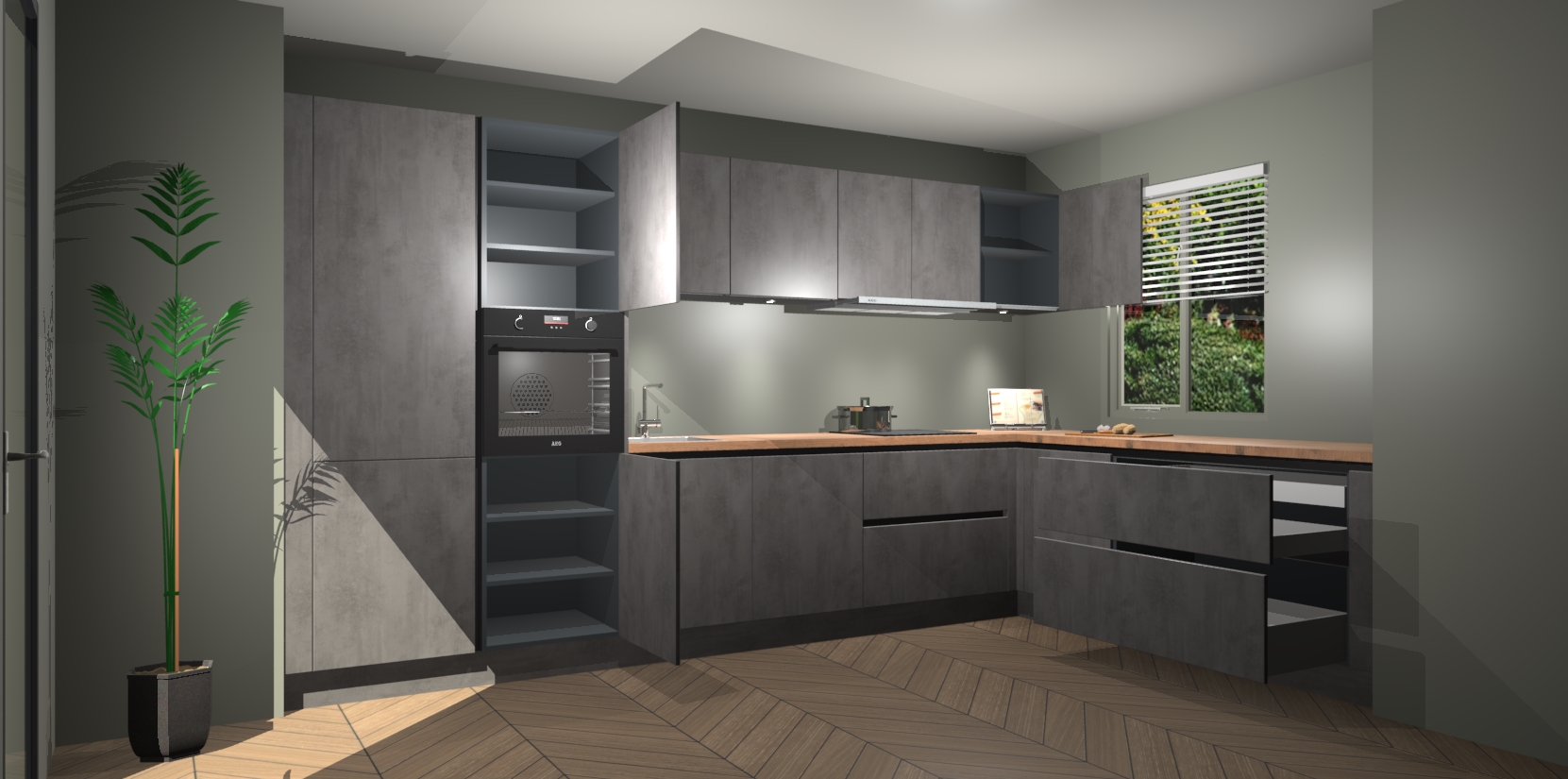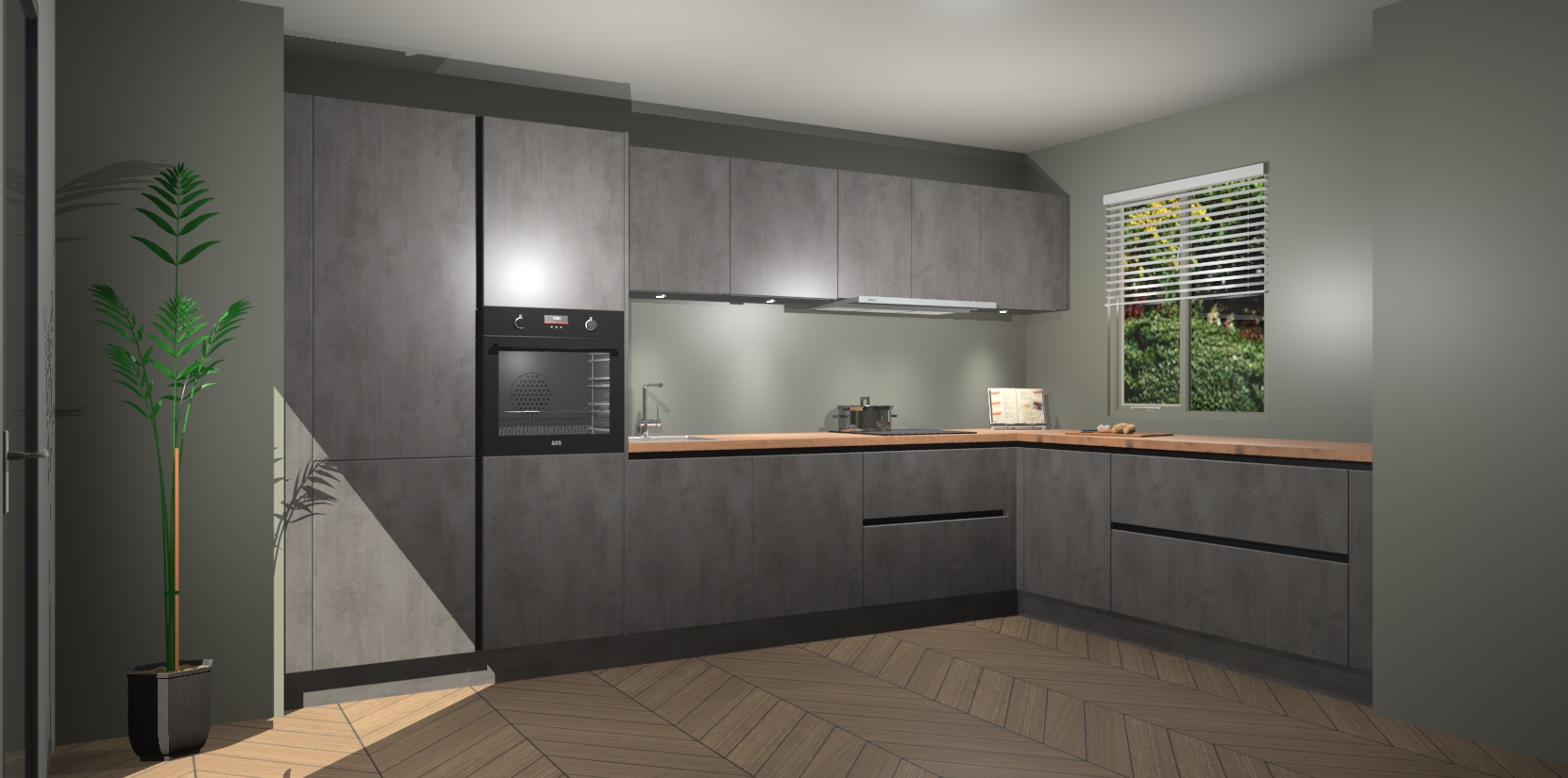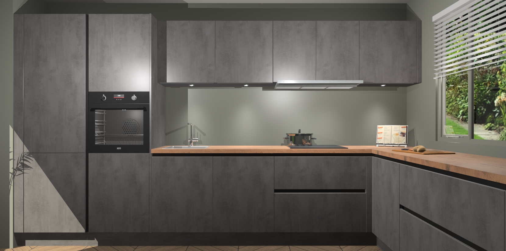Verwelkom de natuurlijke warmte van de Beton Antraciet greeploze keuken Petten in uw huis. Deze prachtige hoekkeuken met zijn moderne design en warme houten look geeft u meer dan genoeg opbergruimte om uw comfortabel te voelen in uw keuken. Geniet van soft-close deuren die al uw gasten het gevoel zullen geven dat ze zich in een luxueuze ruimte bevinden.