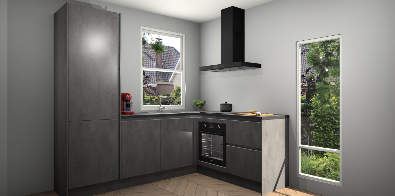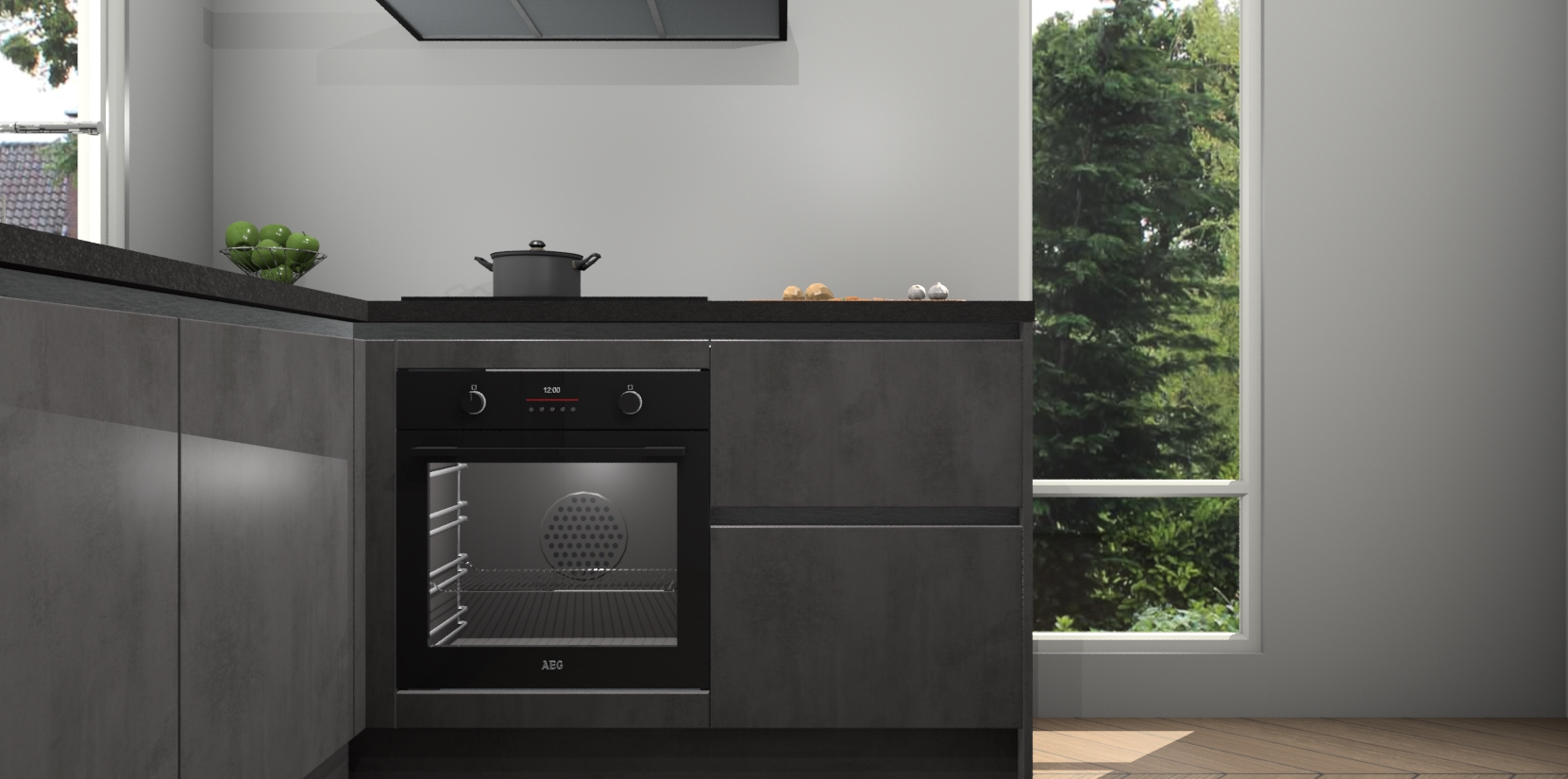 De Beton Antraciet greeploze keuken Phuket heeft alles wat u maar kunt wensen. Niet alleen zijn er softclose deuren, maar ook 5 ingebouwde apparaten: een oven, inductiekookplaat, afzuigkap, vaatwasser en koelkast - waarbij u later gemakkelijk naar het AEG merk, van inductiekookplaat naar kookplaat met geïntegreerde afzuiging of van oven naar combimagnetron kunt upgraden. Dat alles tegen een vast laag tarief! Bovendien geeft de Beton Antraciet greeploze keuken Phuket supersnelle levering van 7 weken. Echt iets voor u als u er niet op wilt wachten om het resultaat te zien in eigen keuken!