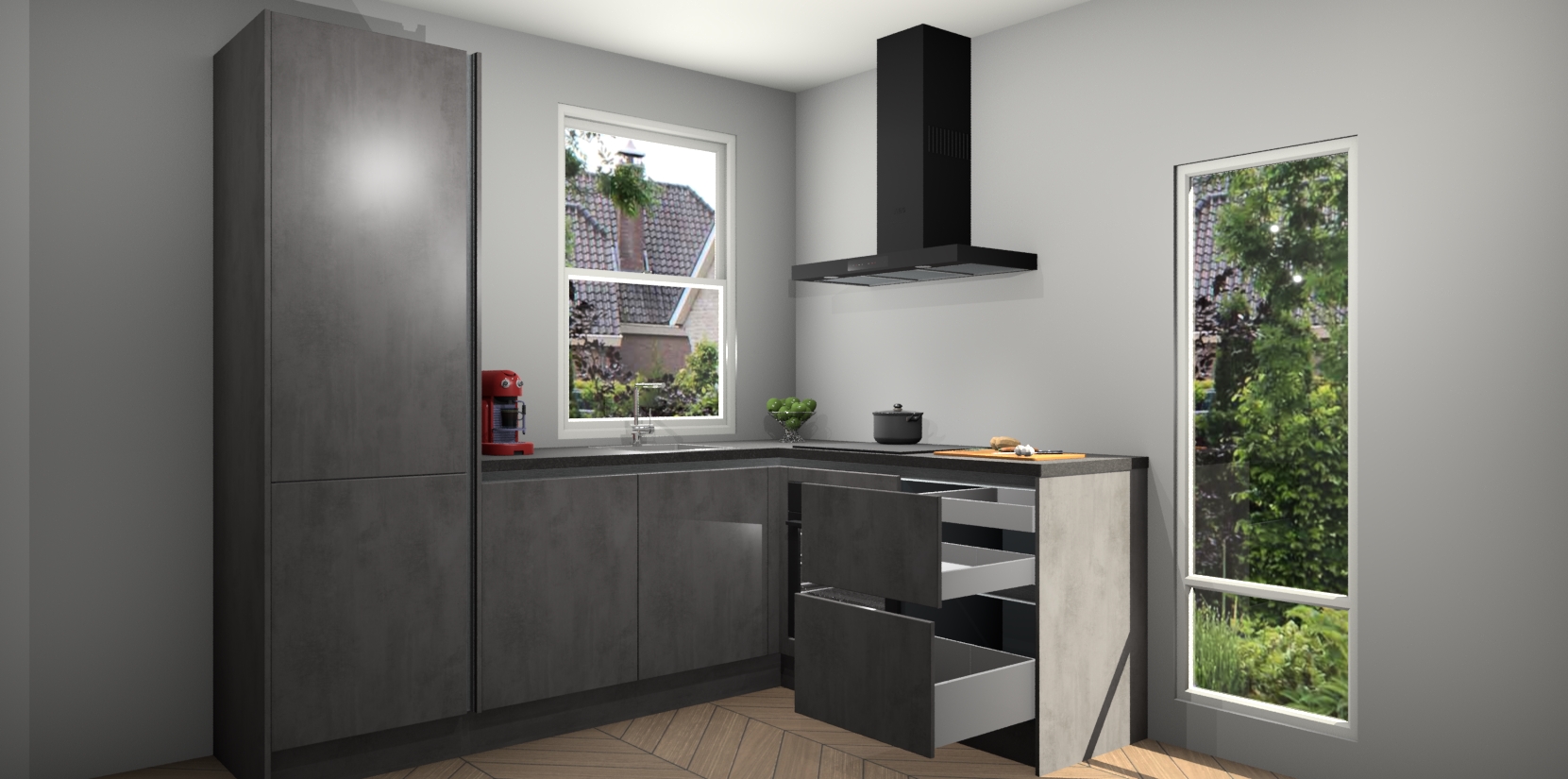 De prachtige Beton Antraciet greeploze keuken Phuket is de perfecte keuze als u op zoek bent naar een moderne hoekkeuken met alle luxe en comfort die u kunt verwachten! De uitstraling in het houtlook-design draagt bij aan de warme sfeer die u nu al voelt wanneer u er naar kijkt. Heeft u genoeg van ouderwetse keukens? Probeer dan direct deze moderne, mooie hoekkeukens en laat iedereen verbluft achter!