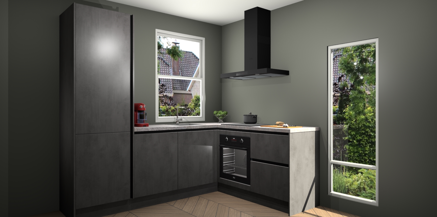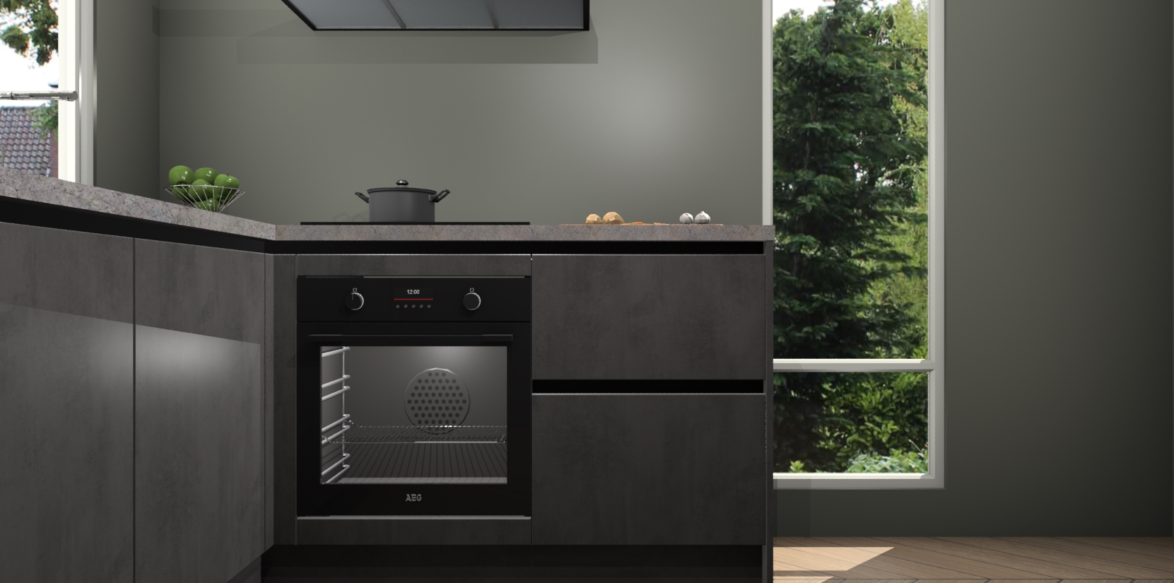De Beton Antraciet greeploze keuken Phuket heeft alles wat u maar kunt wensen. Niet alleen zijn er softclose deuren, maar ook 5 ingebouwde apparaten: een oven, inductiekookplaat, afzuigkap, vaatwasser en koelkast - waarbij u later gemakkelijk naar het AEG merk, van inductiekookplaat naar kookplaat met geïntegreerde afzuiging of van oven naar combimagnetron kunt upgraden. Dat alles tegen een vast laag tarief! Bovendien geeft de Beton Antraciet greeploze keuken Phuket supersnelle levering van 7 weken. Echt iets voor u als u er niet op wilt wachten om het resultaat te zien in eigen keuken!