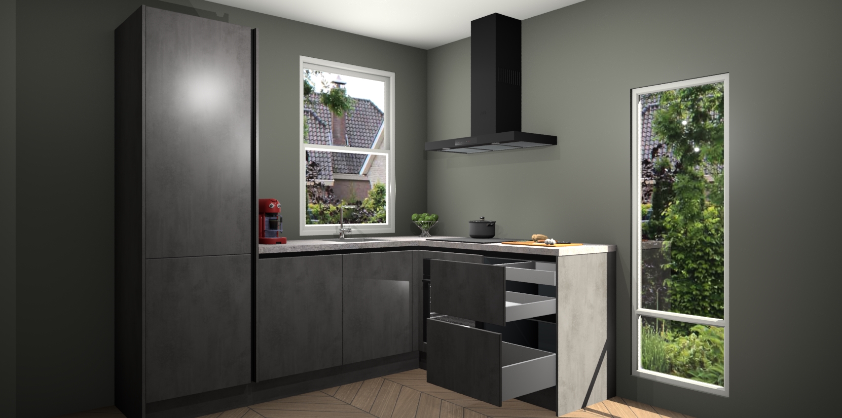 De prachtige Beton Antraciet greeploze keuken Phuket is de perfecte keuze als u op zoek bent naar een moderne hoekkeuken met alle luxe en comfort die u kunt verwachten! De uitstraling in het houtlook-design draagt bij aan de warme sfeer die u nu al voelt wanneer u er naar kijkt. Heeft u genoeg van ouderwetse keukens? Probeer dan direct deze moderne, mooie hoekkeukens en laat iedereen verbluft achter!