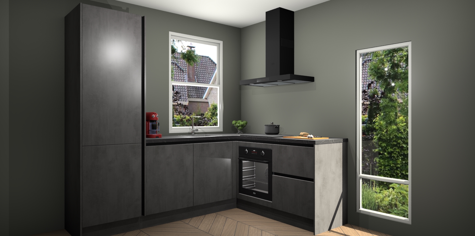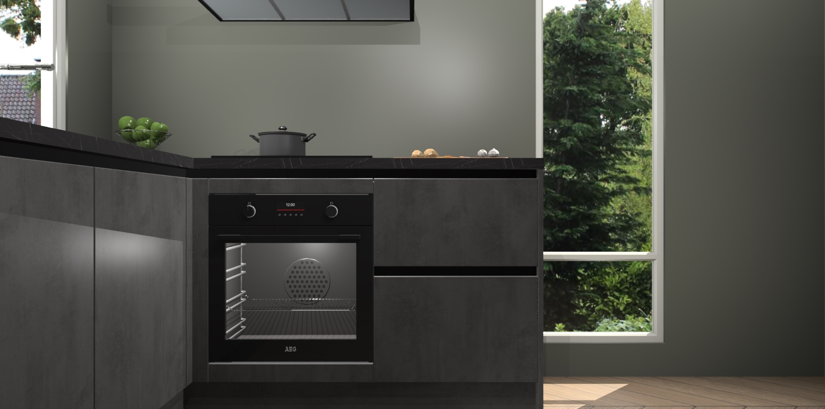 De Beton Antraciet greeploze keuken Phuket heeft alles wat u maar kunt wensen. Niet alleen zijn er softclose deuren, maar ook 5 ingebouwde apparaten: een oven, inductiekookplaat, afzuigkap, vaatwasser en koelkast - waarbij u later gemakkelijk naar het AEG merk, van inductiekookplaat naar kookplaat met geïntegreerde afzuiging of van oven naar combimagnetron kunt upgraden. Dat alles tegen een vast laag tarief! Bovendien geeft de Beton Antraciet greeploze keuken Phuket supersnelle levering van 7 weken. Echt iets voor u als u er niet op wilt wachten om het resultaat te zien in eigen keuken!