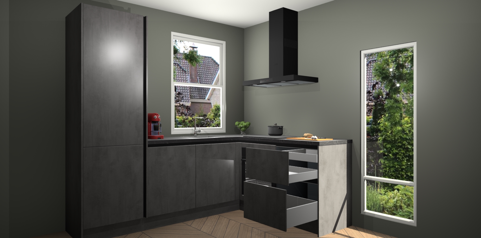 De prachtige Beton Antraciet greeploze keuken Phuket is de perfecte keuze als u op zoek bent naar een moderne hoekkeuken met alle luxe en comfort die u kunt verwachten! De uitstraling in het houtlook-design draagt bij aan de warme sfeer die u nu al voelt wanneer u er naar kijkt. Heeft u genoeg van ouderwetse keukens? Probeer dan direct deze moderne, mooie hoekkeukens en laat iedereen verbluft achter!
