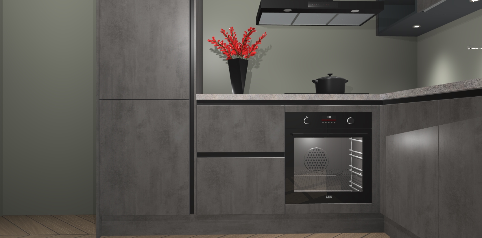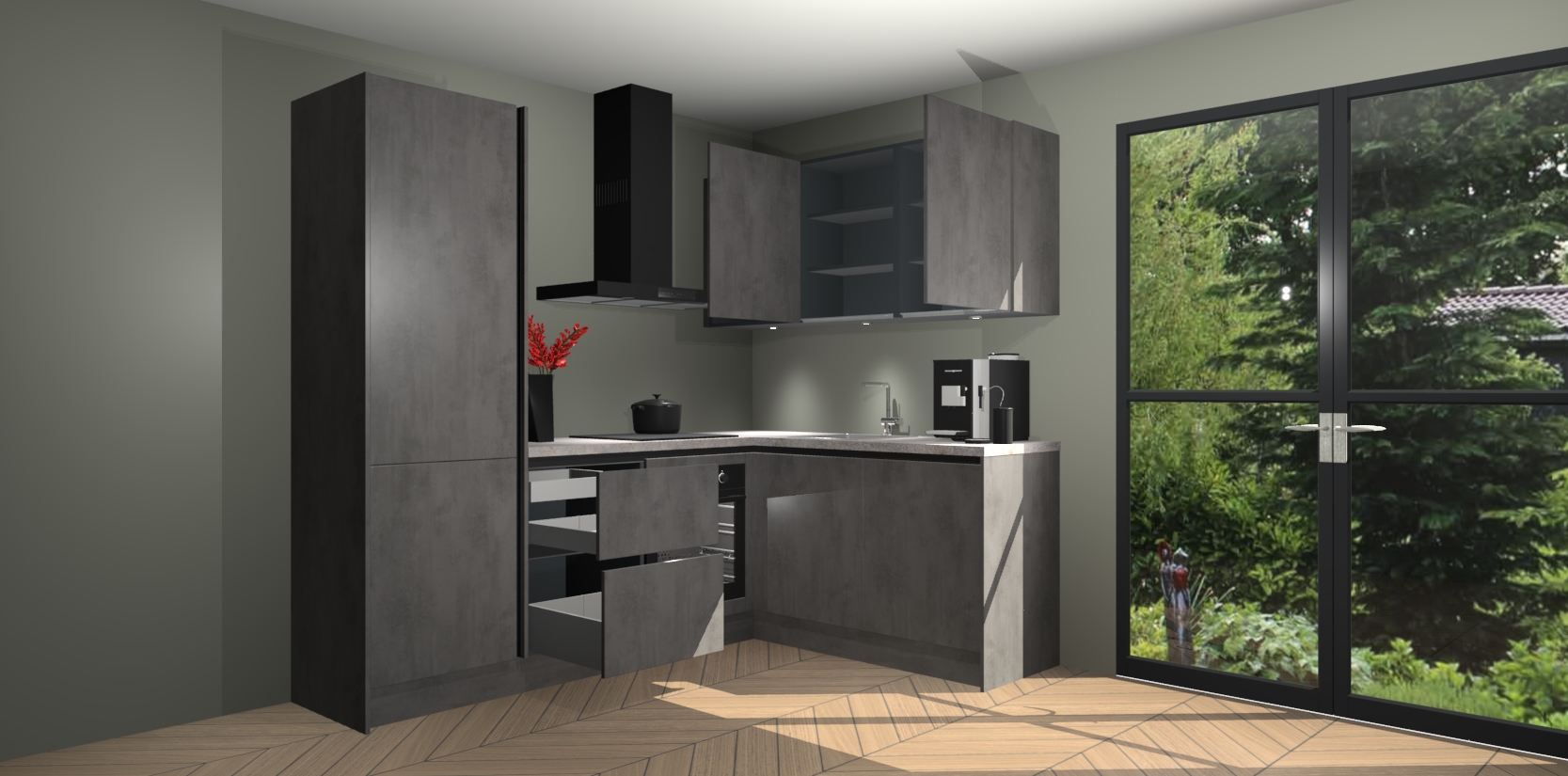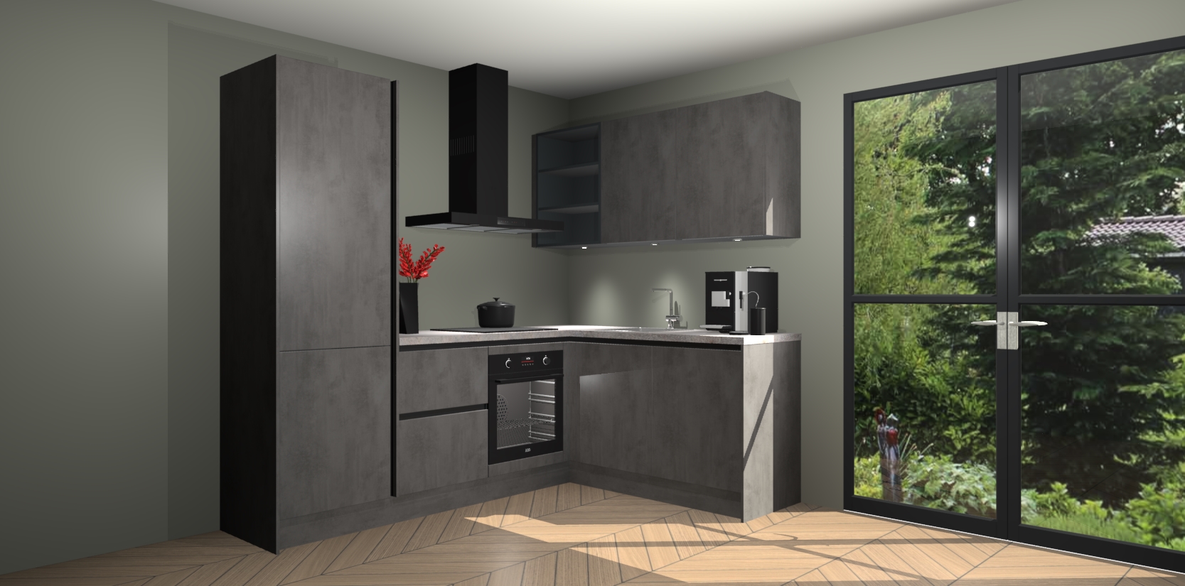 Wauw, dit is de Beton Antraciet greeploze keuken Pilsen! U kunt gerust zeggen dat u elegantie combineert met functionaliteit met deze keuken. Met een modern en chique ontwerp is de keuken precies wat u nodig heeft om uw ruimte te verfraaien. De binnenzijde van de kasten is in dezelfde donkere kleur als de buitenzijde voor een uniforme look, compleet met softclose-kasten die stil sluiten.