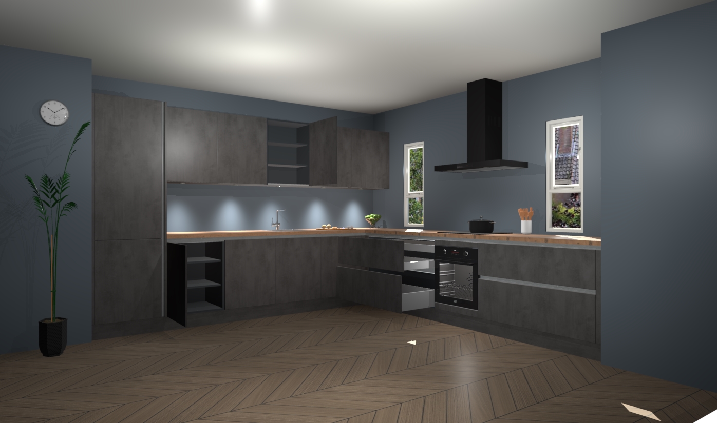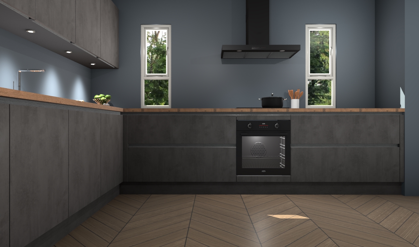 De beton antraciet greeploze keuken is een ideale hoekkeuken en heeft alle functies en apparatuur die u maar nodig kunt hebben. Bij de bestelling krijgt u een oven, inductiekookplaat, afzuigkap, vaatwasser en koelkast - deze kunnen desgewenst eenvoudig worden uitgebreid naar AEG na bestellen. Elke kast wordt ook voor gemonteerd geleverd met soft close deuren die jarenlang gebruik beloven. Stelt u zich voor dat u geen gedoe heeft met vervelende montage - vanaf het moment dat u uw bestelling plaats, duurt het slechts 7 weken voor het bij u thuis geleverd wordt.