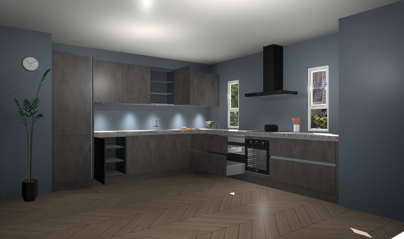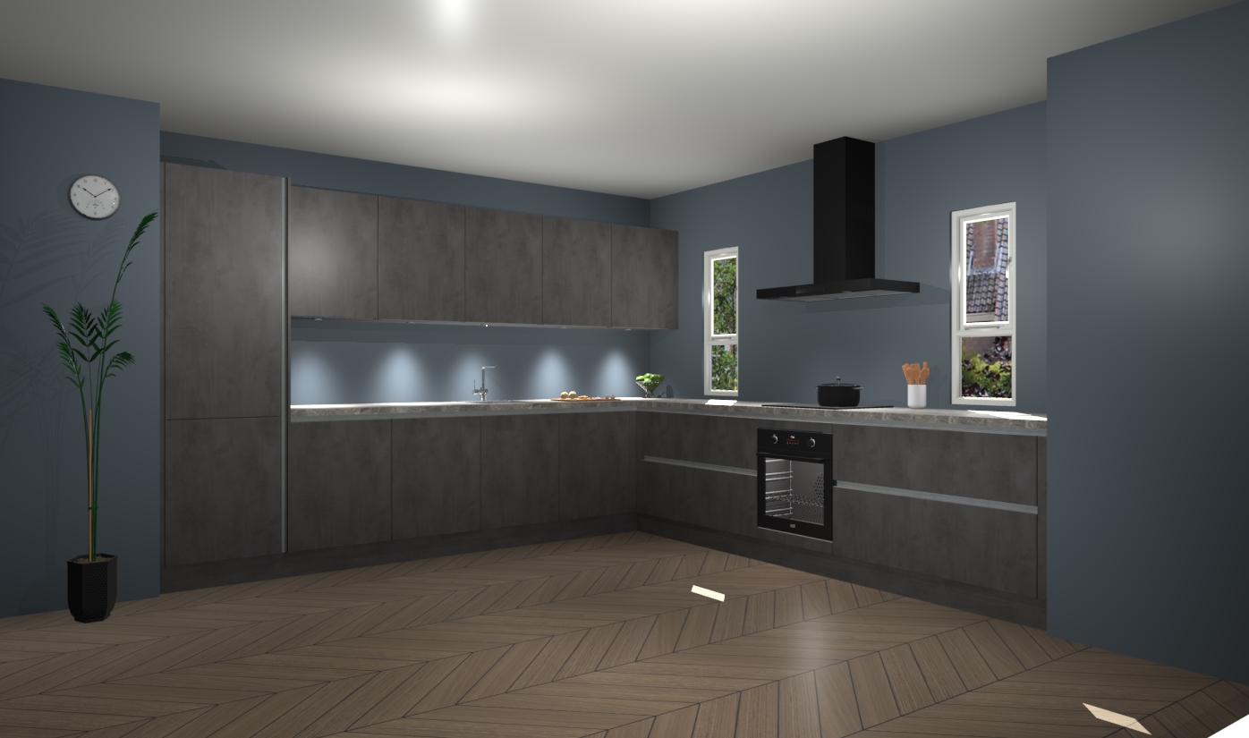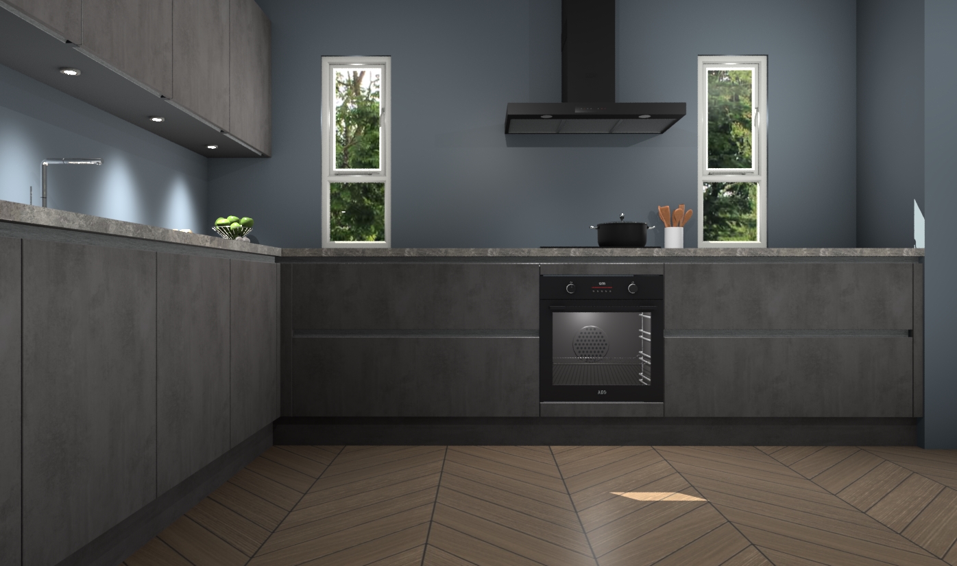 De beton antraciet greeploze keuken is een ideale hoekkeuken en heeft alle functies en apparatuur die u maar nodig kunt hebben. Bij de bestelling krijgt u een oven, inductiekookplaat, afzuigkap, vaatwasser en koelkast - deze kunnen desgewenst eenvoudig worden uitgebreid naar AEG na bestellen. Elke kast wordt ook voor gemonteerd geleverd met soft close deuren die jarenlang gebruik beloven. Stelt u zich voor dat u geen gedoe heeft met vervelende montage - vanaf het moment dat u uw bestelling plaats, duurt het slechts 7 weken voor het bij u thuis geleverd wordt.