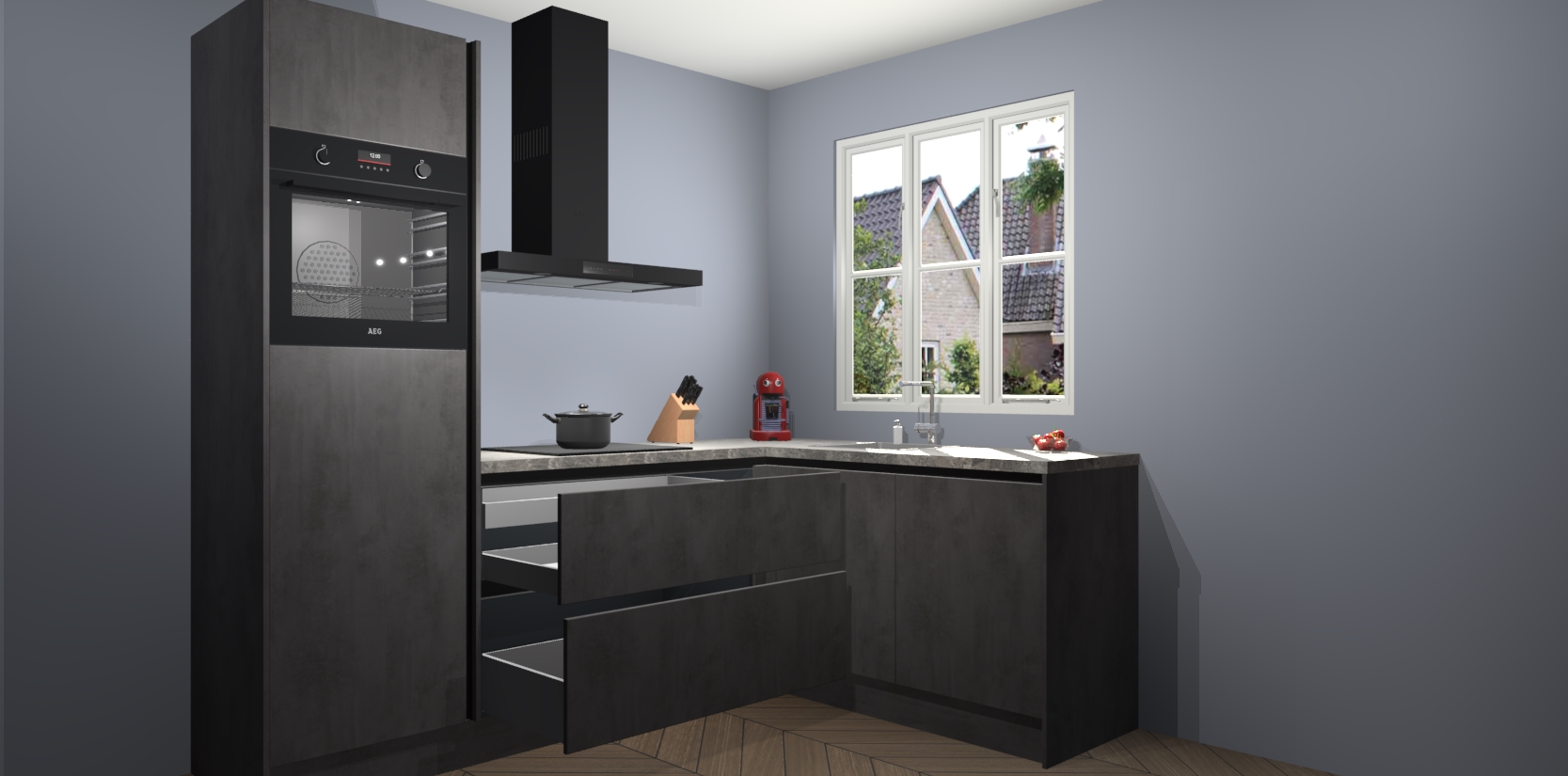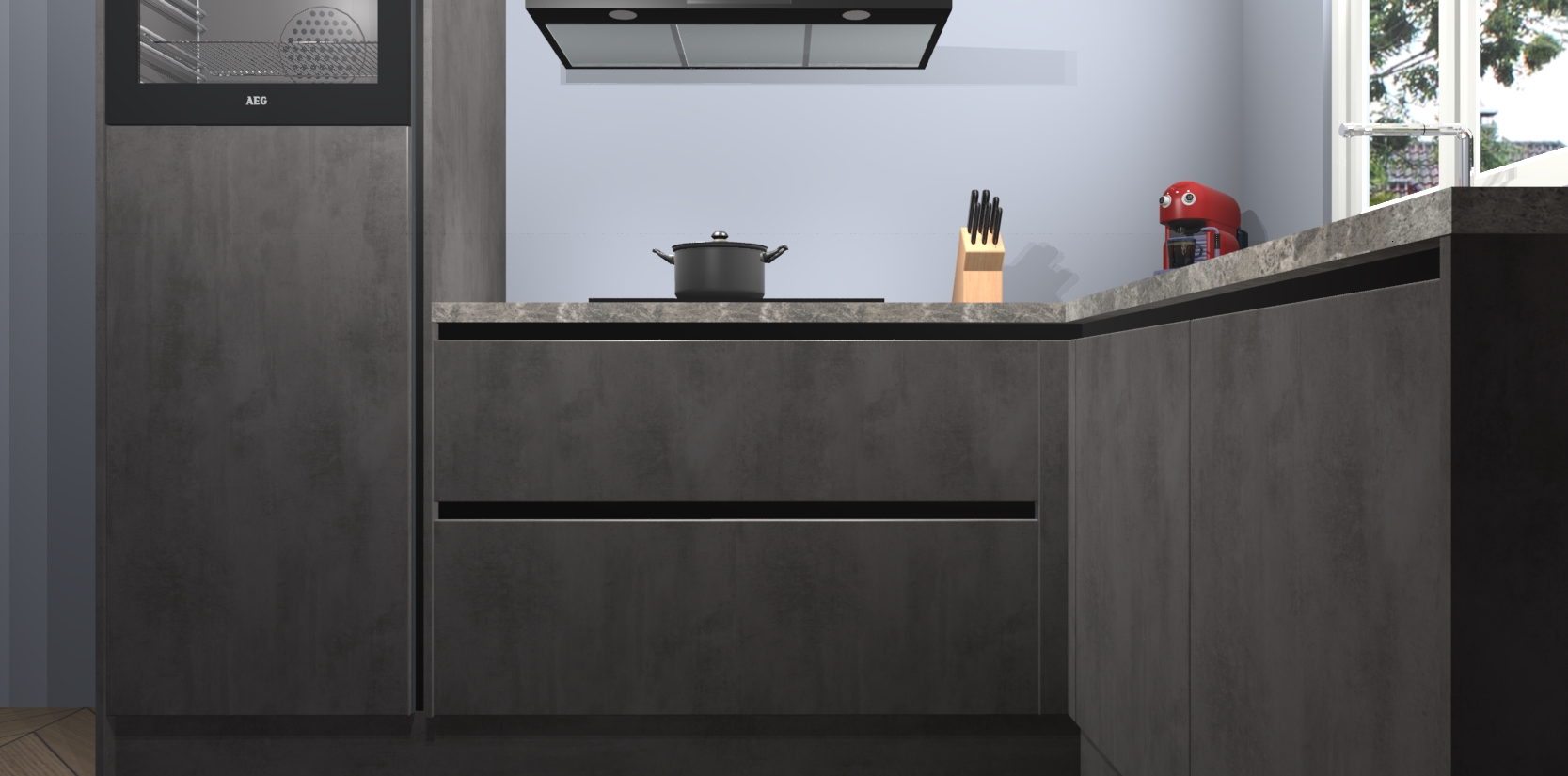 Dit model biedt u voldoende opbergruimte en vijf ingebouwde apparaten: een oven, inductiekookplaat, afzuigkap, vaatwasser en koelkast. Deze apparaten kunnen gemakkelijk worden geüpgrade naar AEG nadat u besteld heeft. De verschillende laden en kastjes bevatten softclose-deuren waardoor ze gezellig dichtvallen met een geruststellend helemaal geruisloos geluid. En dat is nog niet alles! We garanderen ook dat de prijs altijd laag blijft - dus haal nu uw Beton Antraciet greeploze keuken Victoria terwijl het kan.