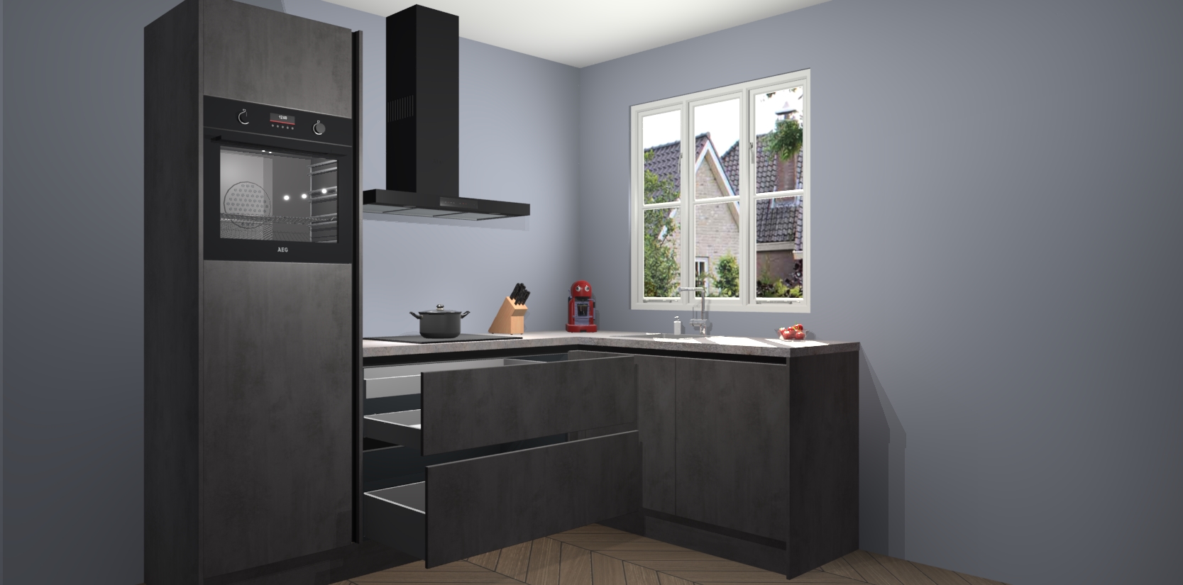 Dit model biedt u voldoende opbergruimte en vijf ingebouwde apparaten: een oven, inductiekookplaat, afzuigkap, vaatwasser en koelkast. Deze apparaten kunnen gemakkelijk worden geüpgrade naar AEG nadat u besteld heeft. De verschillende laden en kastjes bevatten softclose-deuren waardoor ze gezellig dichtvallen met een geruststellend helemaal geruisloos geluid. En dat is nog niet alles! We garanderen ook dat de prijs altijd laag blijft - dus haal nu uw Beton Antraciet greeploze keuken Victoria terwijl het kan.