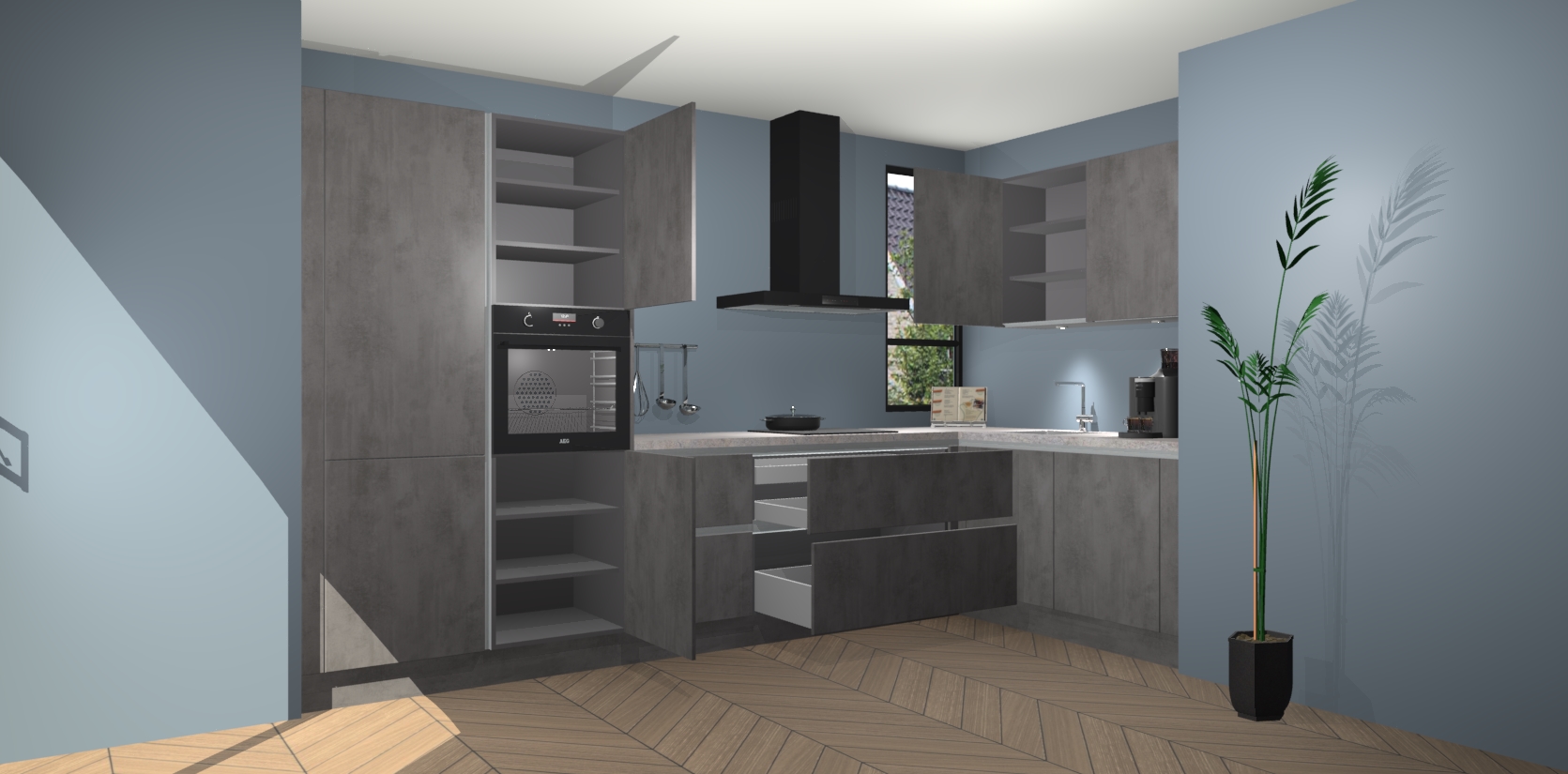 Welkom in uw nieuwe moderne keuken! Laat ons u voorstellen aan de Beton Antraciet greeploze keuken Vlaanderen . Deze prachtige hoekkeuken straalt exclusiviteit en luxe uit als geen ander. Het strakke design, de tijdloze kleuren en het greeploze model maken van deze keuken een moderne klassieker. En met voldoende opbergruimte heeft deze keuken echt voor ieder wat wils.