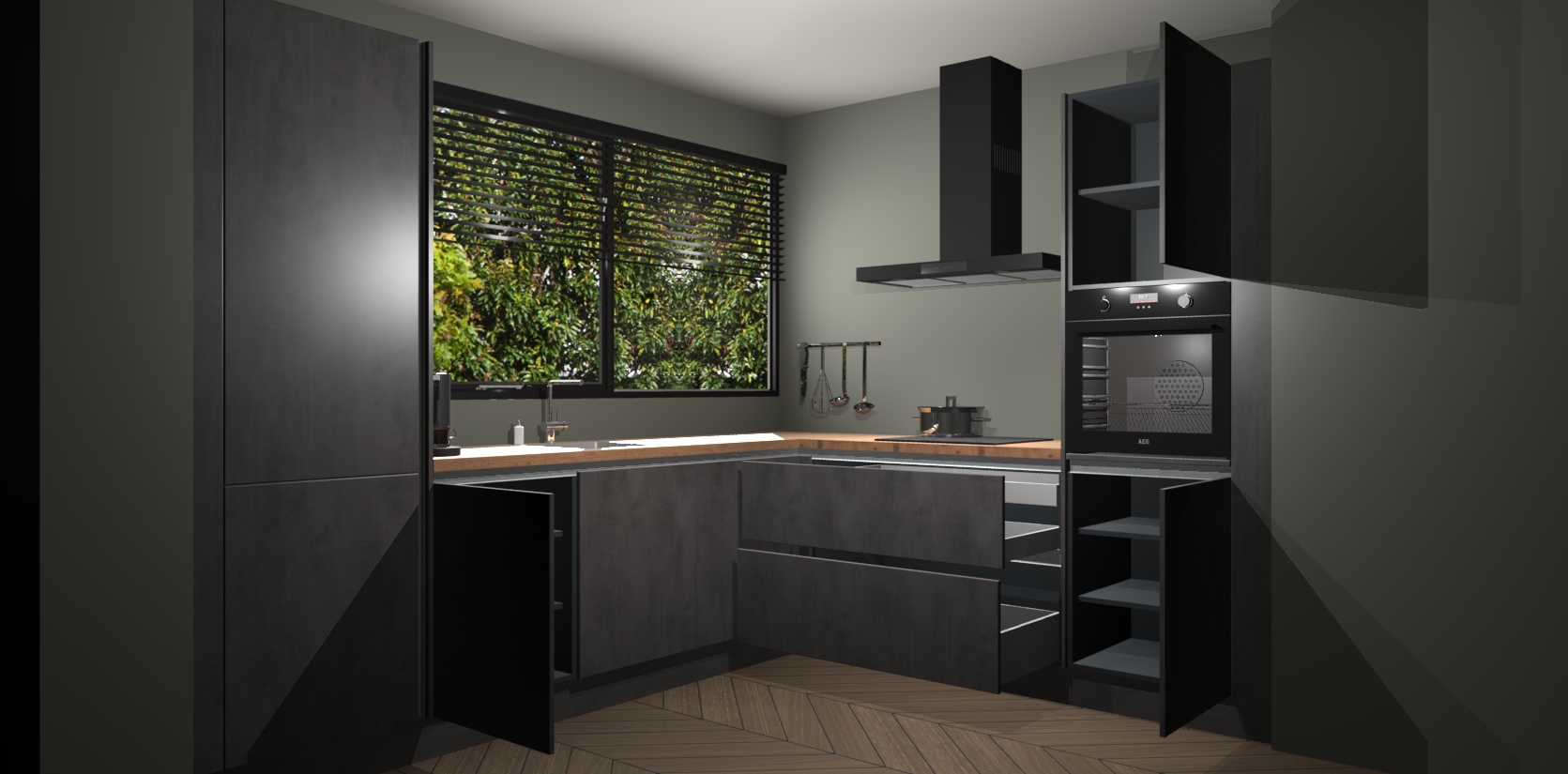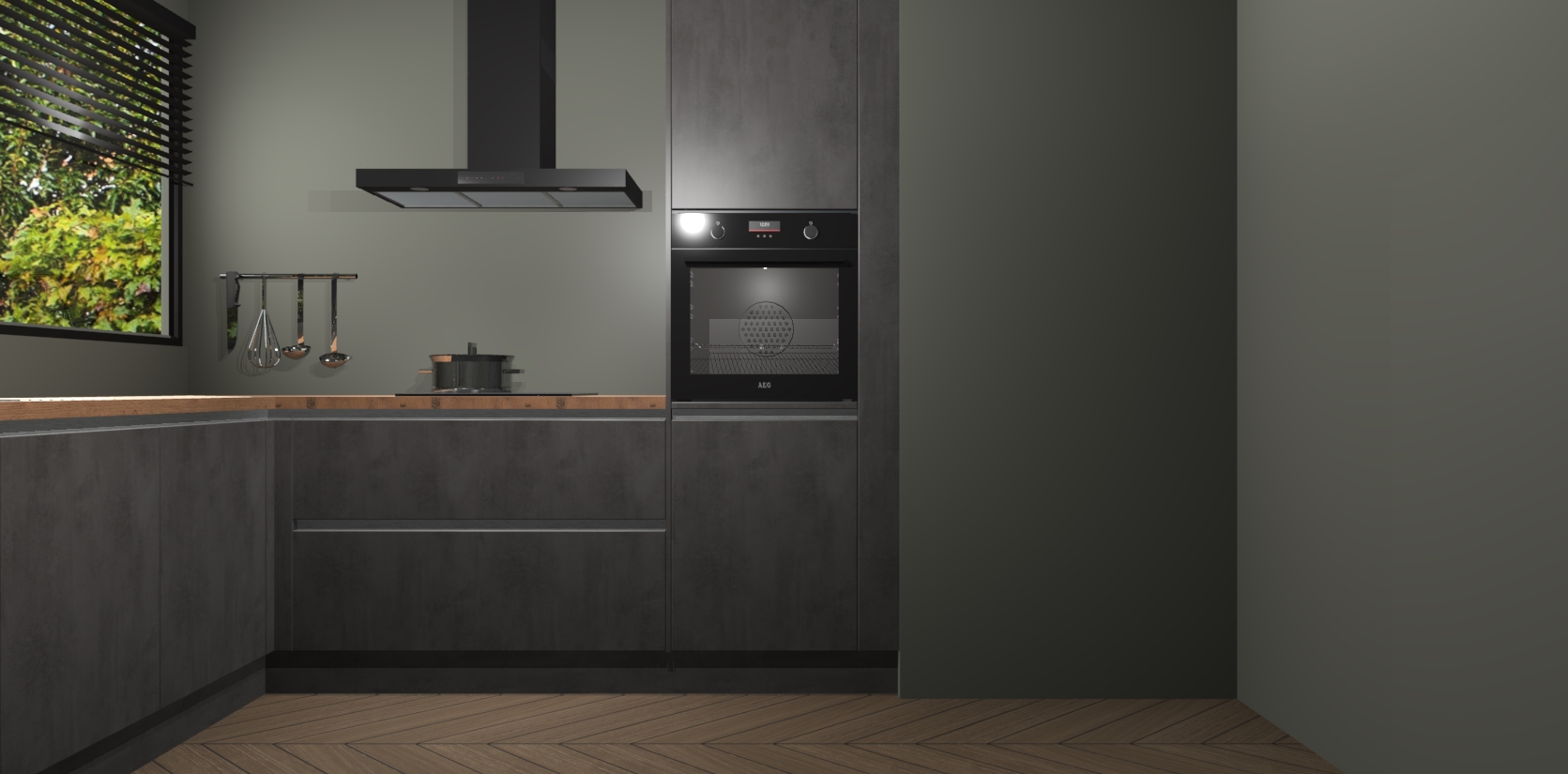 Met een modern, tijdloos design en ruime opslagruimte, zult u zich in no-time thuis voelen in uw nieuwe keuken. Uw leven wordt eenvoudiger met de soft-close deuren die voor het ultieme stille comfort zorgen - geen geluid dat u stoort terwijl u kookt. Ook is de keuken voorzien van 5 ingebouwde apparaten: een oven, inductie kookplaat, afzuigkap, vaatwasser en koelkast. Deze kunnen gemakkelijk na bestelling worden bijgewerkt naar AEG - waardoor uw luxe ervaring compleet is.